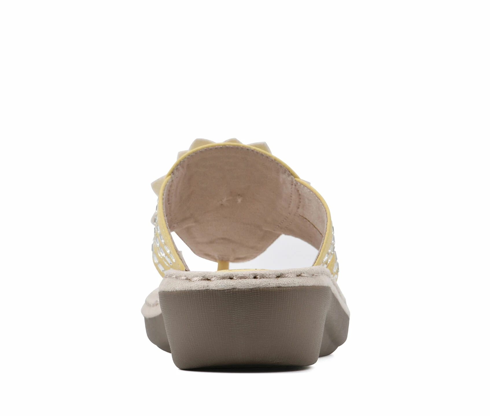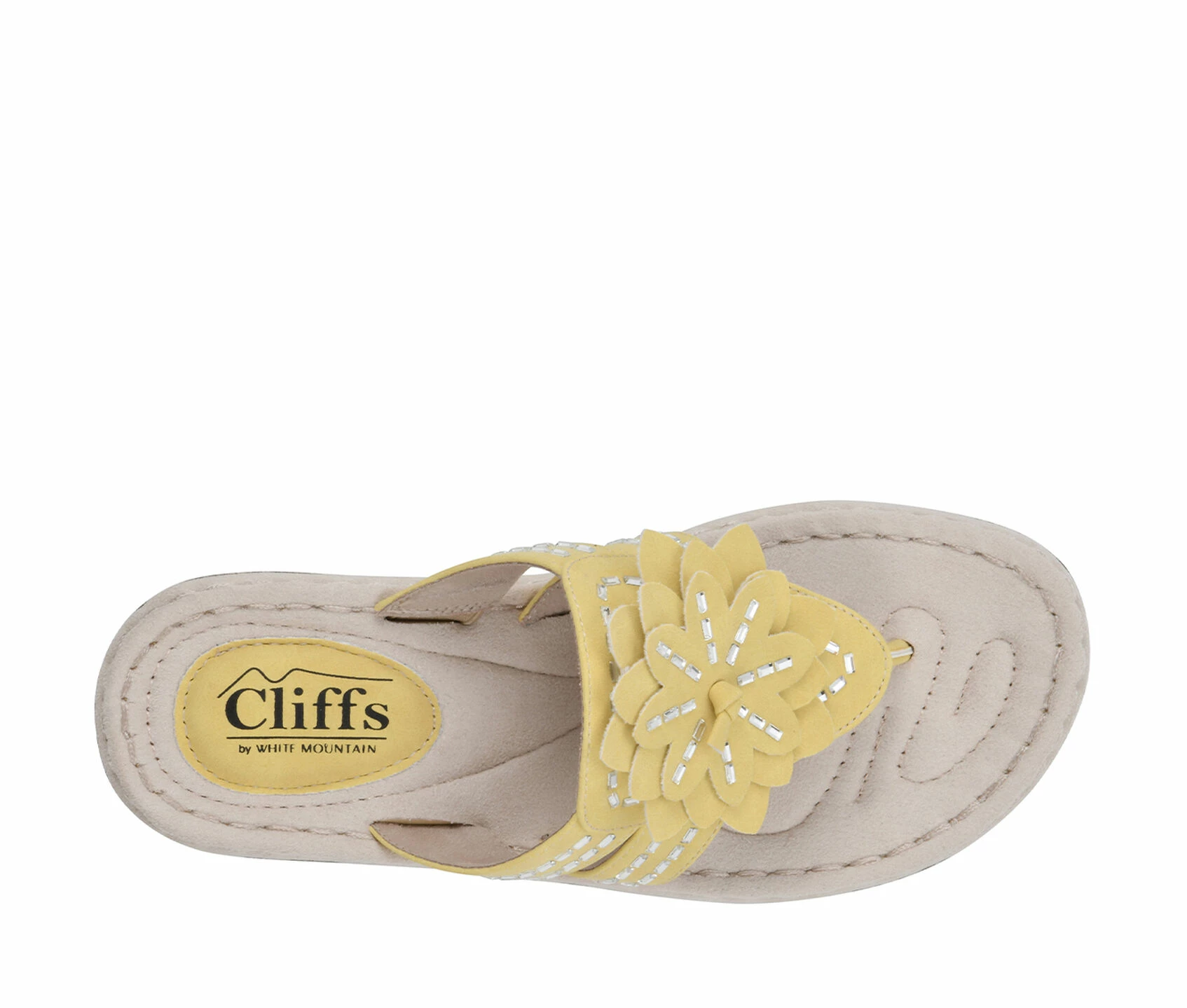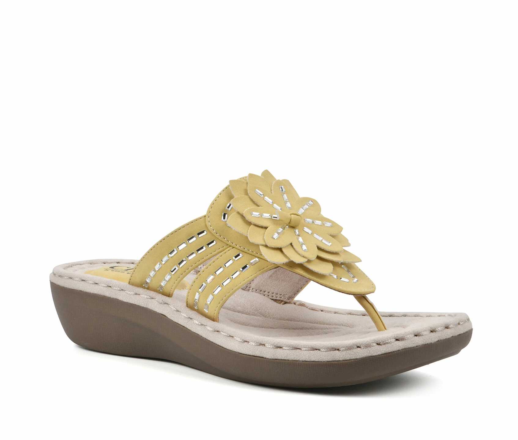 - These comfort thong sandals feature a wedge and an ornamental flower. Soft toe post. Contrast stitching.