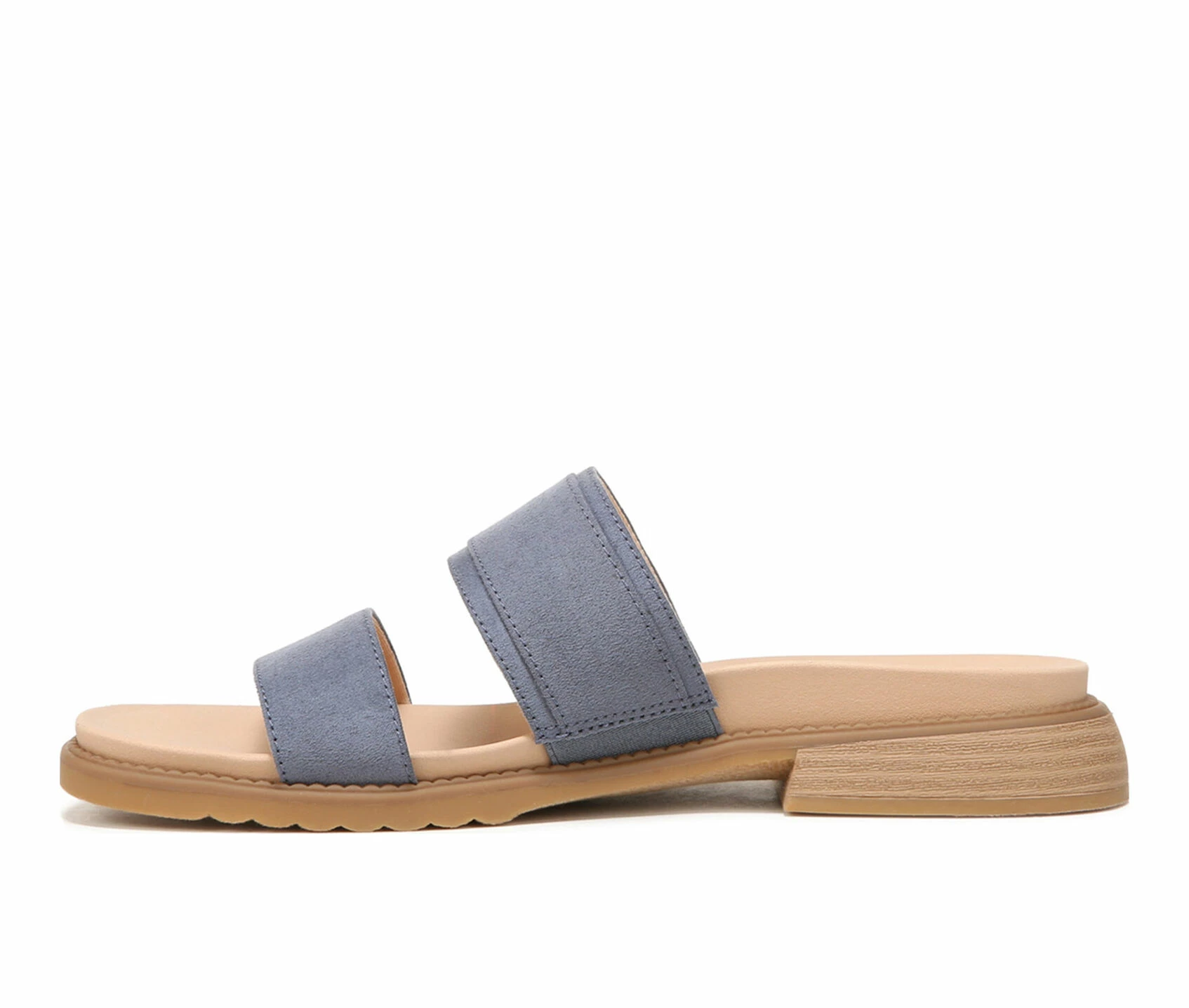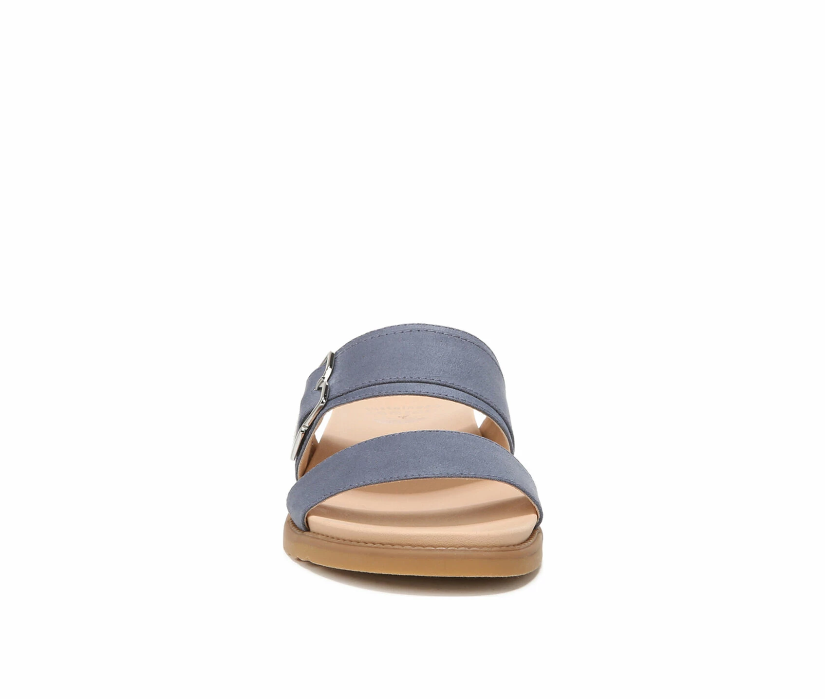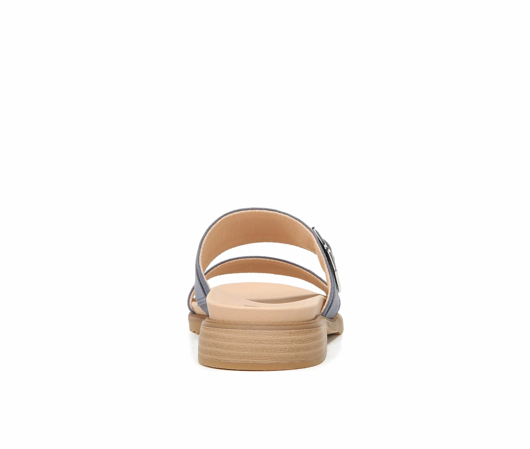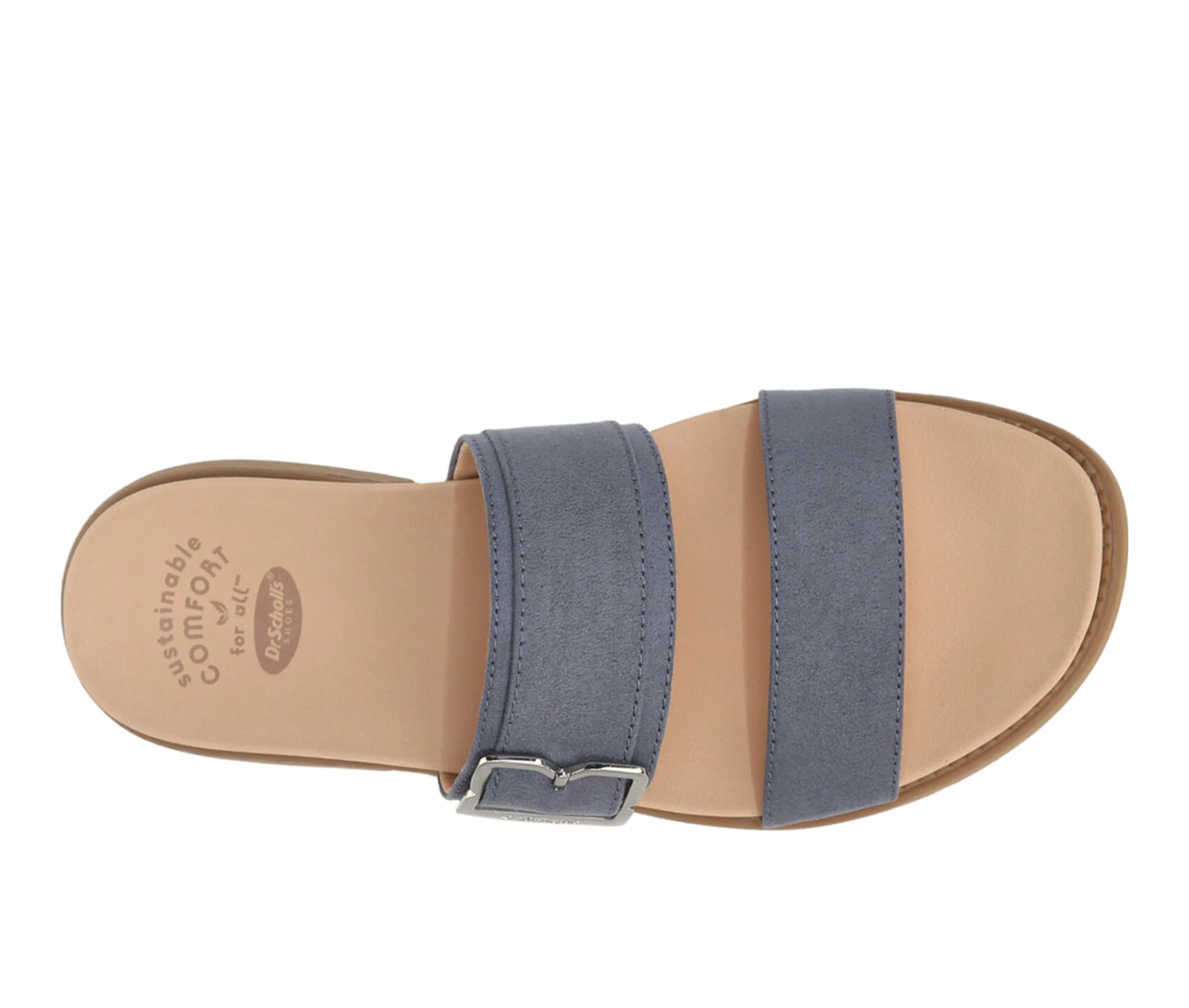 - Laidback womens sandals with iconic touches, perfect for every day. SUSTAINABLY CRAFTED: Linings partially made from recycled bottles, topcloth crafted with low-chemical faux leather. MATERIALS: ReFiber – Microfiber made from recycled plastic bottles. FIT: Slip-on fit for easy on/off. FEELS: Insole Technology with anatomical cushioning, comfort & support. MOVEMENT: Lightweight, flexible construction moves with you. STYLE: Casual sandals for women with double-band design, cushioned footbed, iconic Dr. Scholl’s metallic buckle, and 1 1/3 inch sole. CONSCIOUSLY PACKAGED: This style is shipped in a box made with recyclable materials & soy-based inks. Step out and feel the cushion in these womens slide sandals with all-over comfort and breezy design.