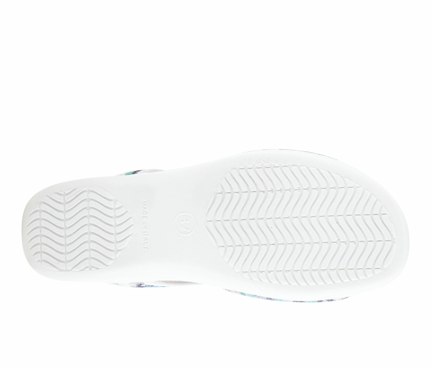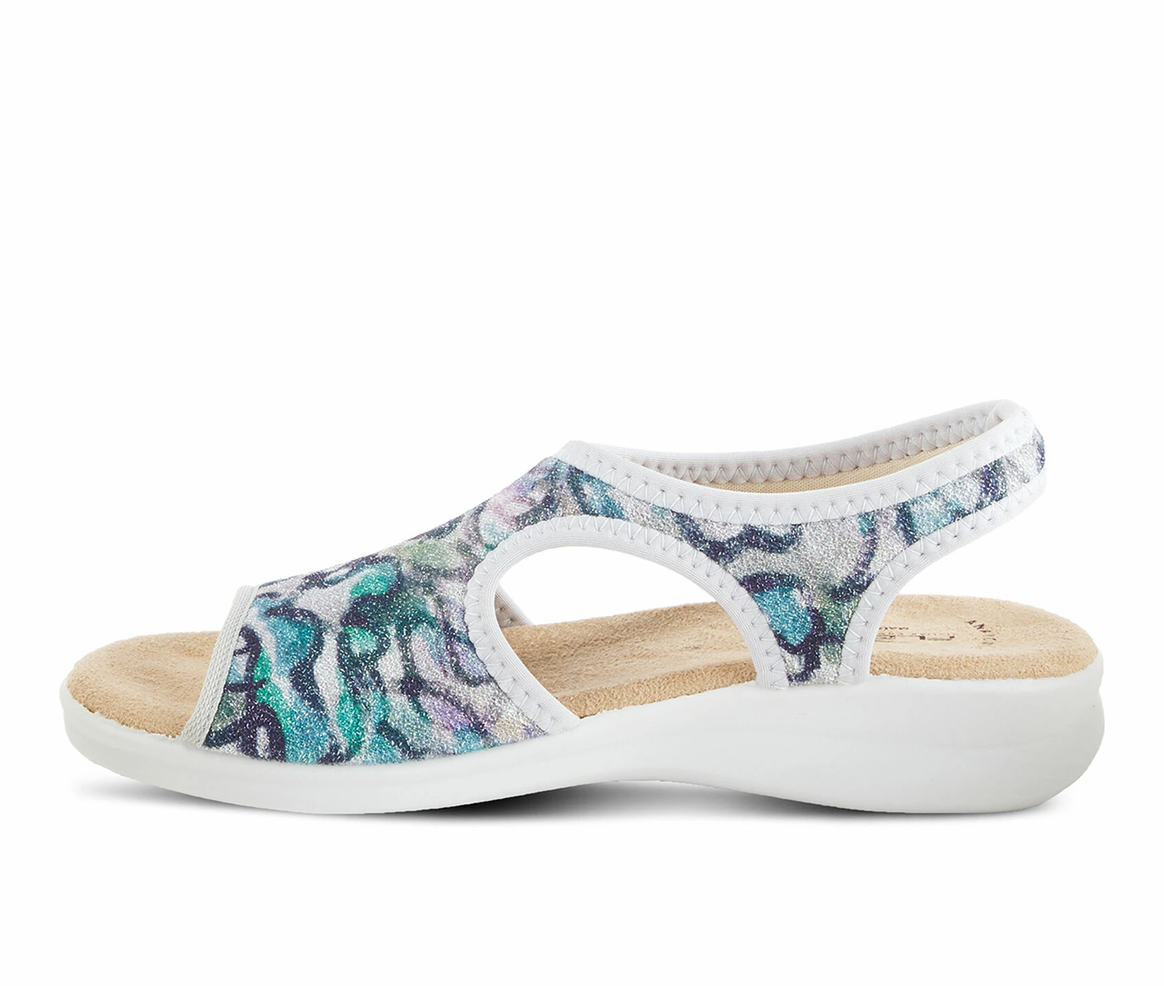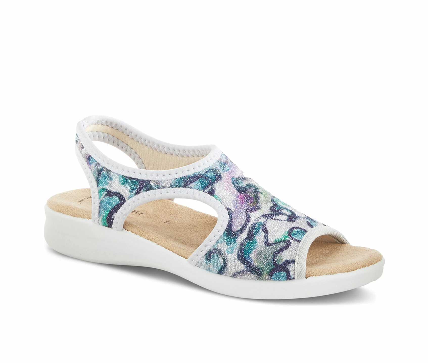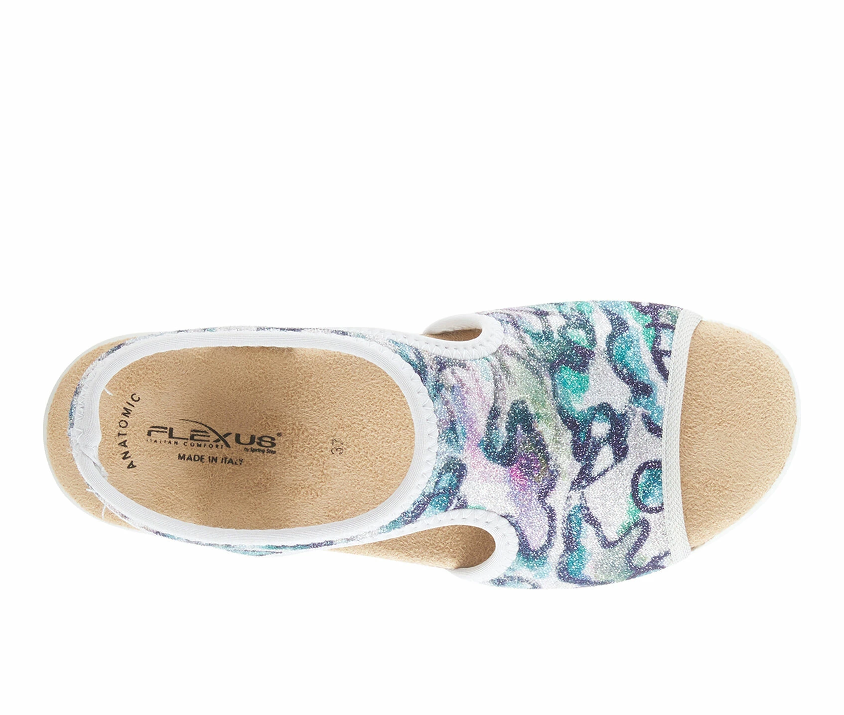 An Italian sling back sandal featuring lycra stretch upper and back strap with a multicolor swirl print design, all on a comfort padded anatomical footbed and flexible, anti-shock wedge sole for superior comfort.