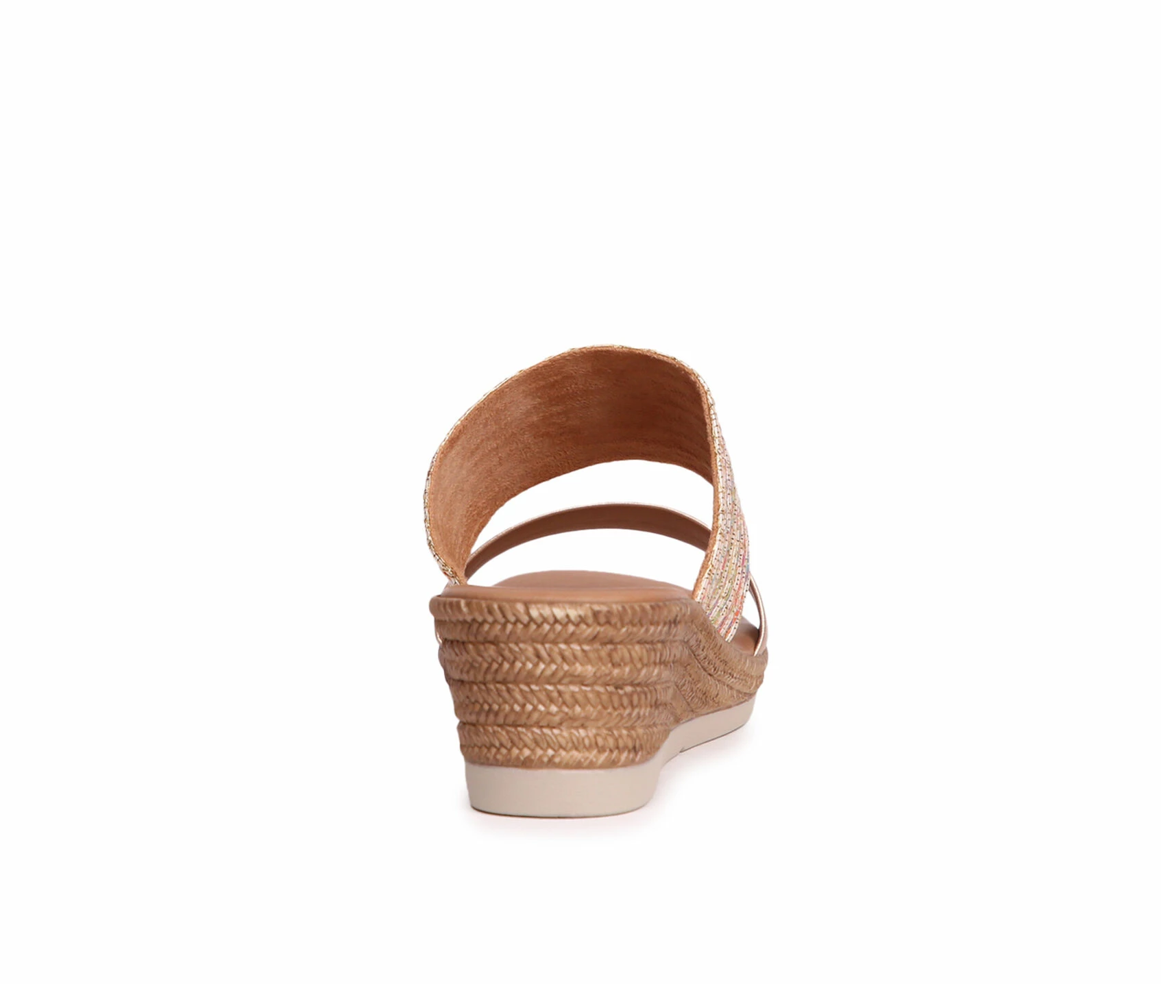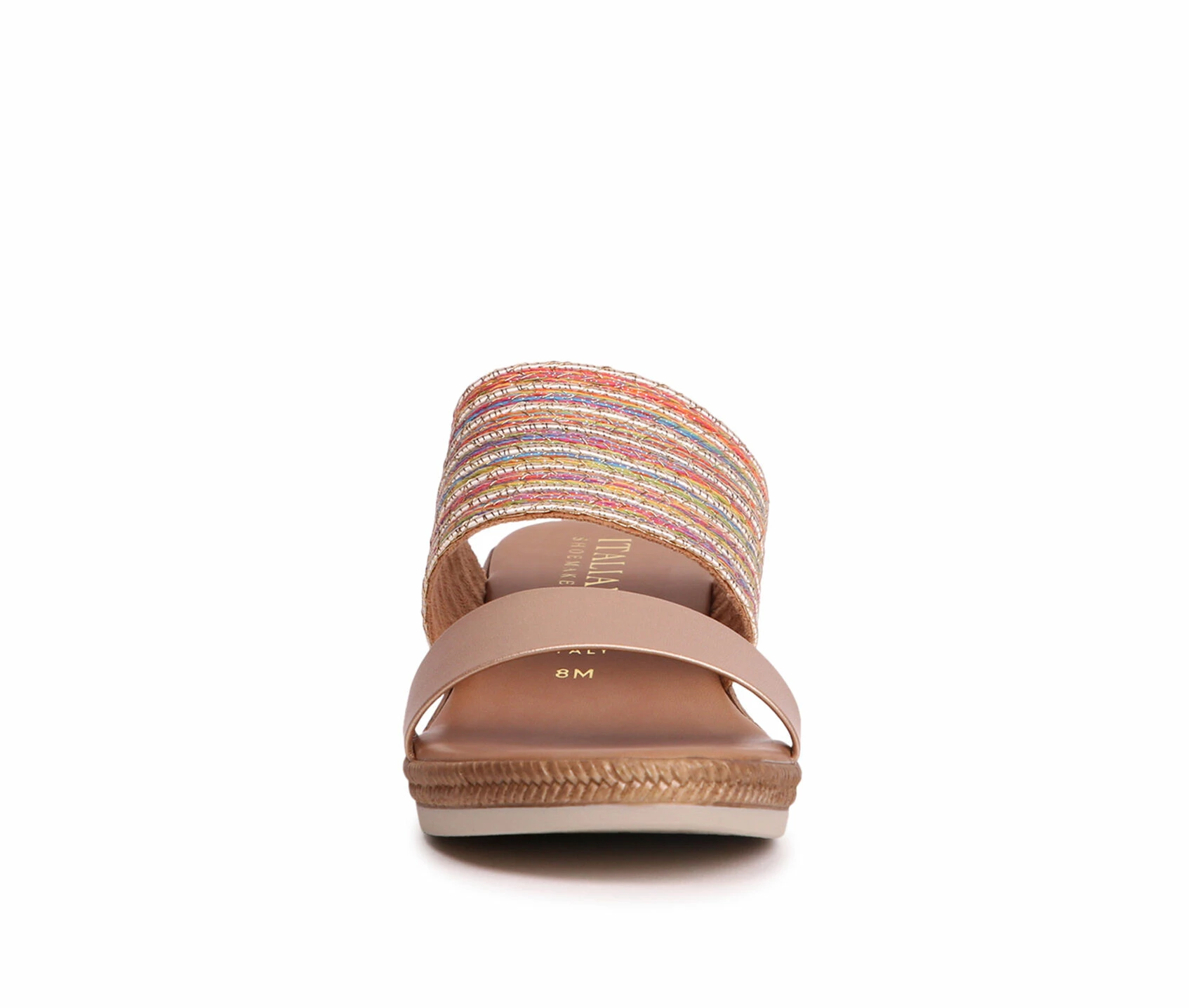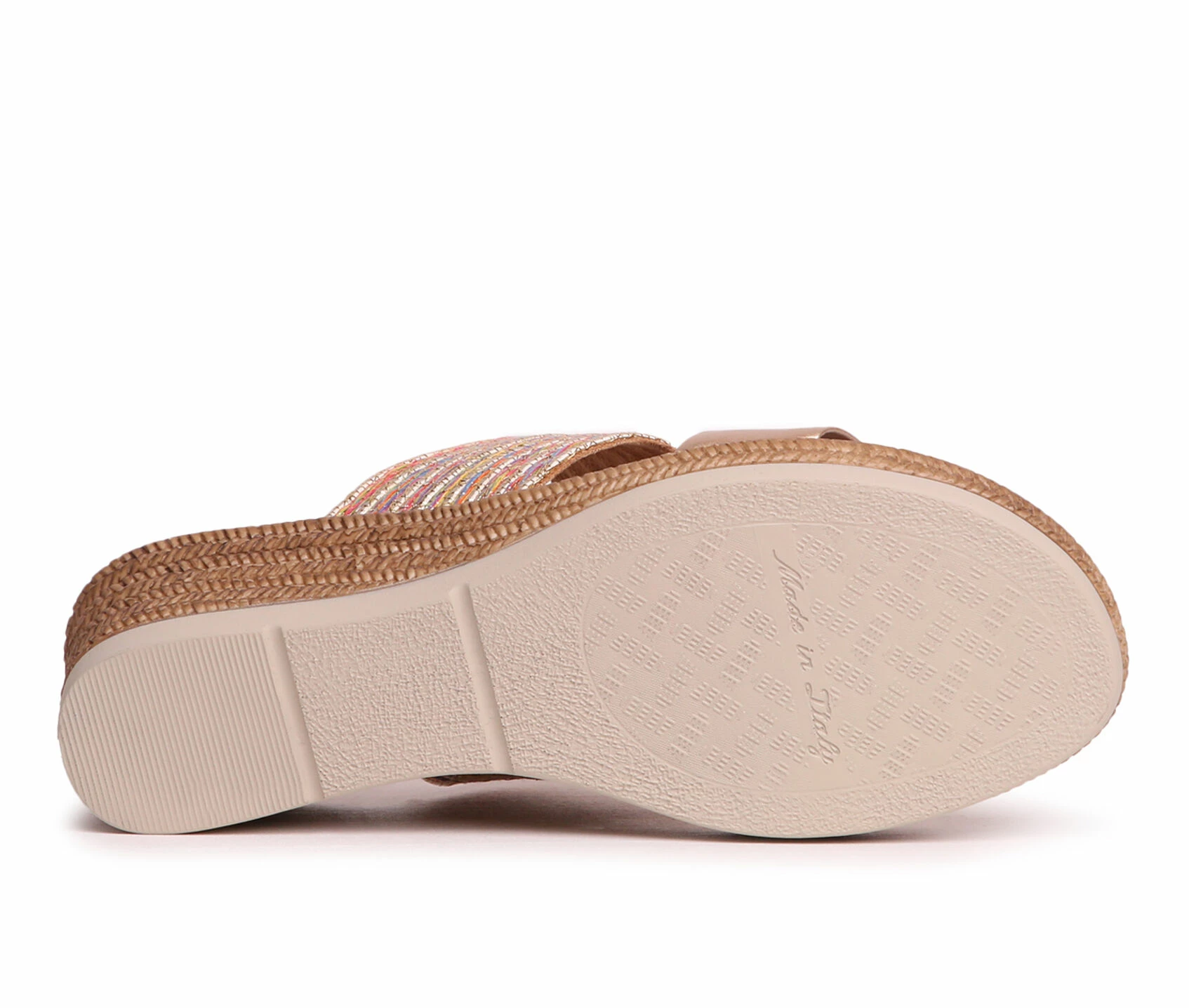 - The upper uses a multi color raffia ribbon strap that pairs perfectly with flowy dresses. The Teri has 1/2″ platform with a 2 1/4″ heel total heel height on a white sole.