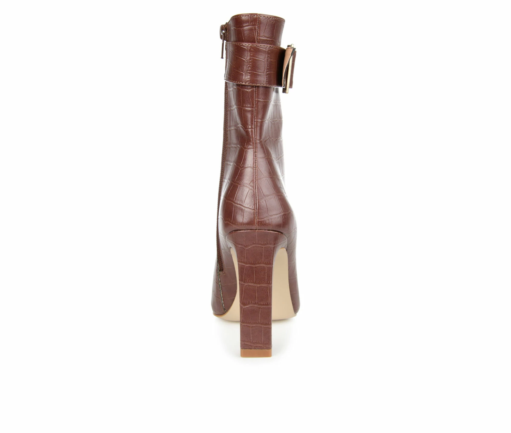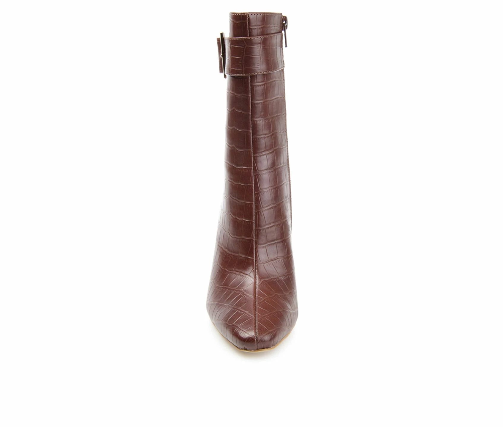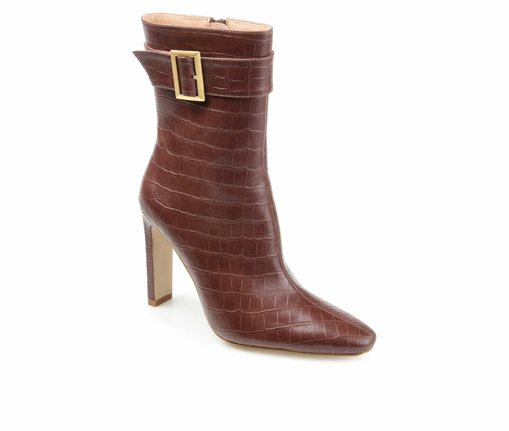 - A shapely ankle bootie that is sure to turn heads! It could only be the Elanie by Journee Collection. This croc textured vegan leather silhouette is styled with square-toe and a buckled ankle strap for an upscale look