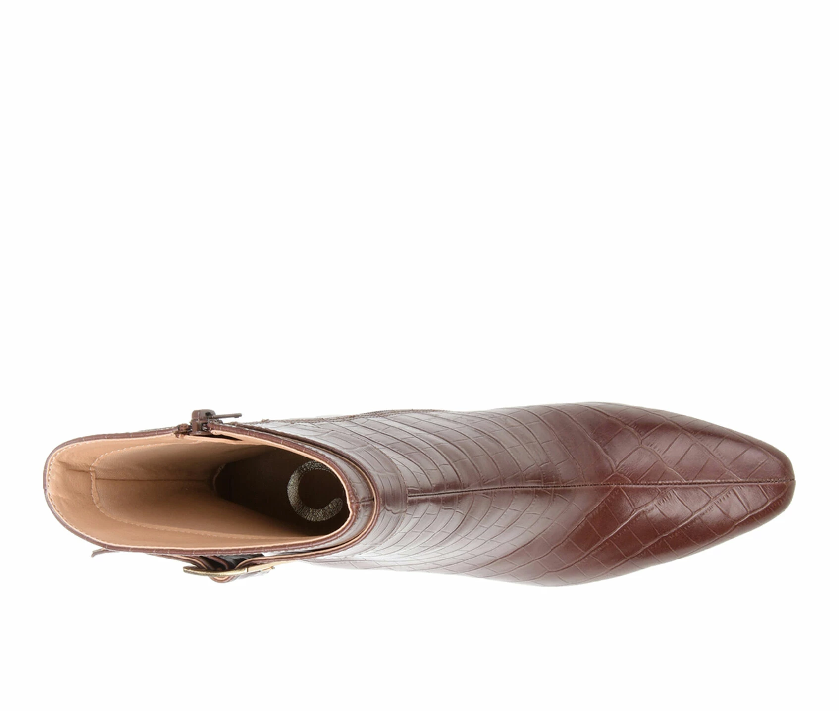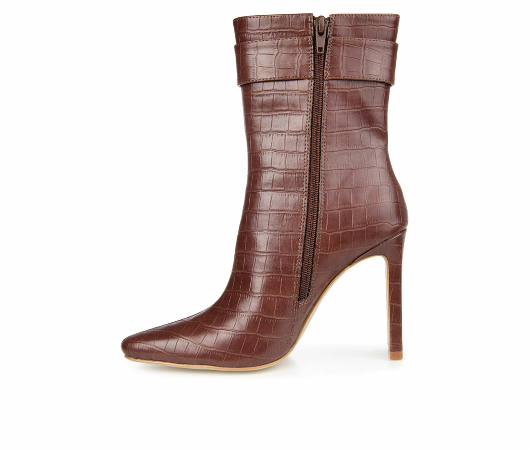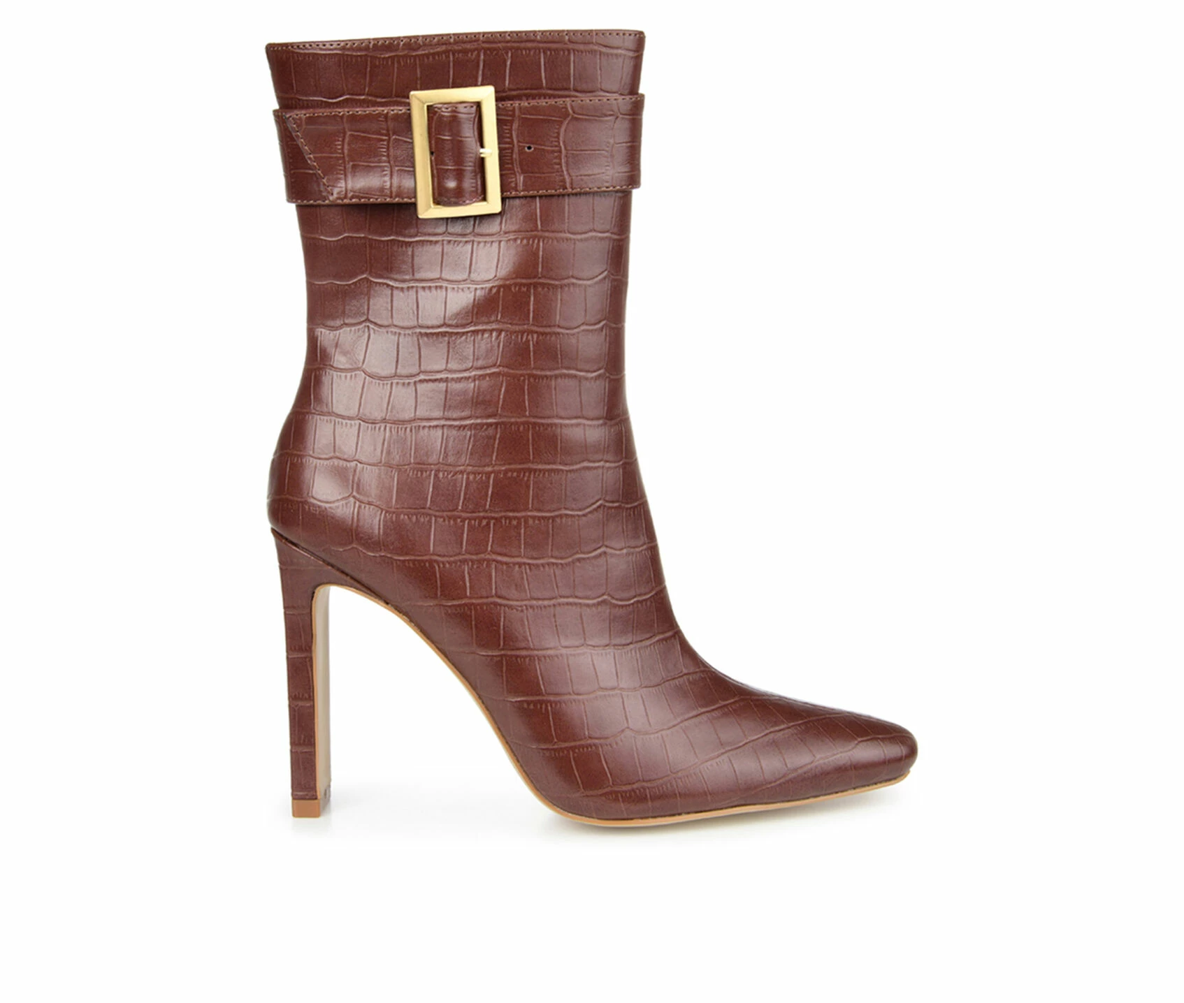 - A shapely ankle bootie that is sure to turn heads! It could only be the Elanie by Journee Collection. This croc textured vegan leather silhouette is styled with square-toe and a buckled ankle strap for an upscale look