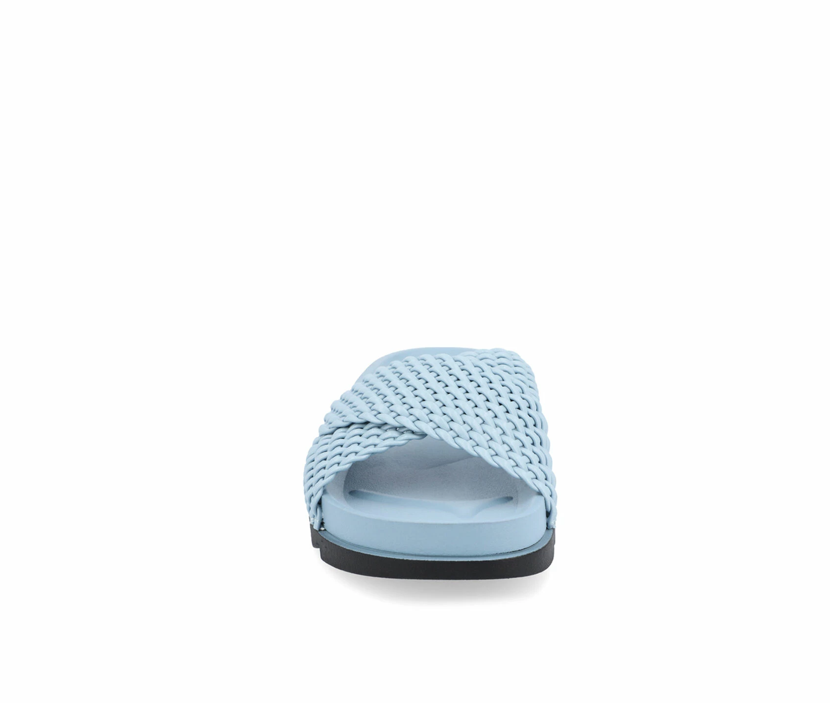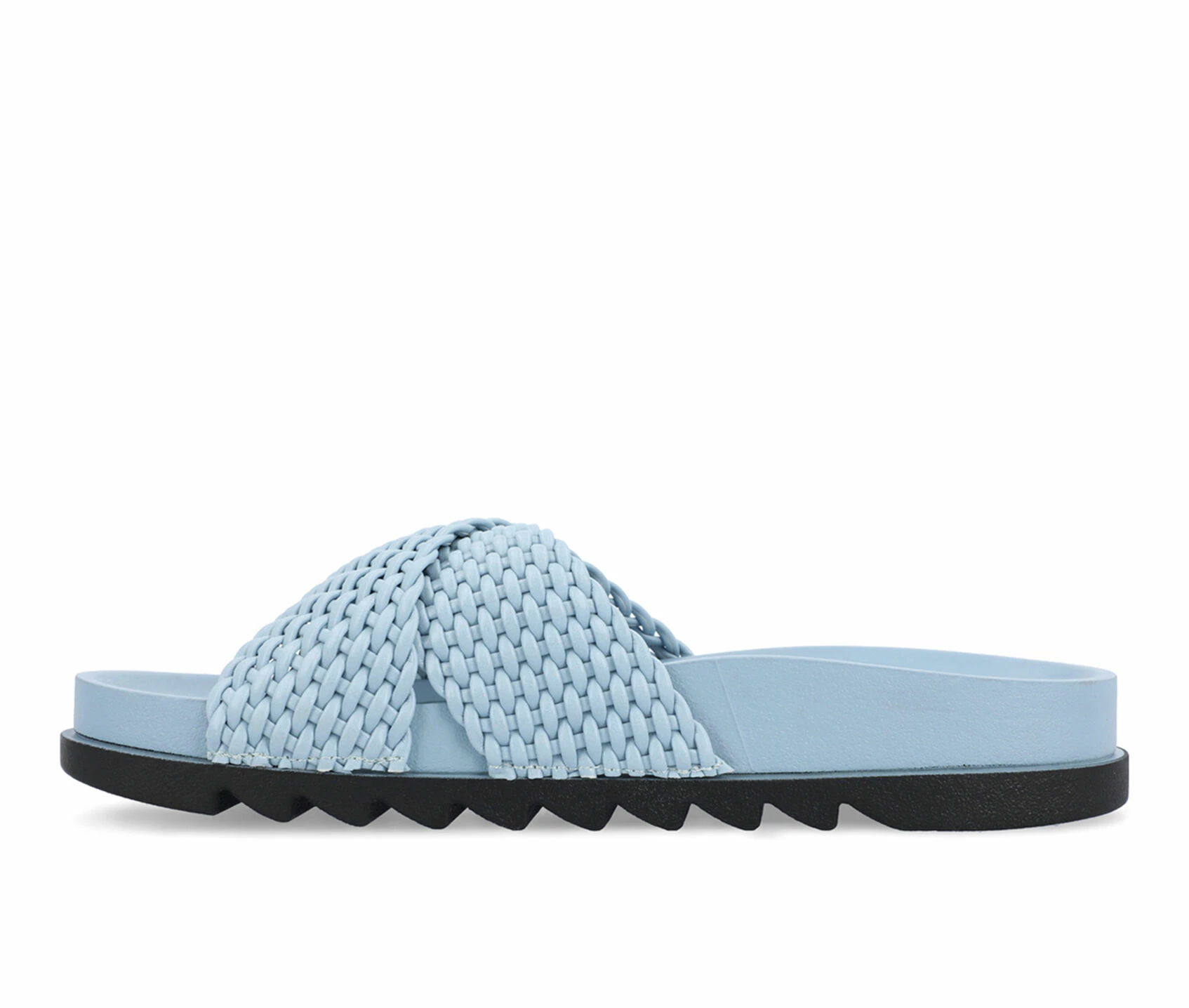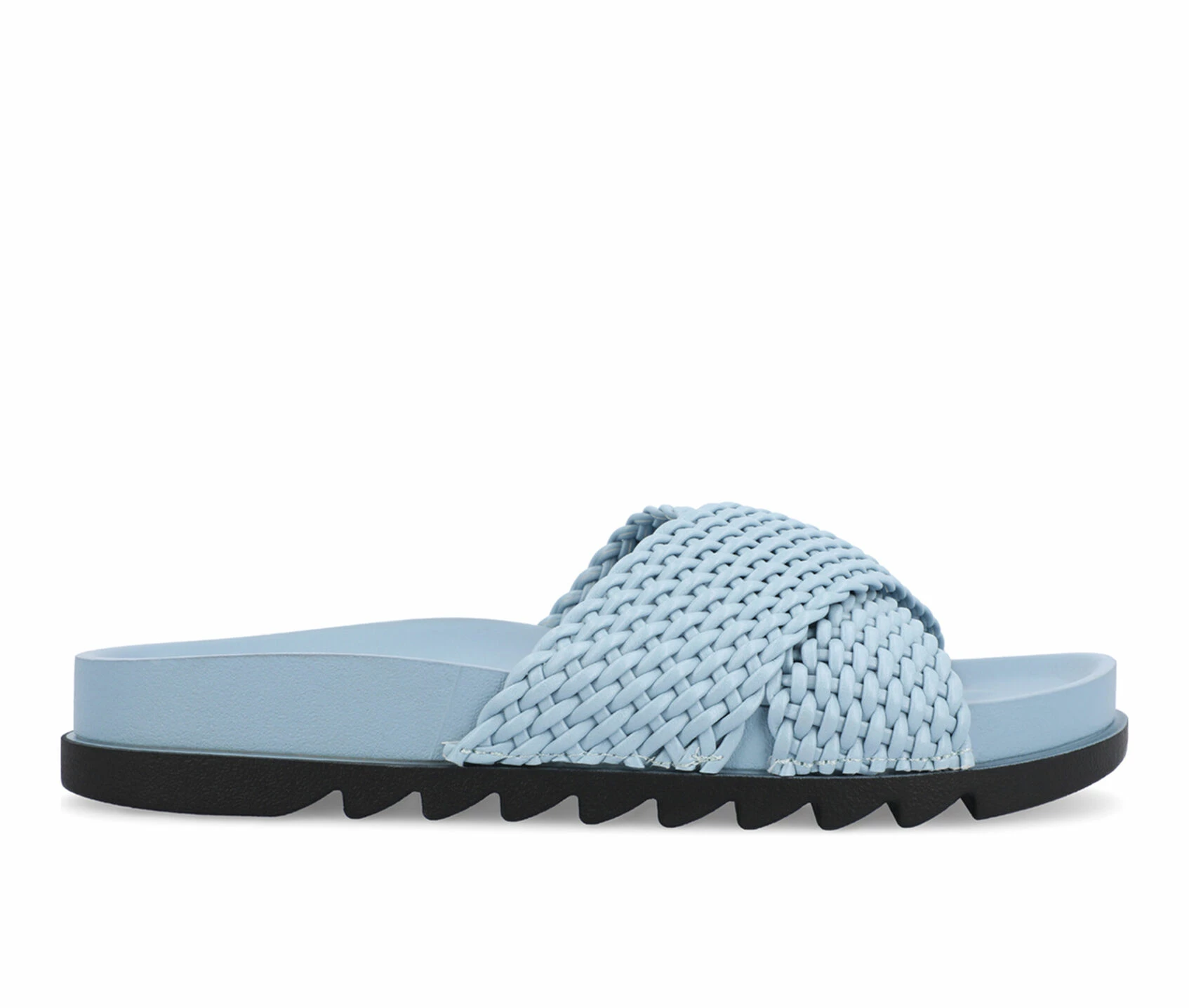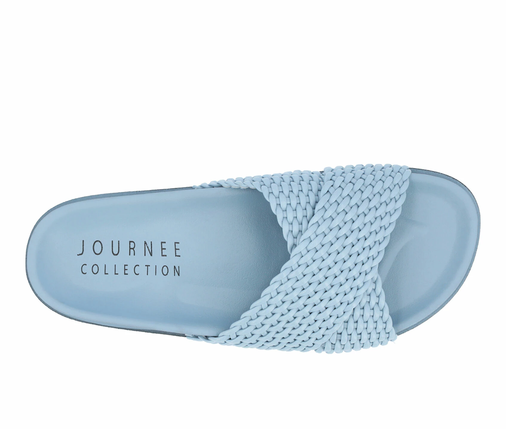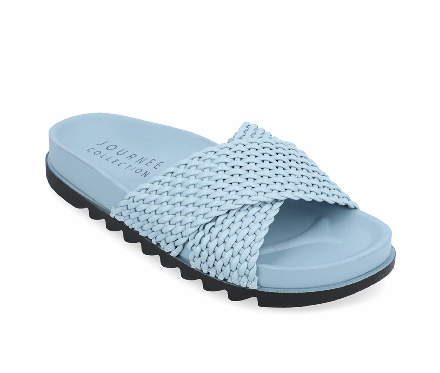 - The Gretie platform sandal from Journee Collection will have you walking the streets in comfort with their padded footbed and flexible treated outsole. Their luxe vegan leather, woven pattern design, crisscross band, open round toe, and formed footbed will give you all the style you could dream of. This style really is perfect for when you need a grab-and-go shoe, thanks to the slip-on design.