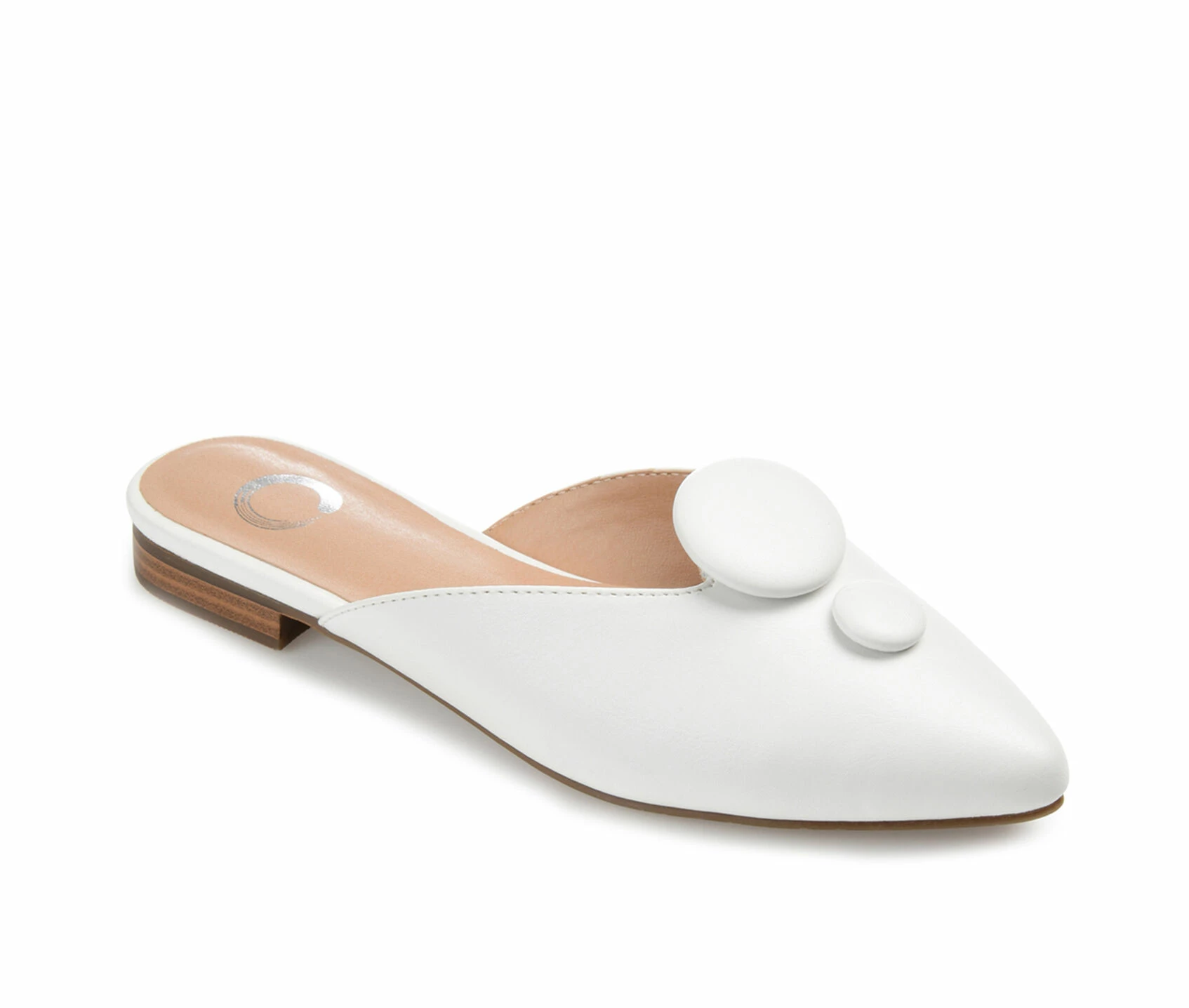 - It’s all in the details with the Mallorie by Journee Collection. This pointed-toe mule is embellished with covered button accents and a v-shaped topline. Smooth vegan leather shapes the silhouette, and a tiny stacked heel grounds the look.