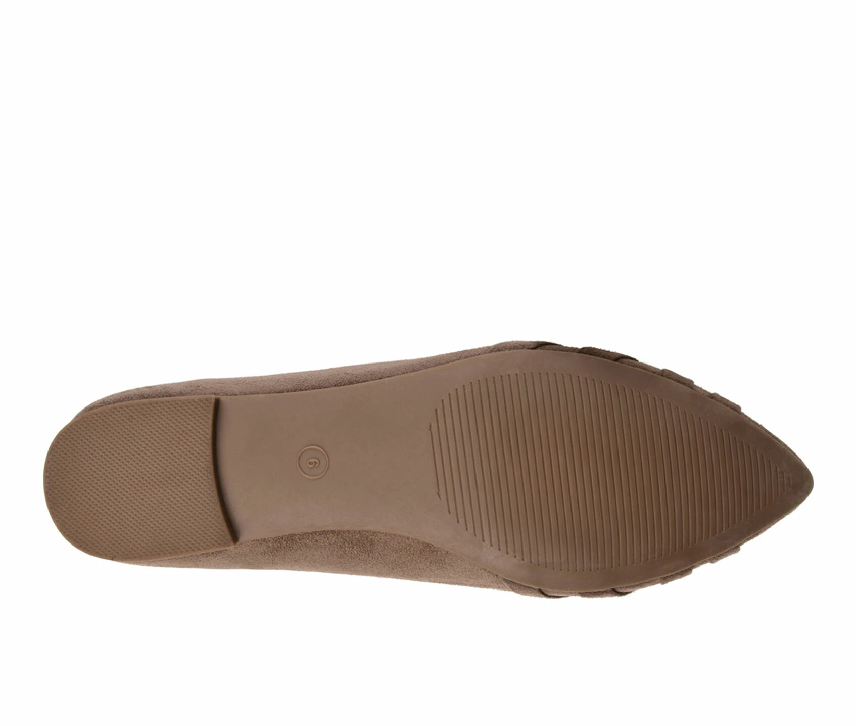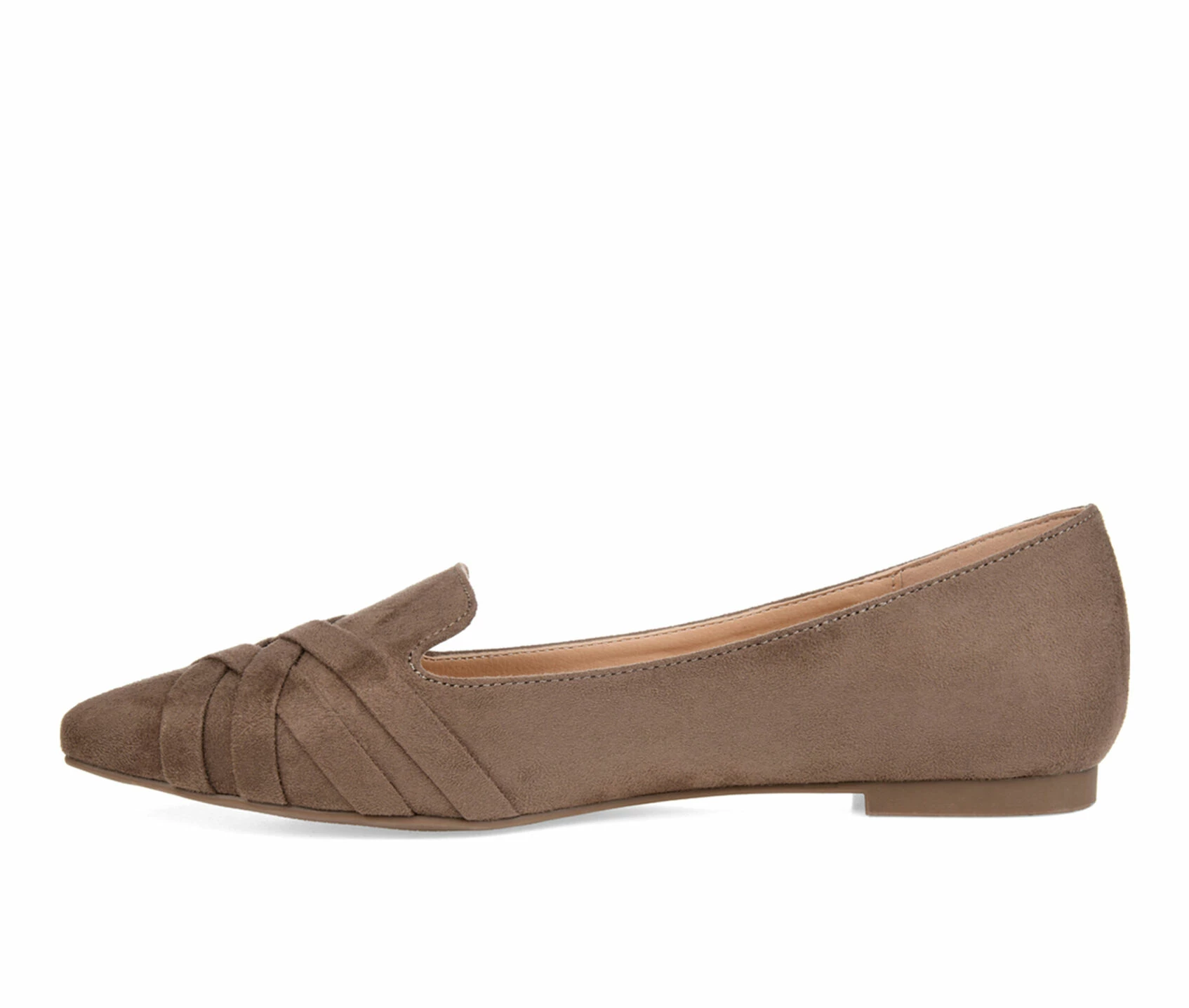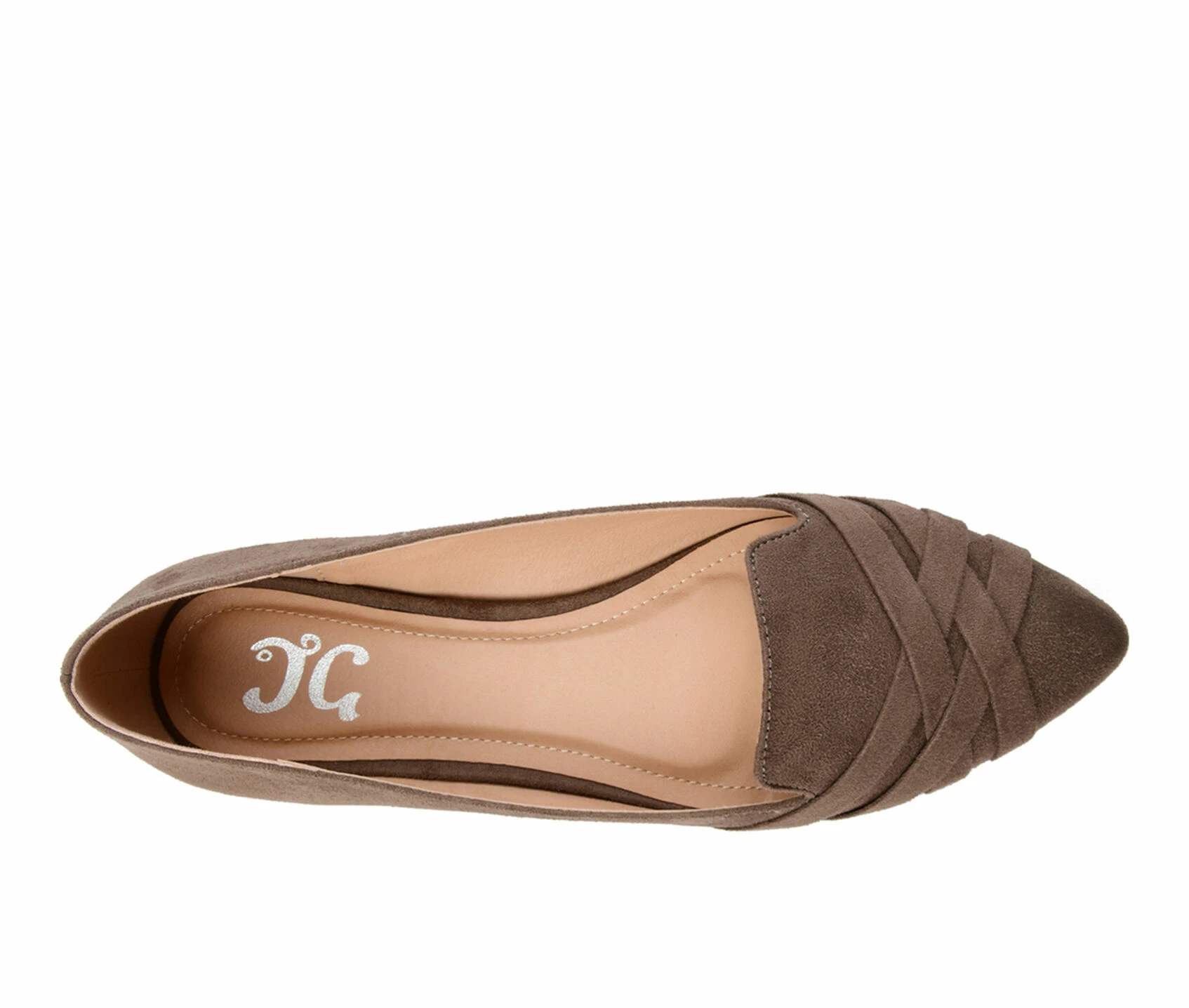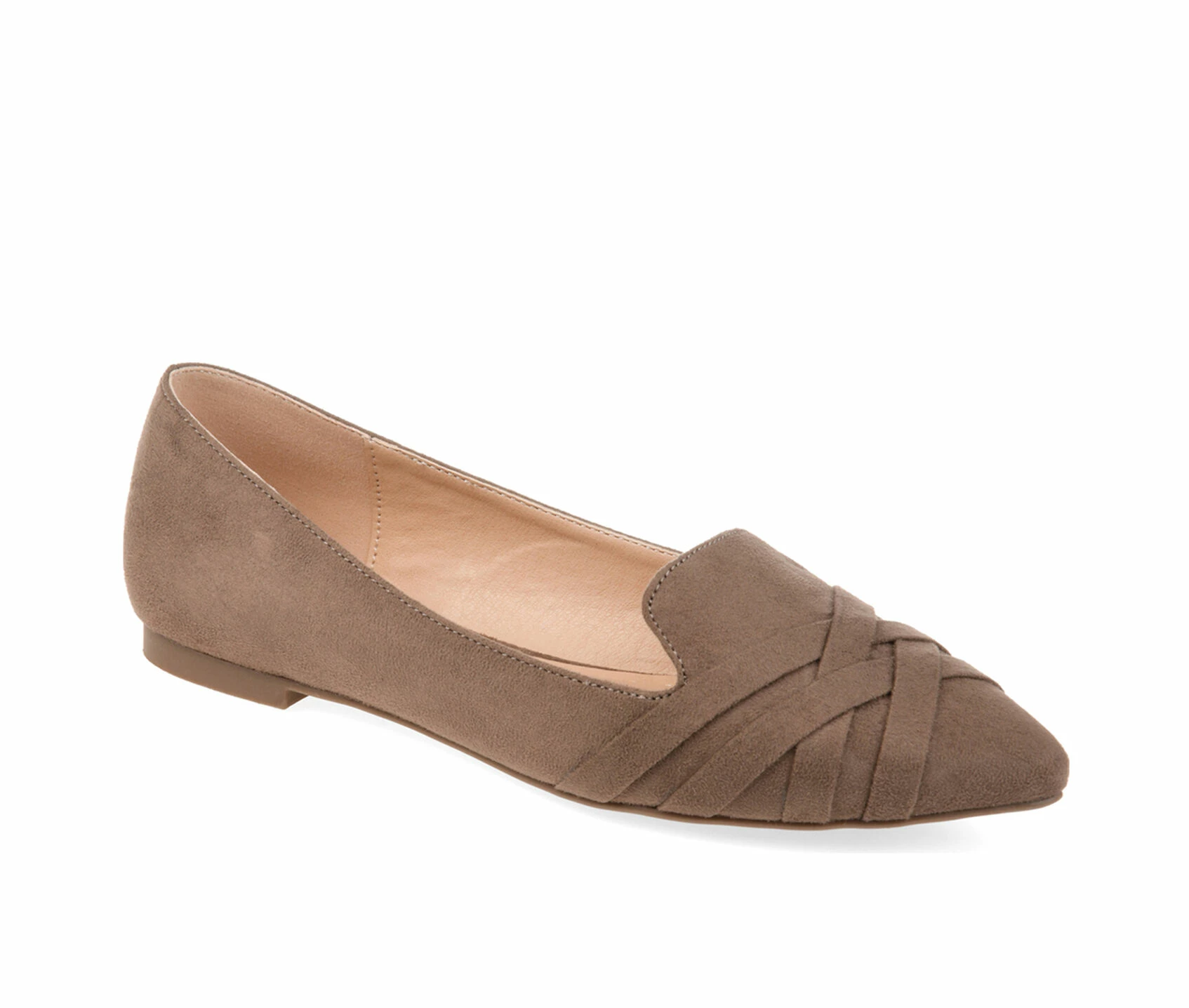 - Step into a new style with the Mindee flat by Journee Collection. This shoe features faux suede material and has the perfect amount of stretch to it. The faux suede blend of the criss-cross pattern highlights this design, and the pointed toe adds the perfect touch.