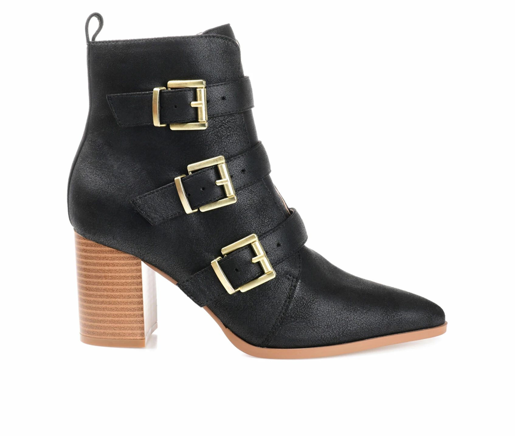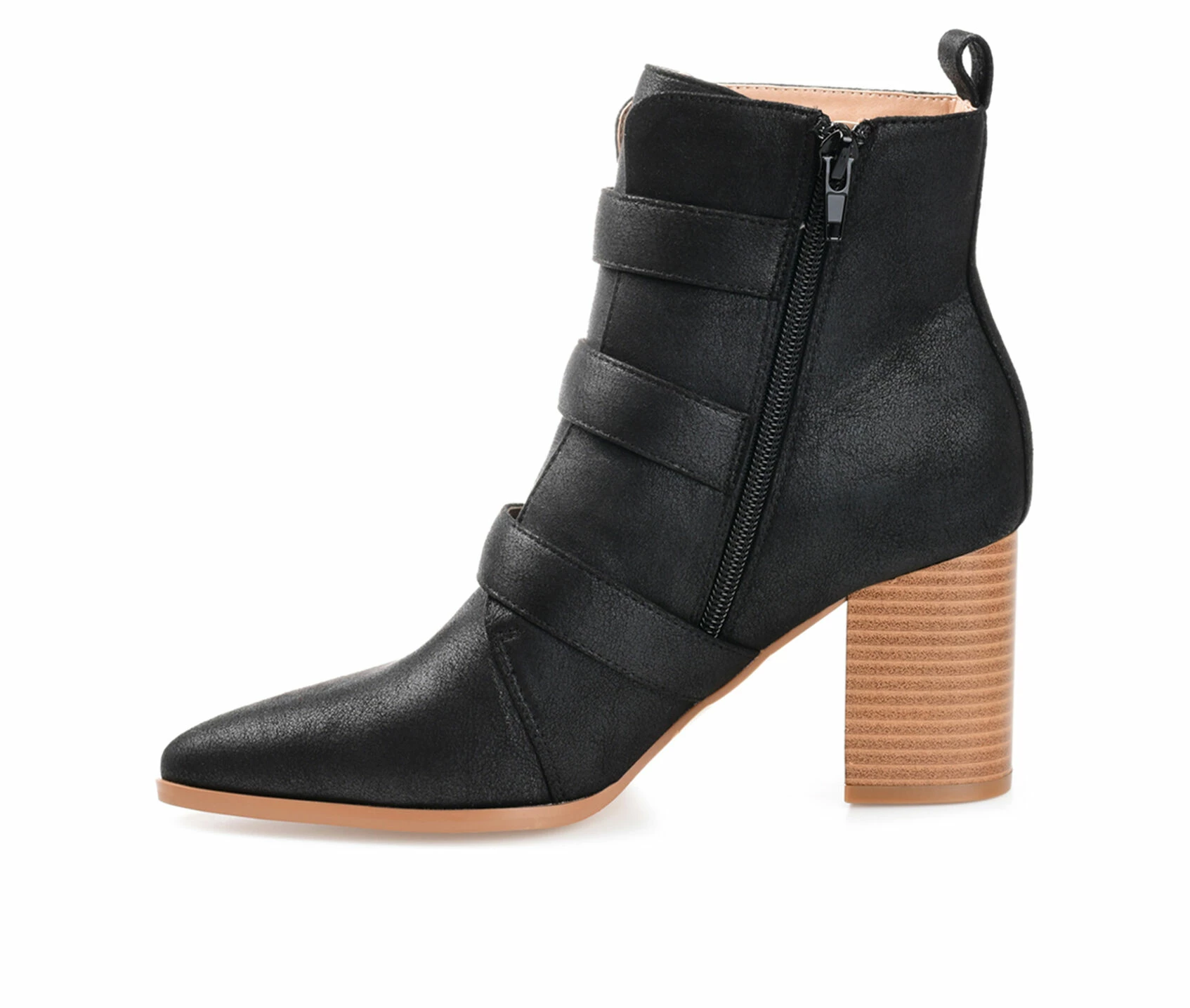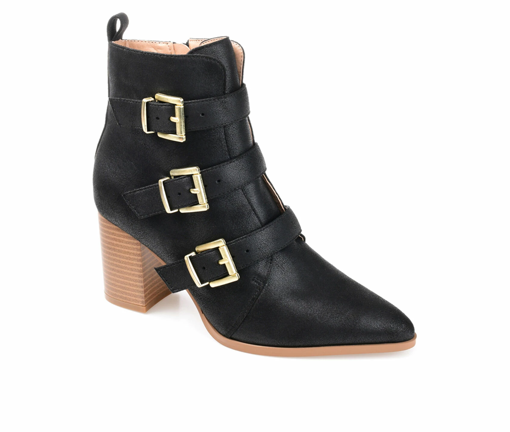 - You need something new to spice up your look, but what? Well, what about a classic bootie reimagined with triple buckle strap? The Winsley by Journee Collection is a pointed-toe silhouette featuring soft vegan leather detailed with an inside zipper and a tab at the ankle for easy entry. A chunky block heel adds the perfect amount of height, and a 4 mm Tru Comfort Foamâ„¢ insole offers unwavering support.
