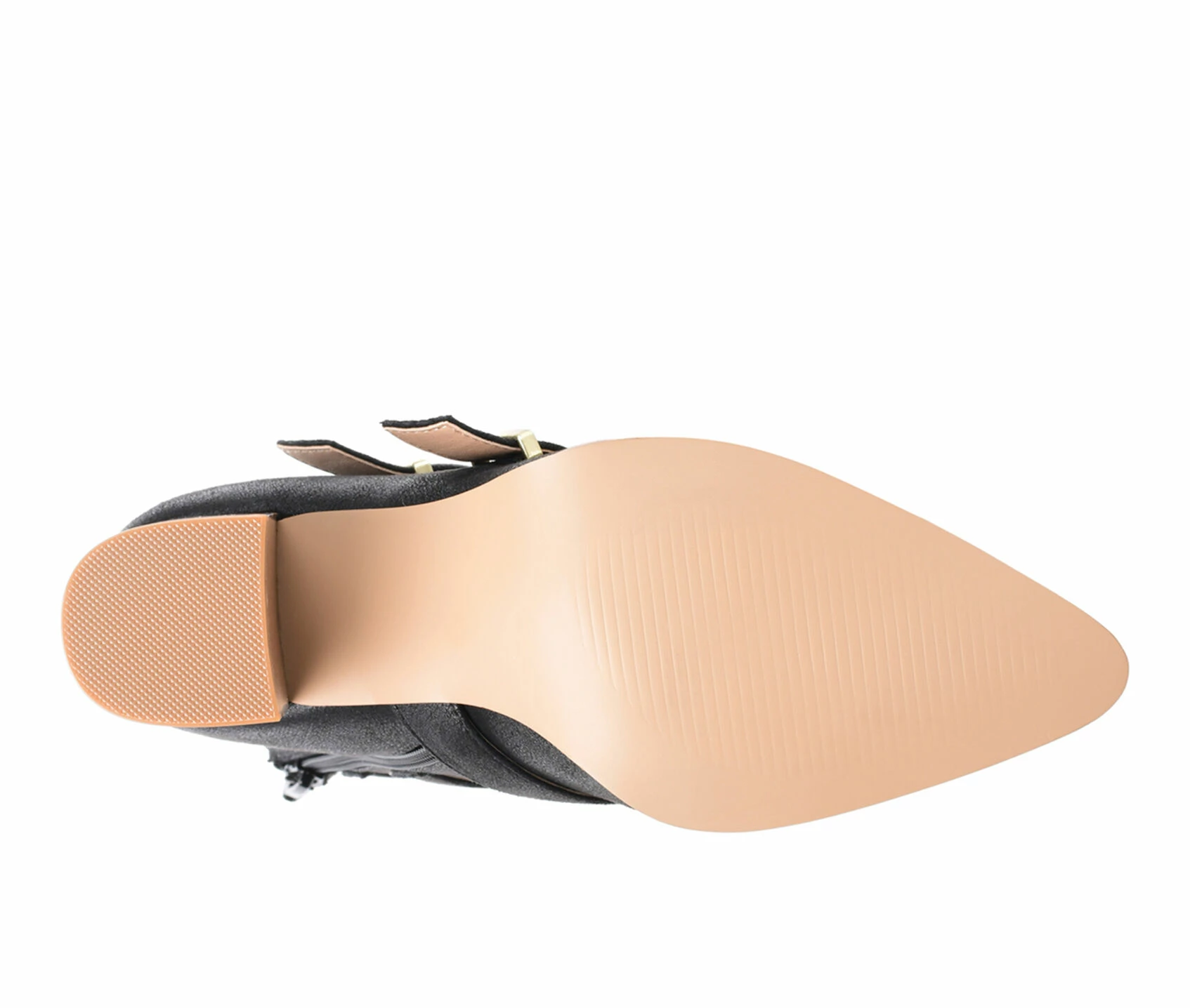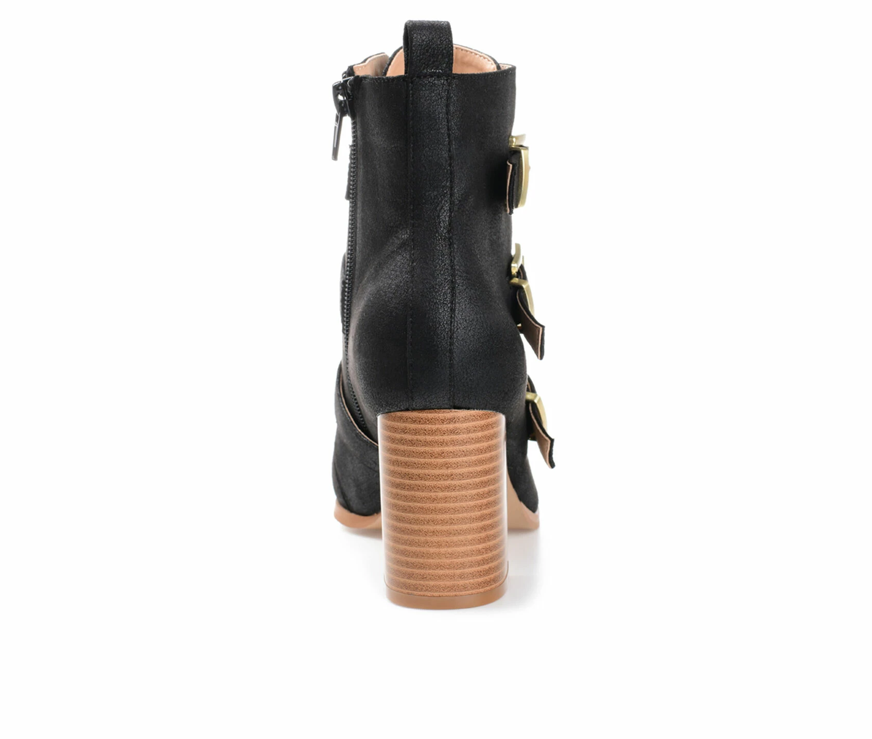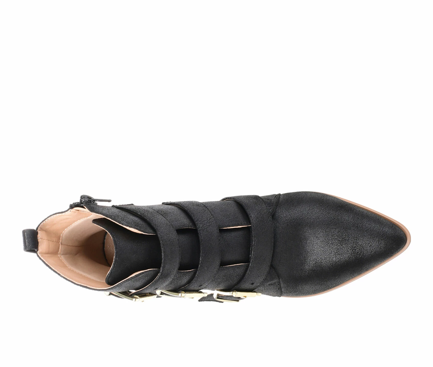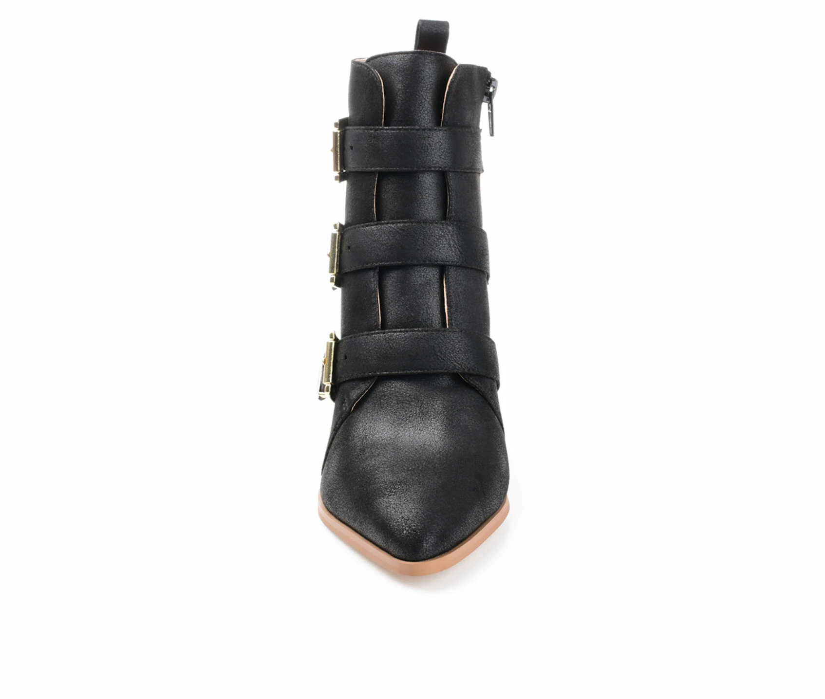 - You need something new to spice up your look, but what? Well, what about a classic bootie reimagined with triple buckle strap? The Winsley by Journee Collection is a pointed-toe silhouette featuring soft vegan leather detailed with an inside zipper and a tab at the ankle for easy entry. A chunky block heel adds the perfect amount of height, and a 4 mm Tru Comfort Foamâ„¢ insole offers unwavering support.