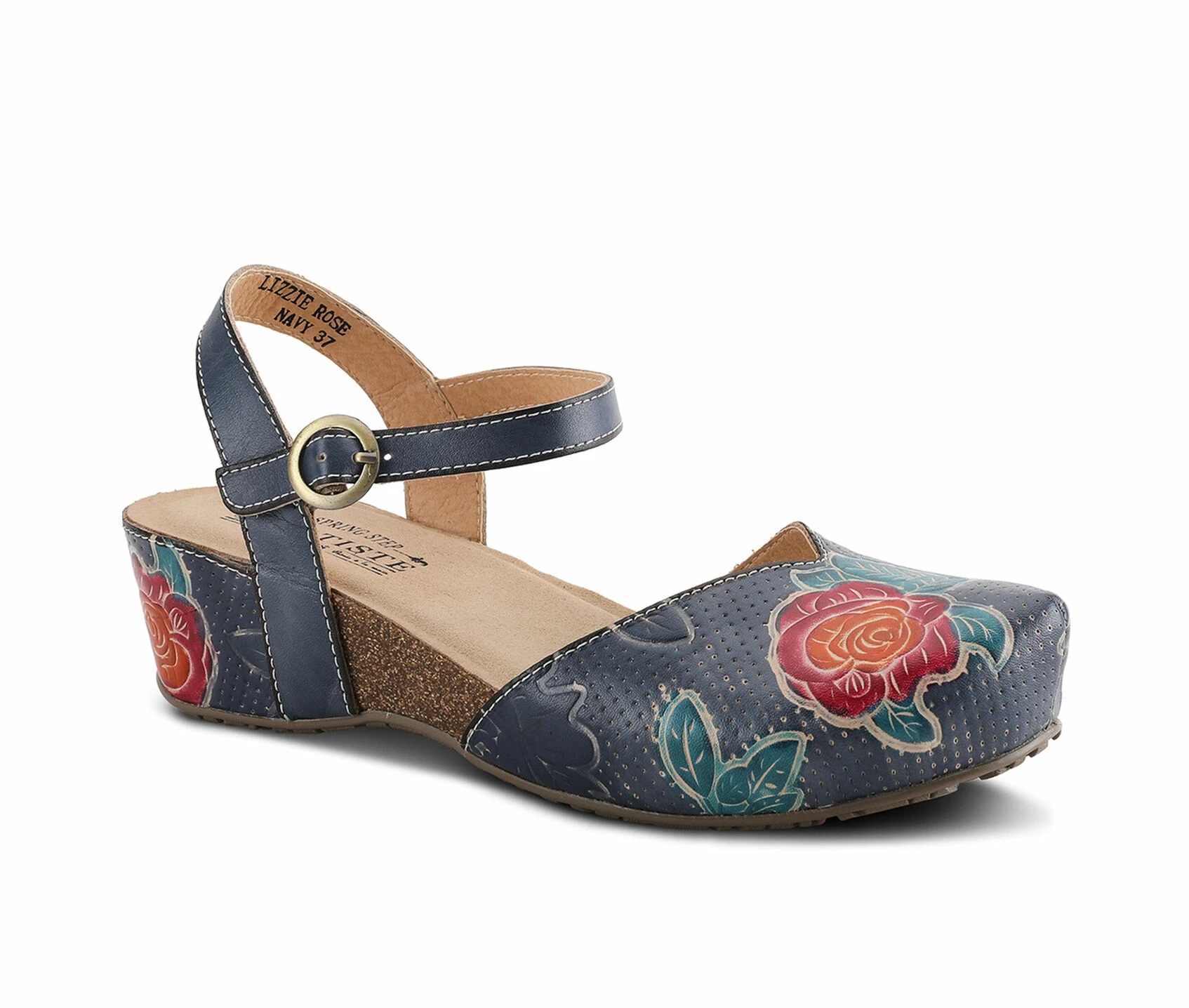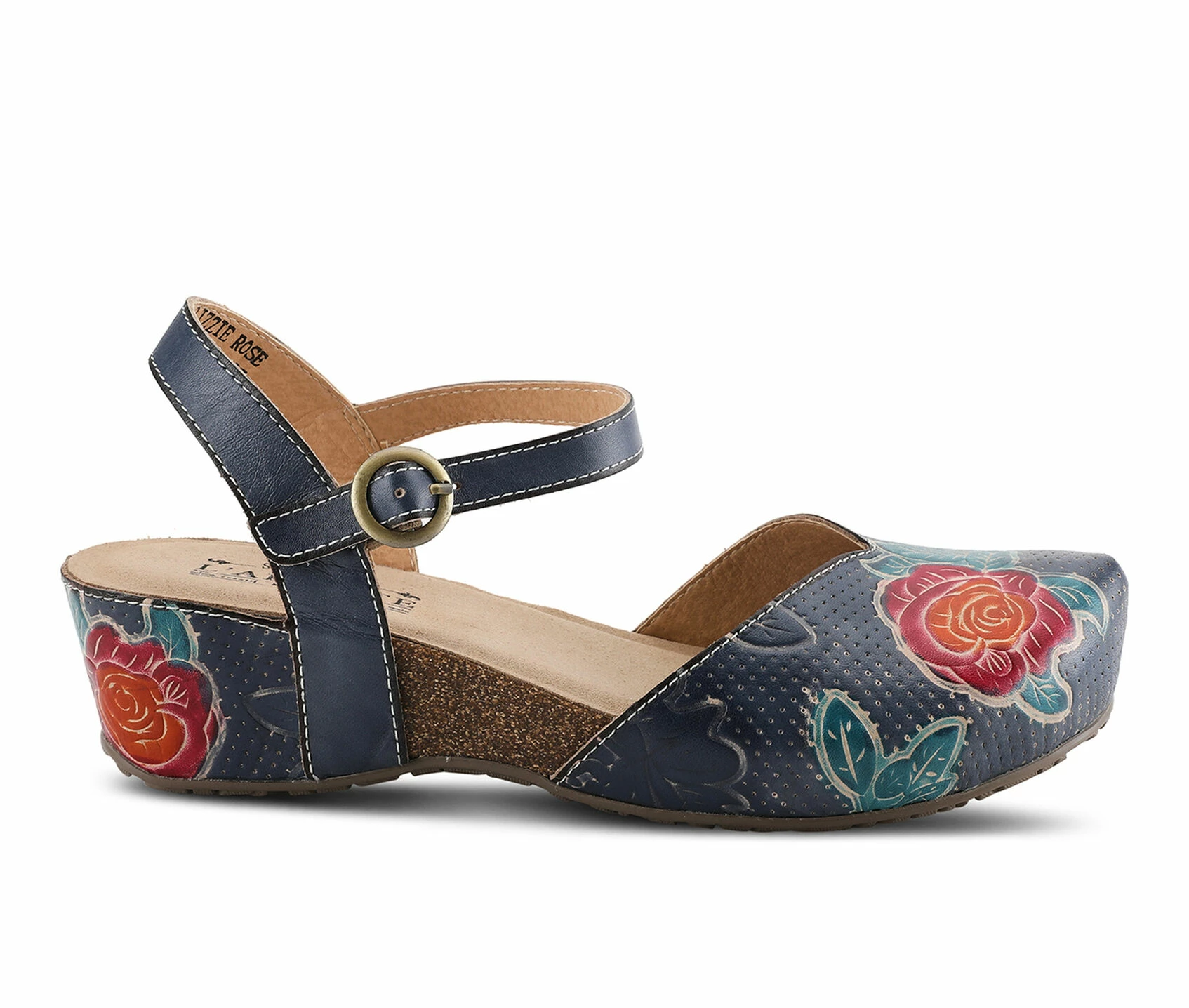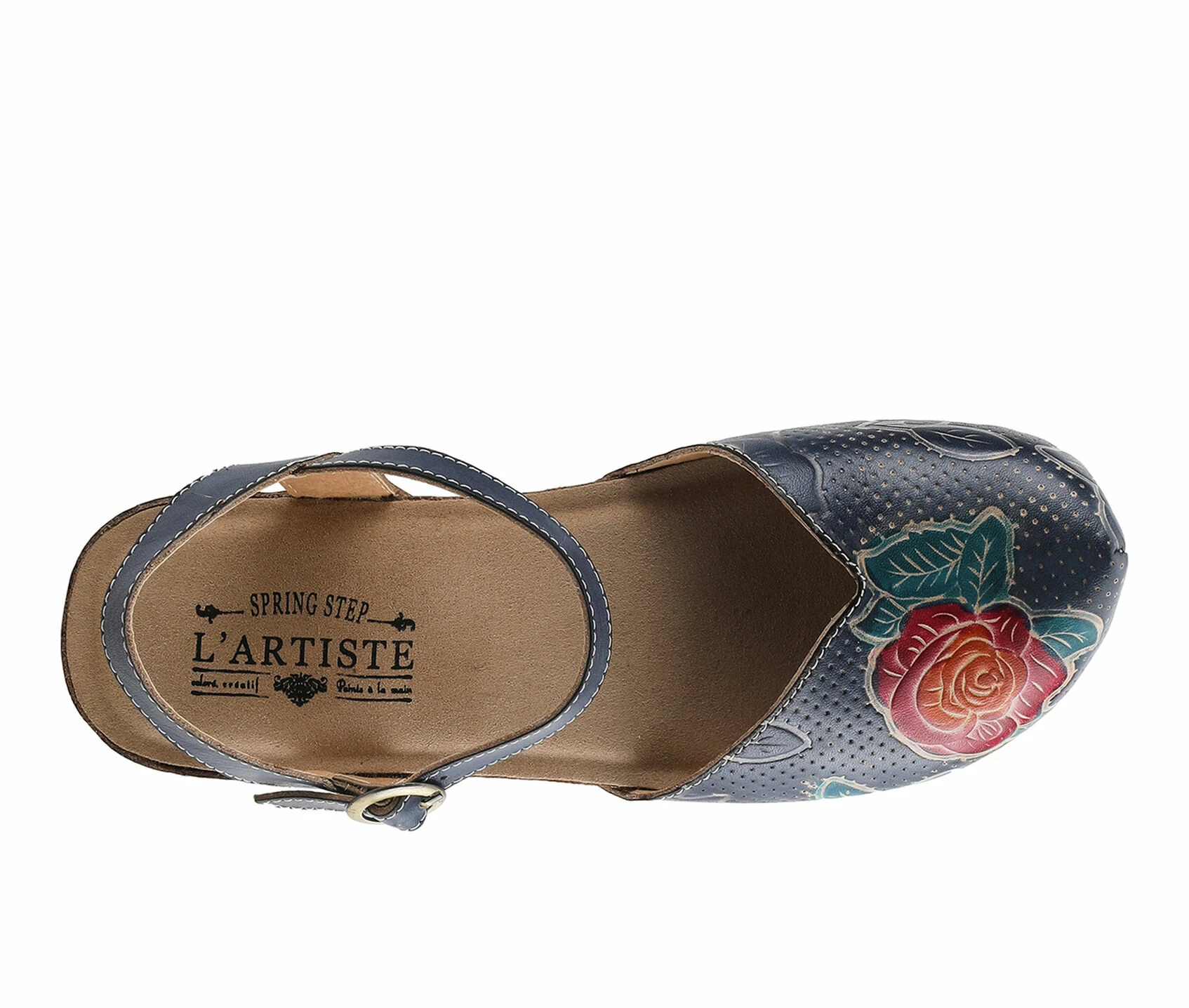 French inspired, hand-painted leather mary-jane perforated wedge clog embosed with rose flowers design and and fashioned with an antiqued metal buckle.