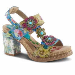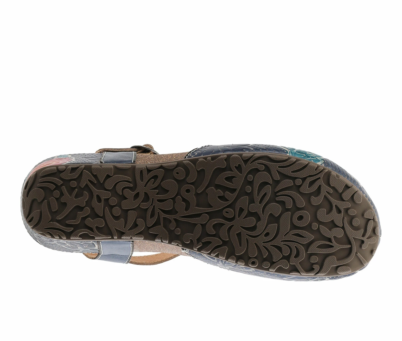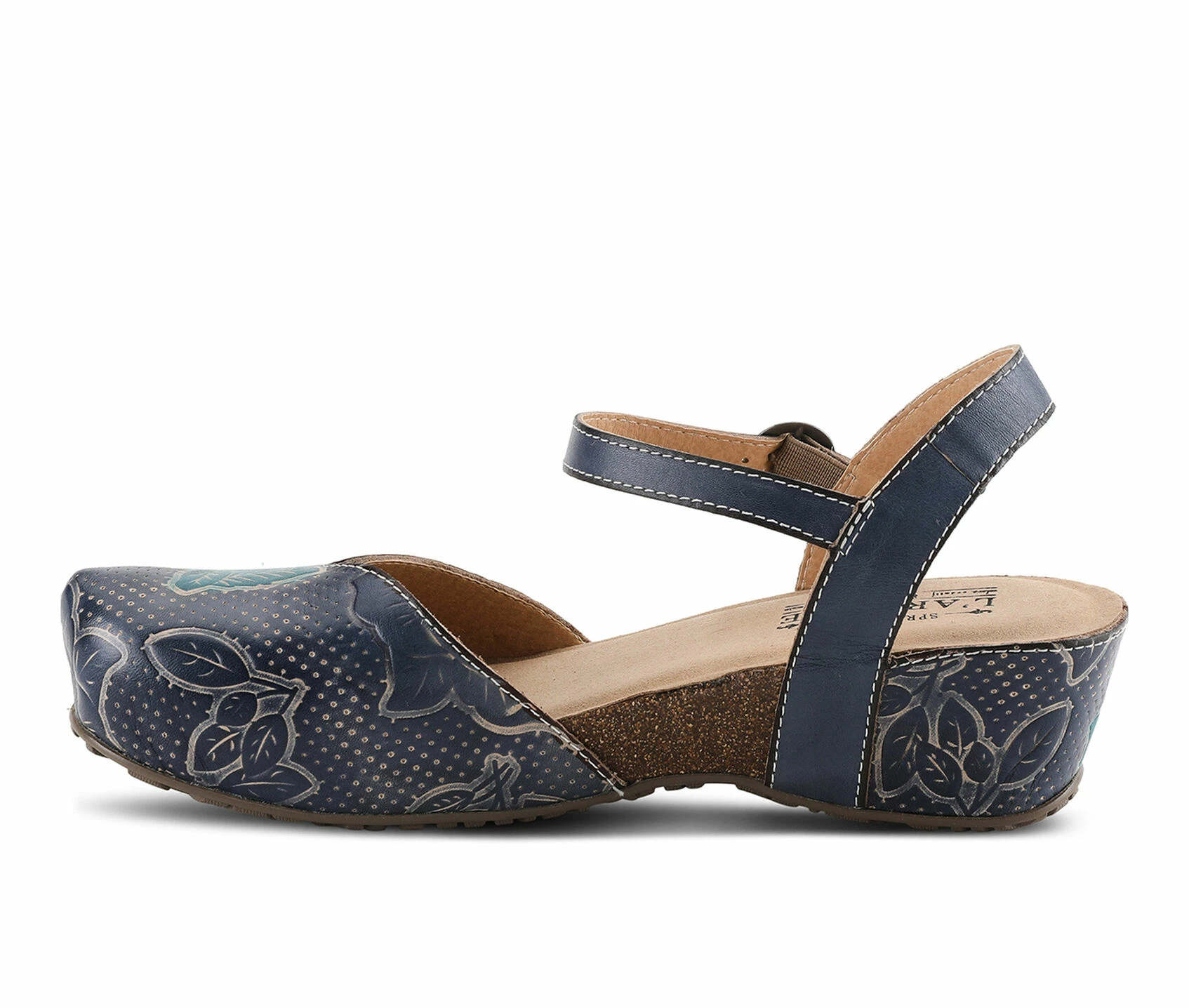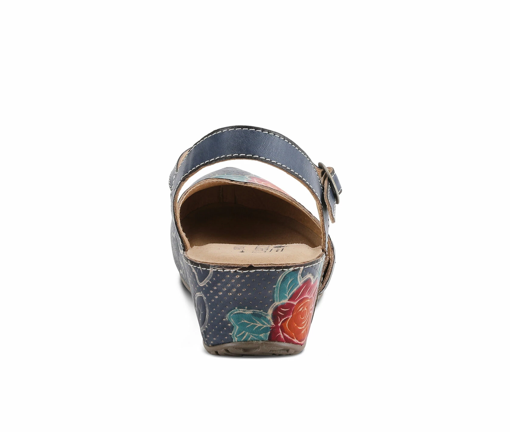 French inspired, hand-painted leather mary-jane perforated wedge clog embosed with rose flowers design and and fashioned with an antiqued metal buckle.