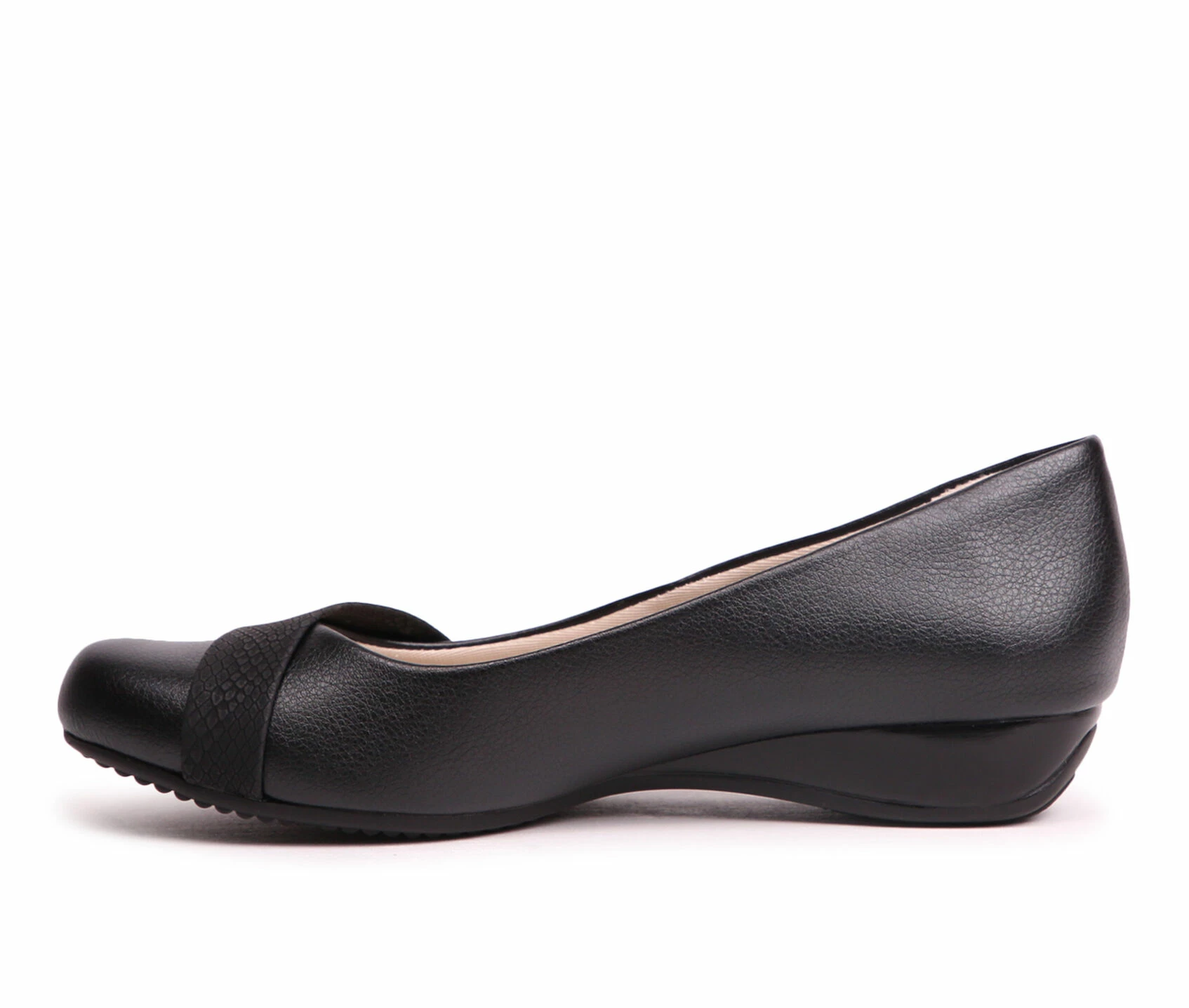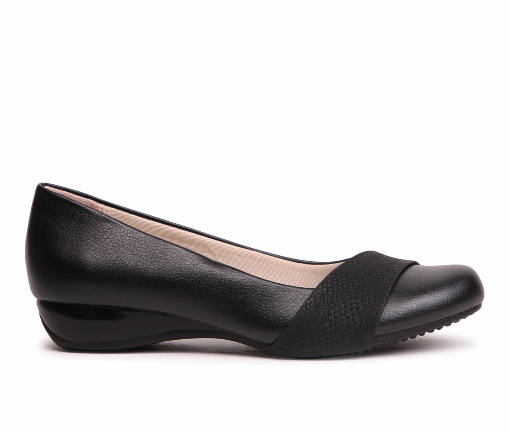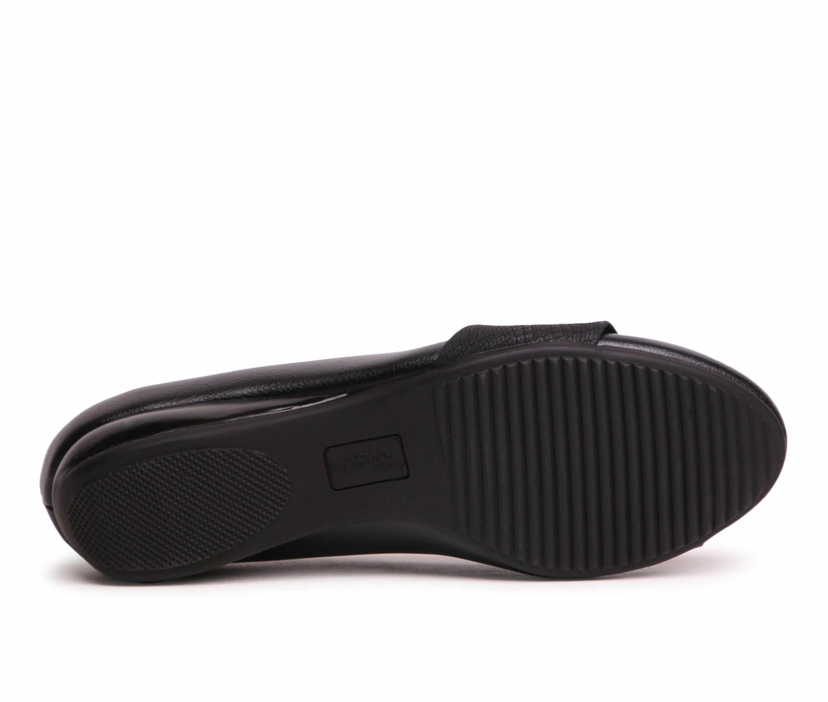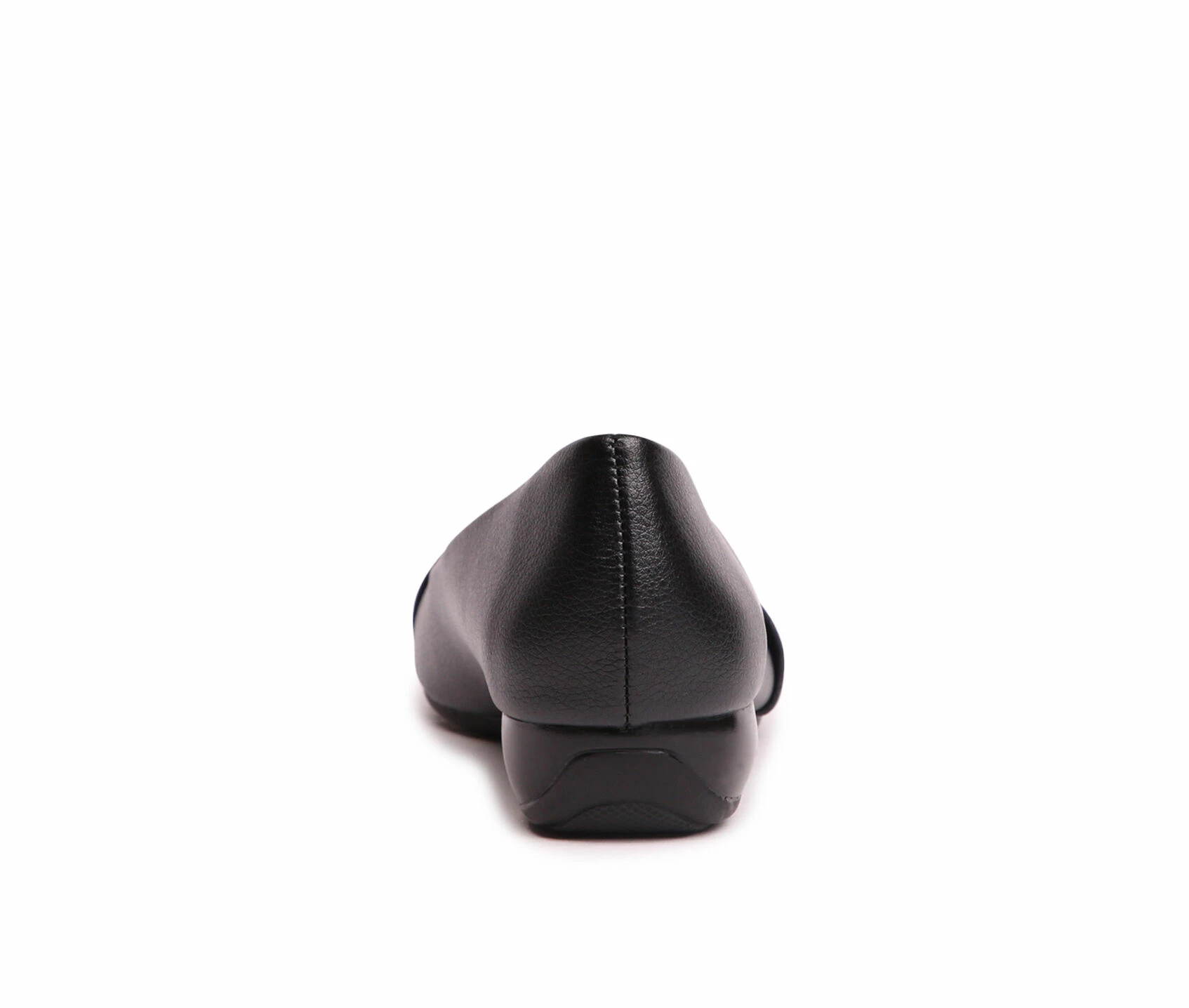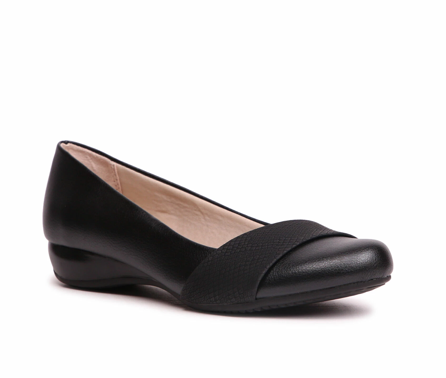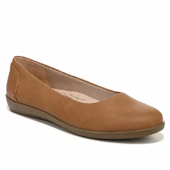 - Never sacrifice comfort for style in this easy-to-wear flat. Faux leather upper with a round toe, slip-on fit, and asymmetrical strap accent. Soft system comfort package provides all-day support, flex, and cushioning. Just right height 1 inch heel.