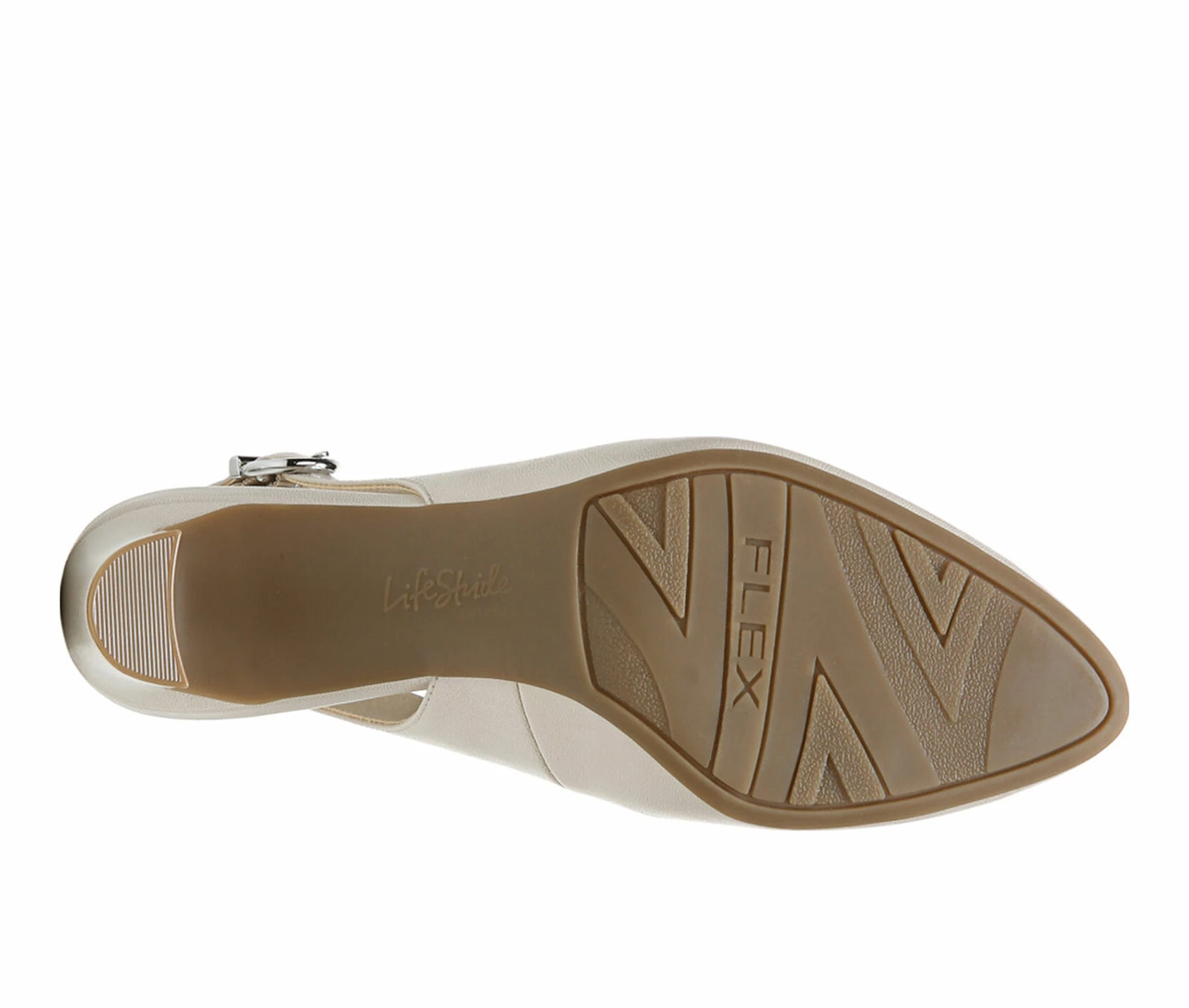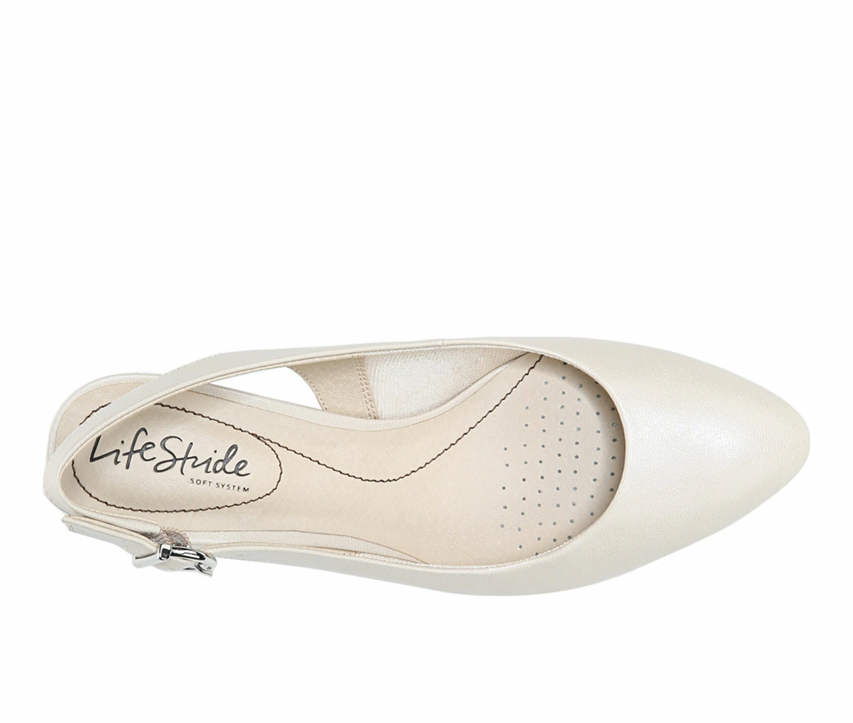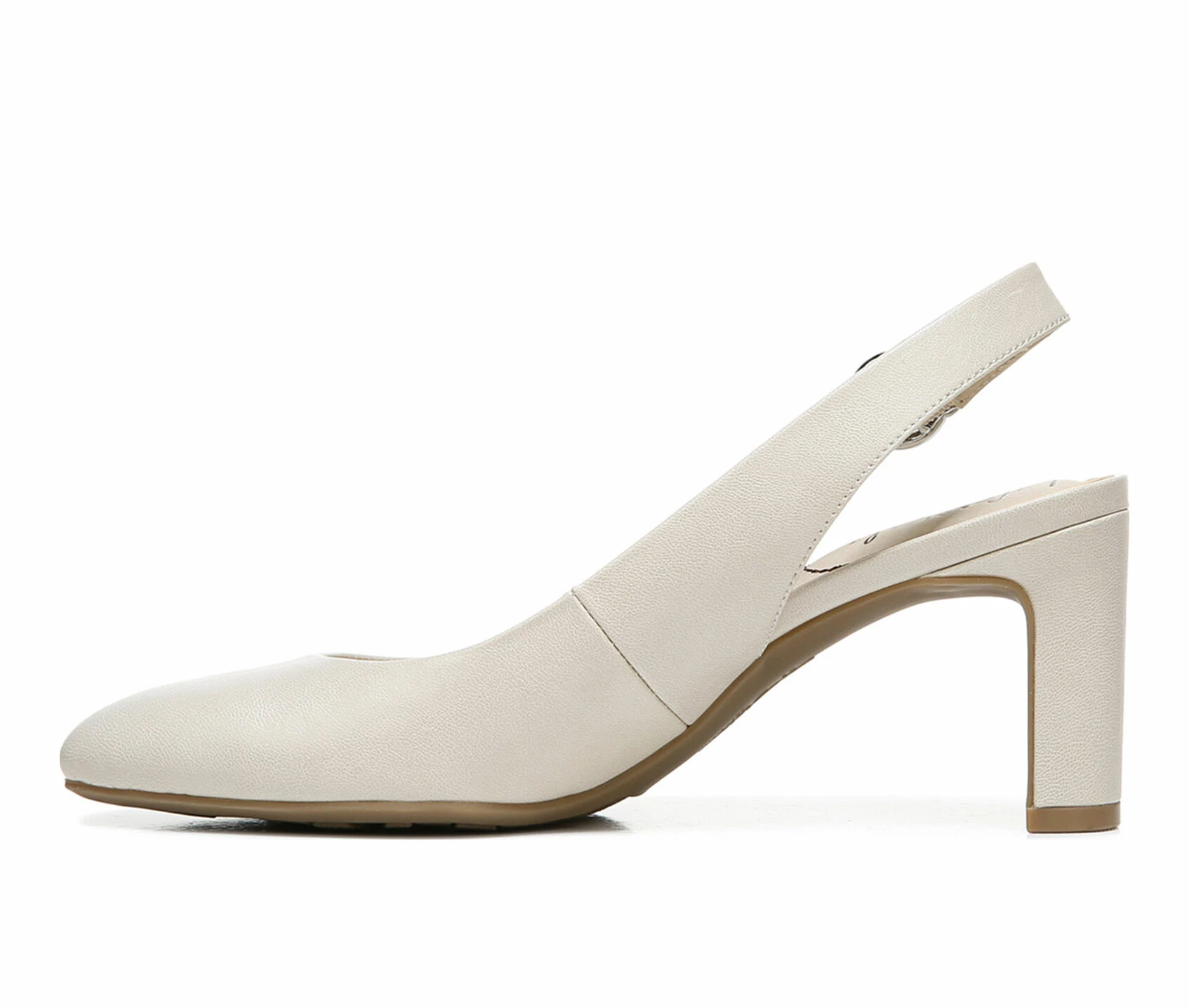 - With a modern heel shape and heel-to-toe comfort, this slingback pump is a favorite. Faux leather upper with a round toe, slingback strap with adjustable metallic buckle, and modern heel shape. Soft System® comfort package provides all-day support, flex, and cushioning. Traction sole provides you with extra stability. Just Right Height 2 and 3/4 inch modified block heel.