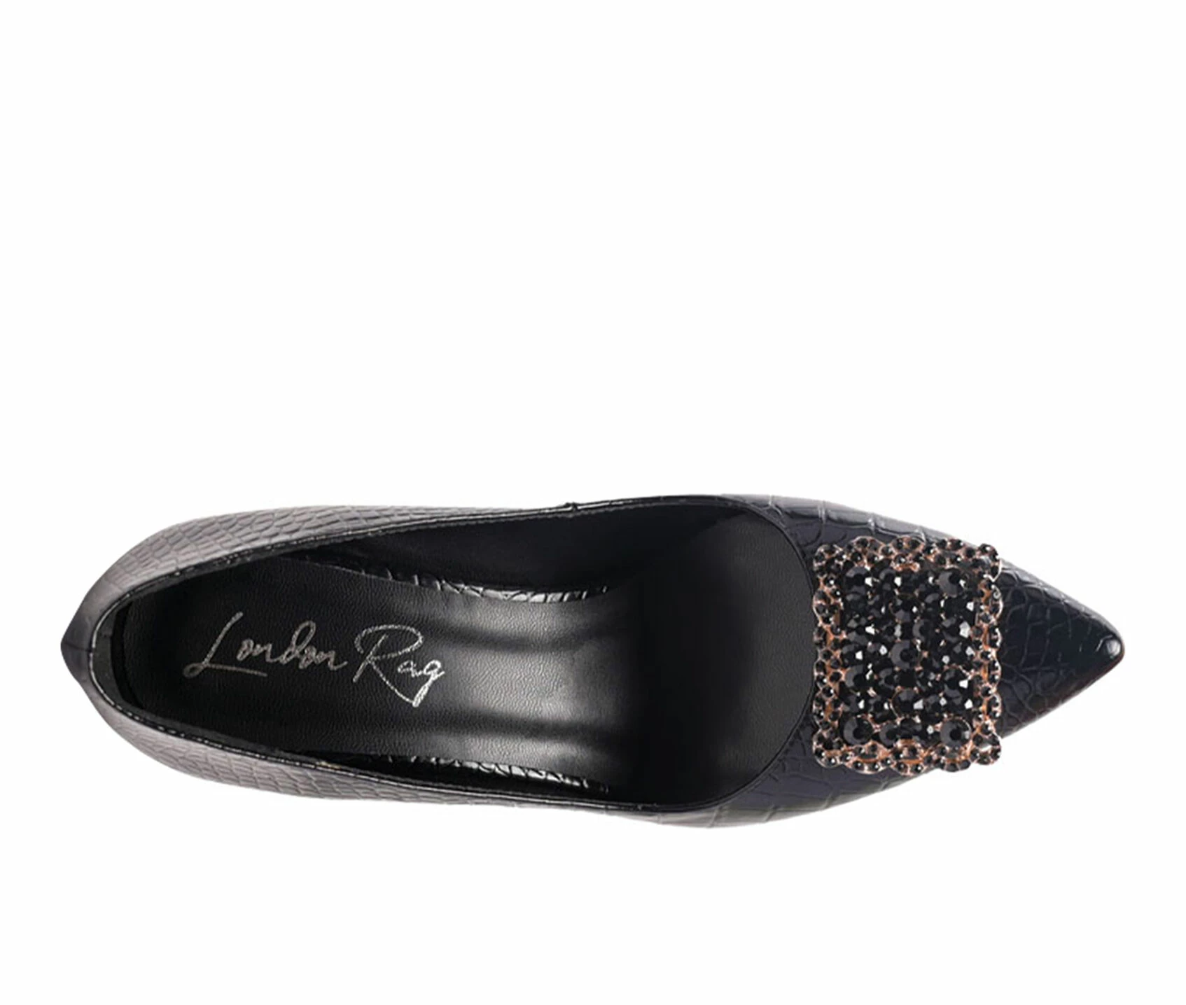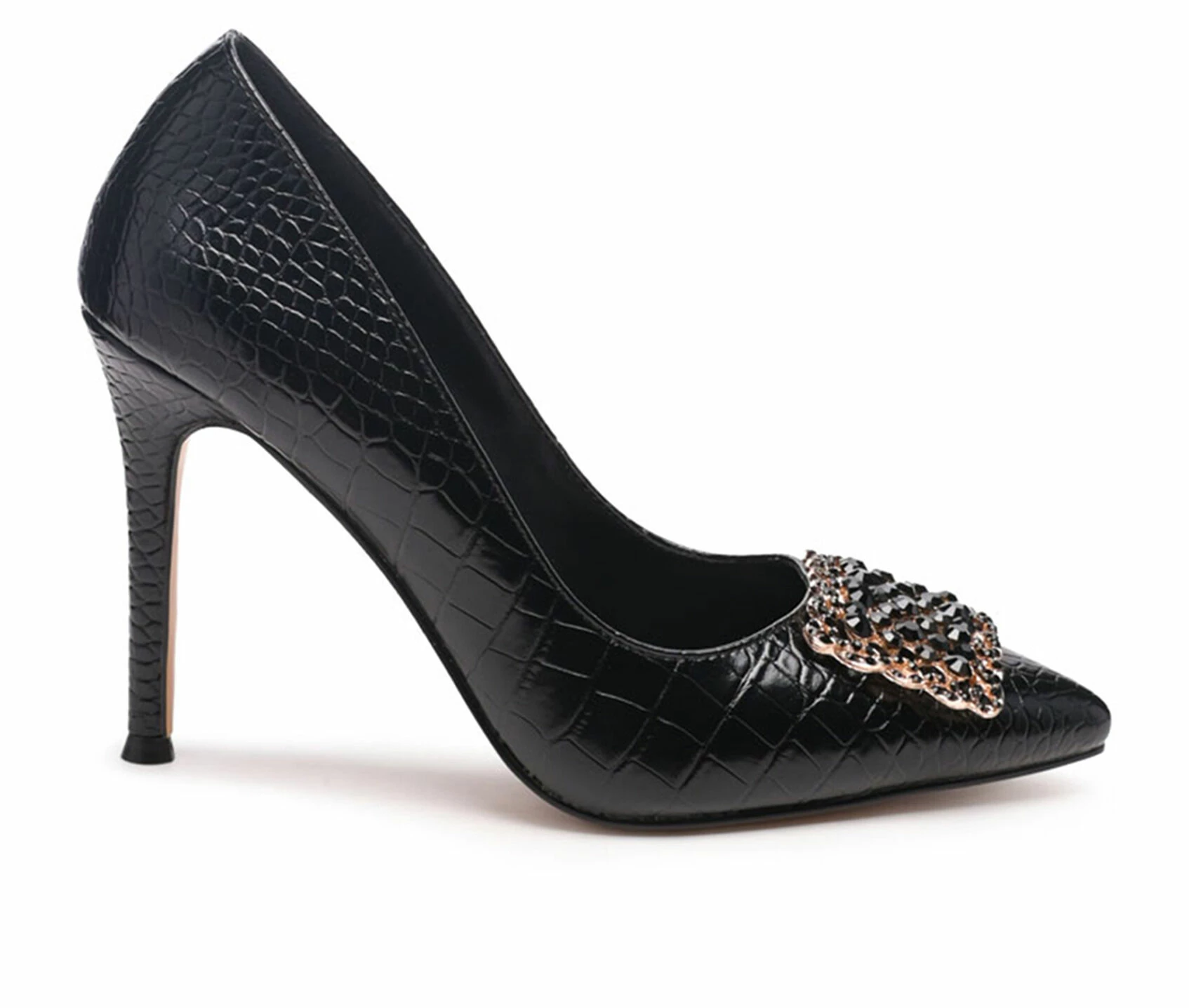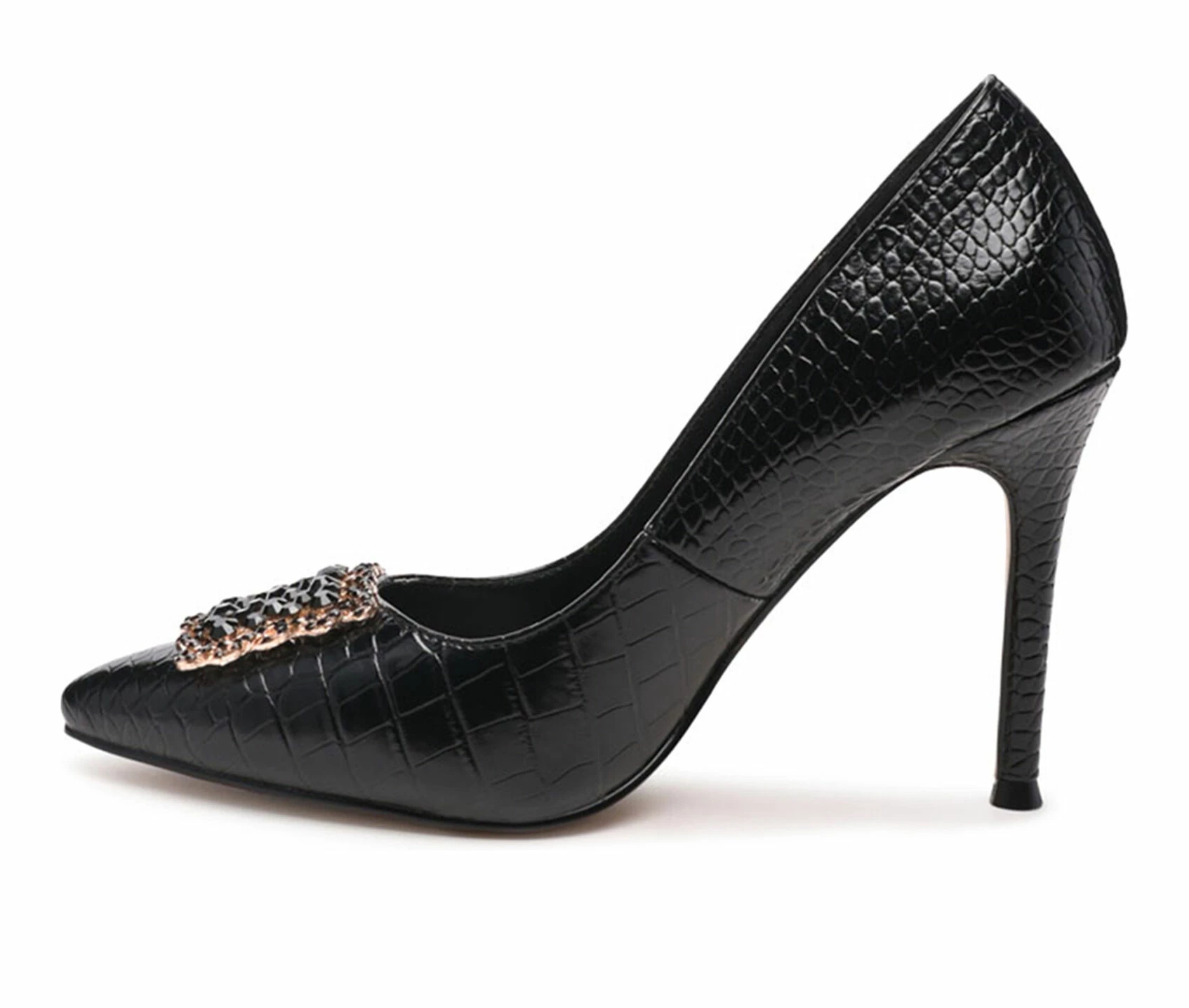- Beautiful pair of Faux Leather Pumps with crystal lined square brooch on top. What else do we need this evening?