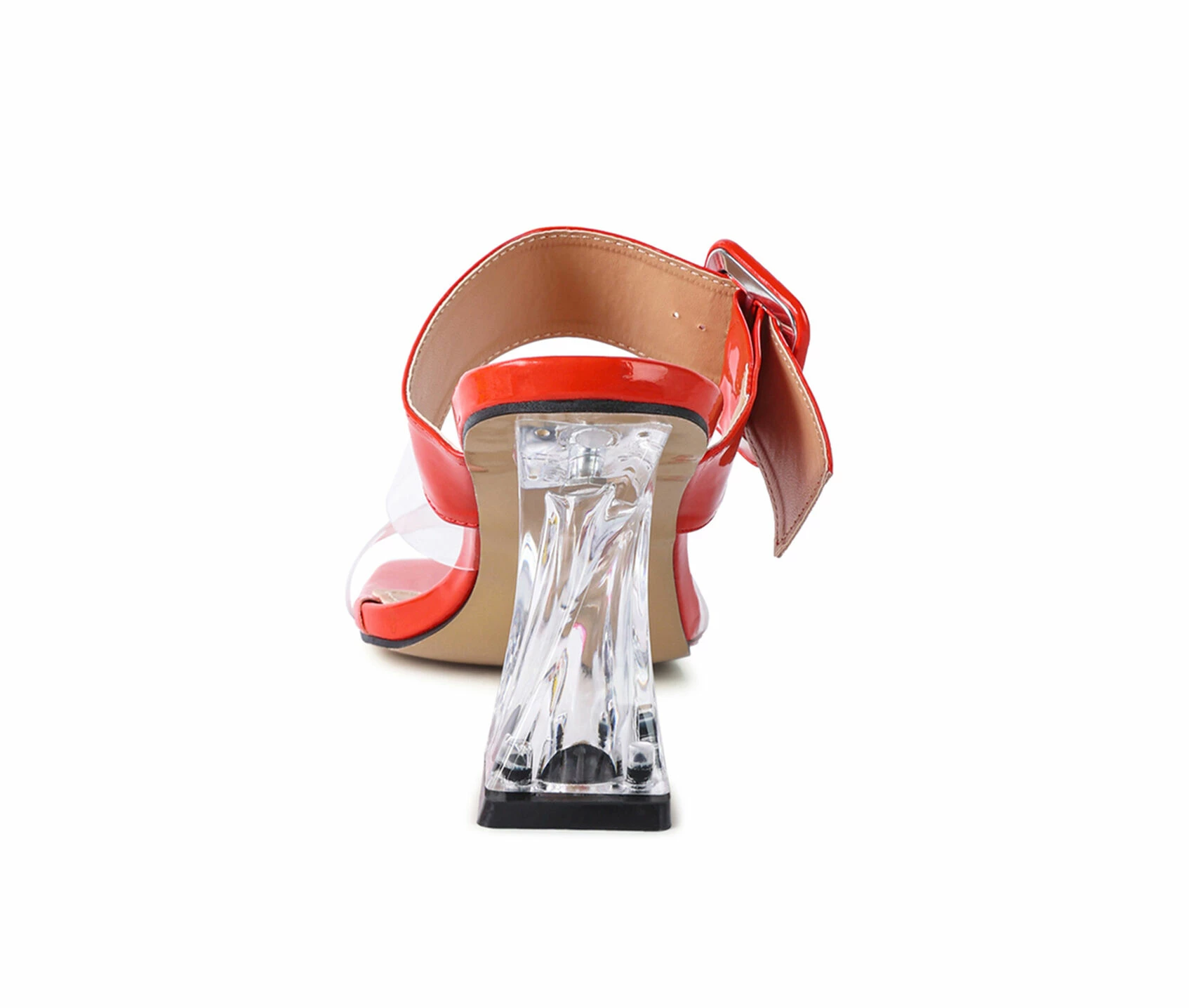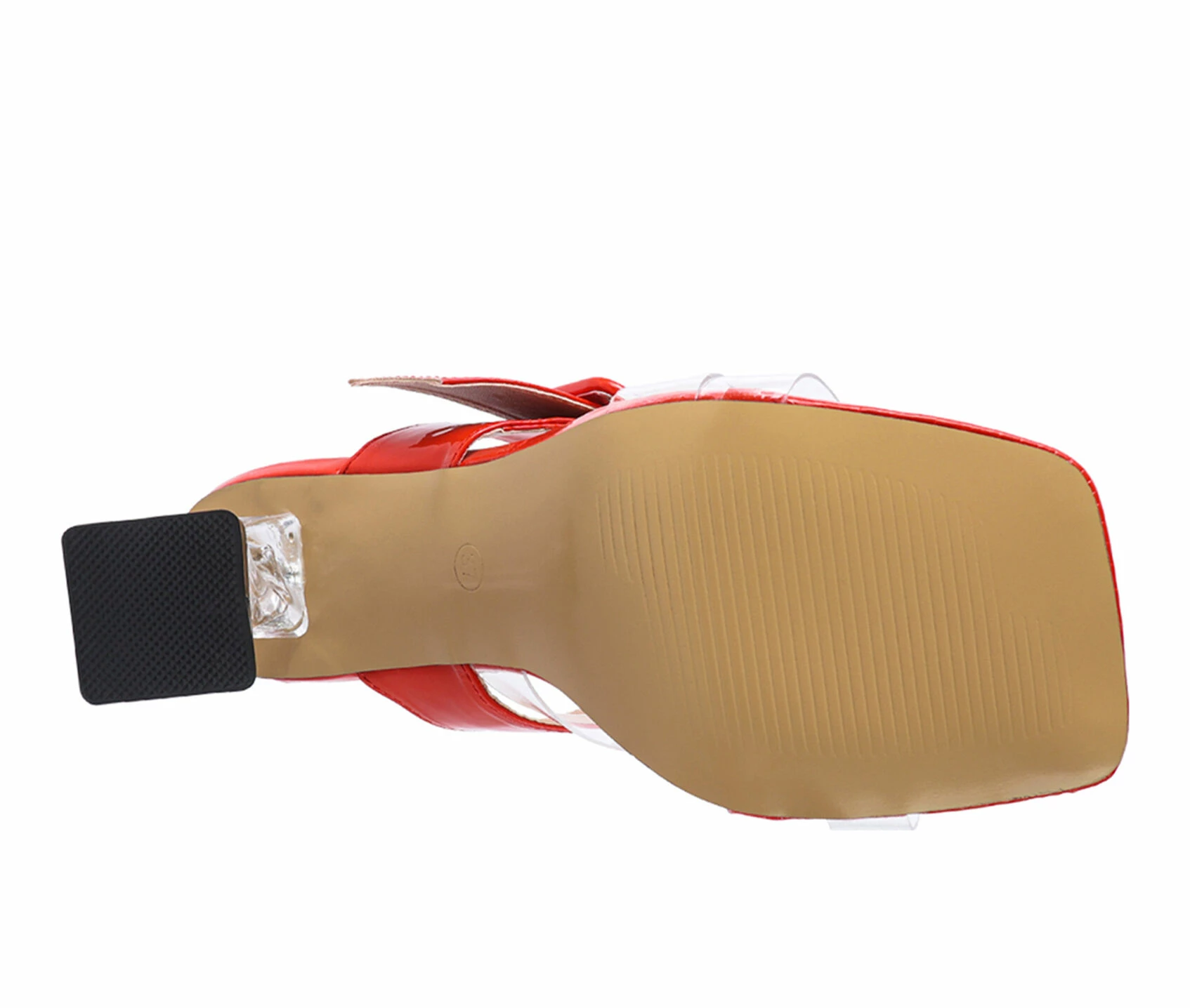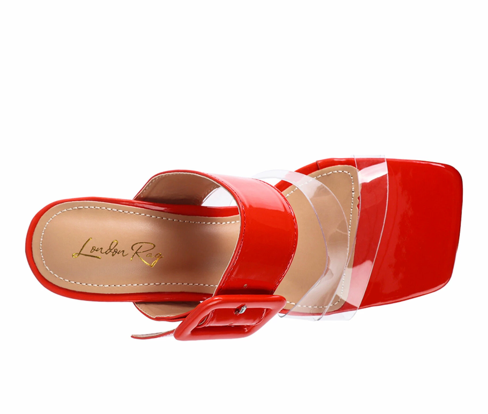 - Big Pin Buckle on the straps, with crystal effect clear heel – this mid-heel slide sandal is for comfort and trend.Â
