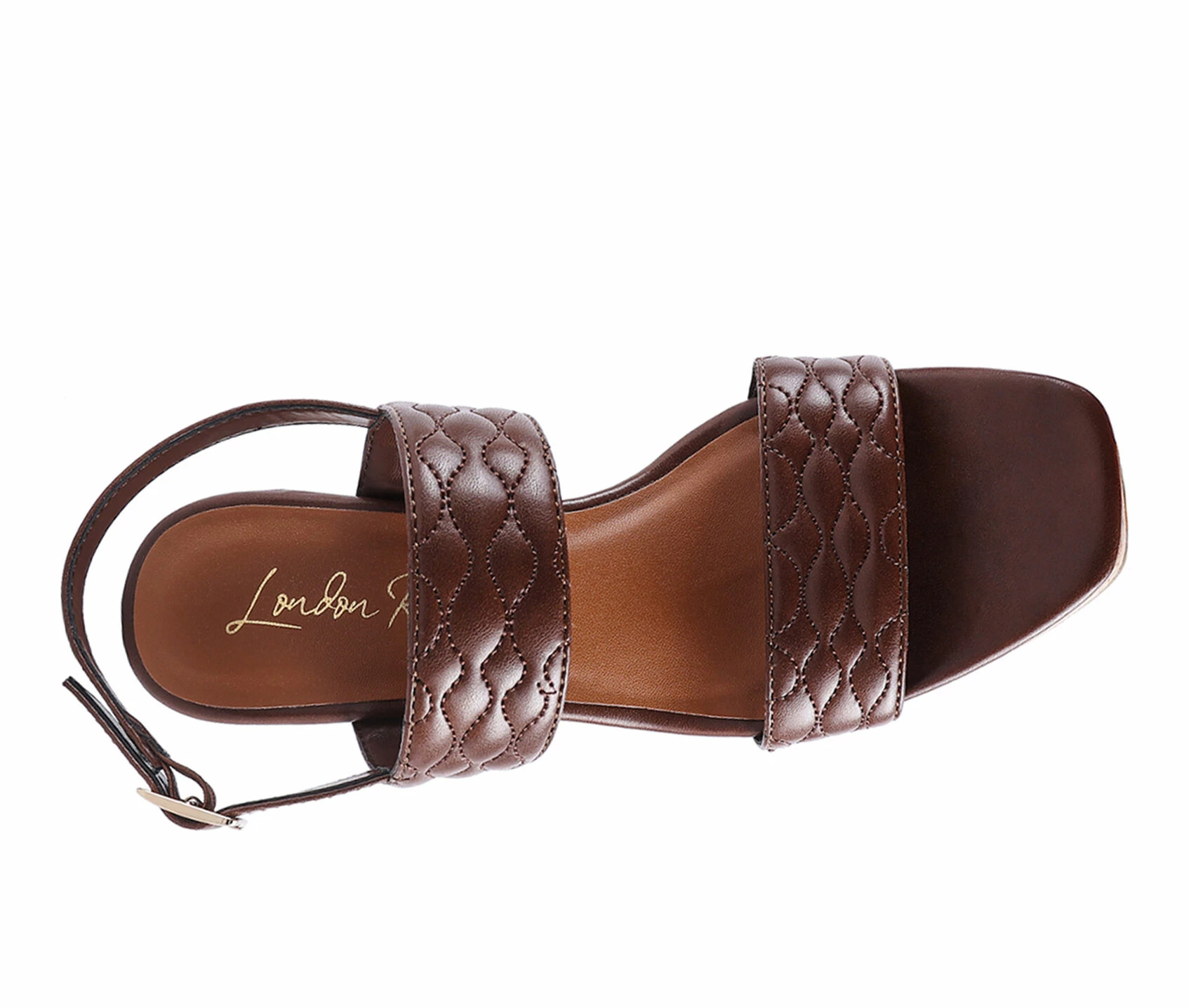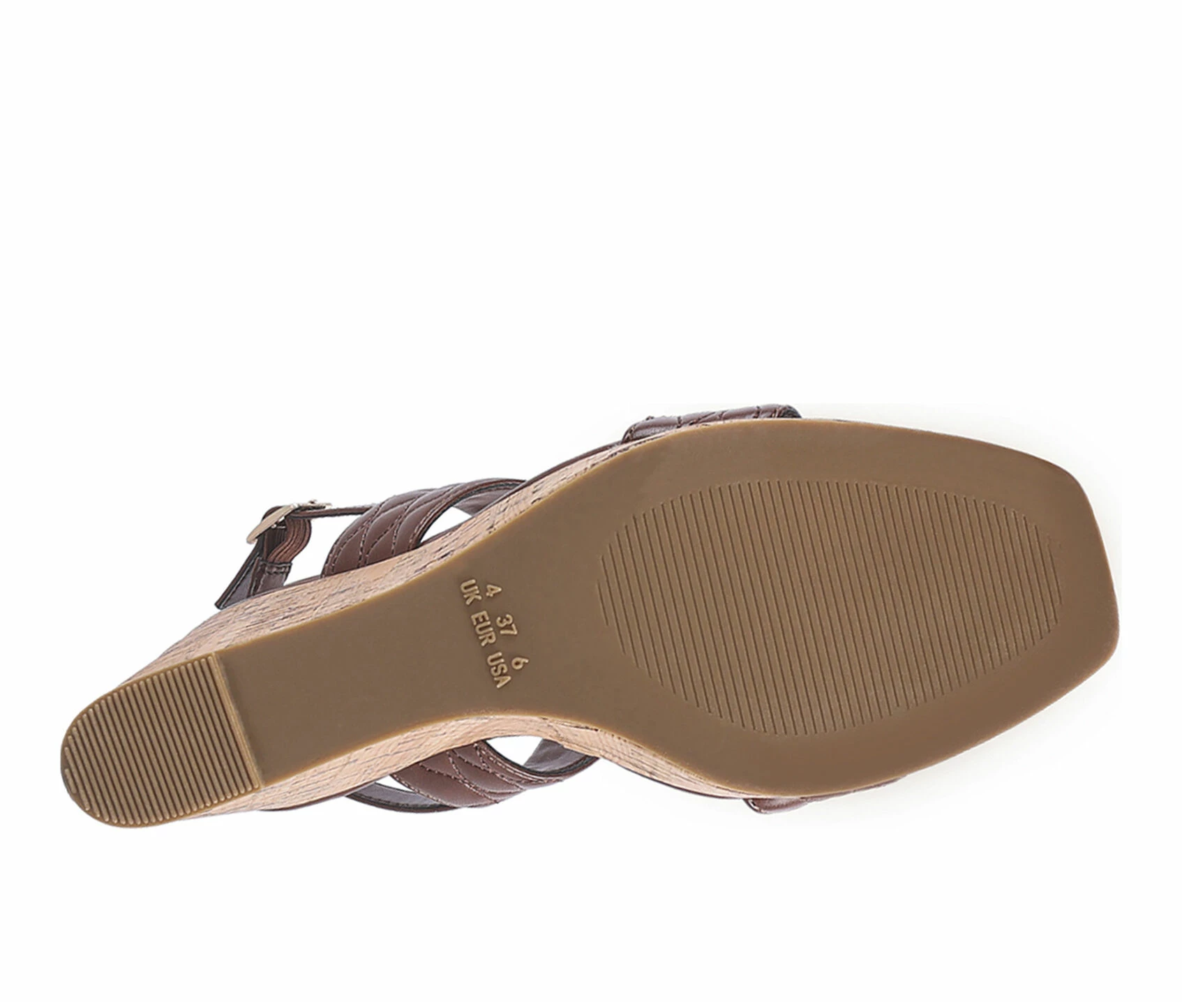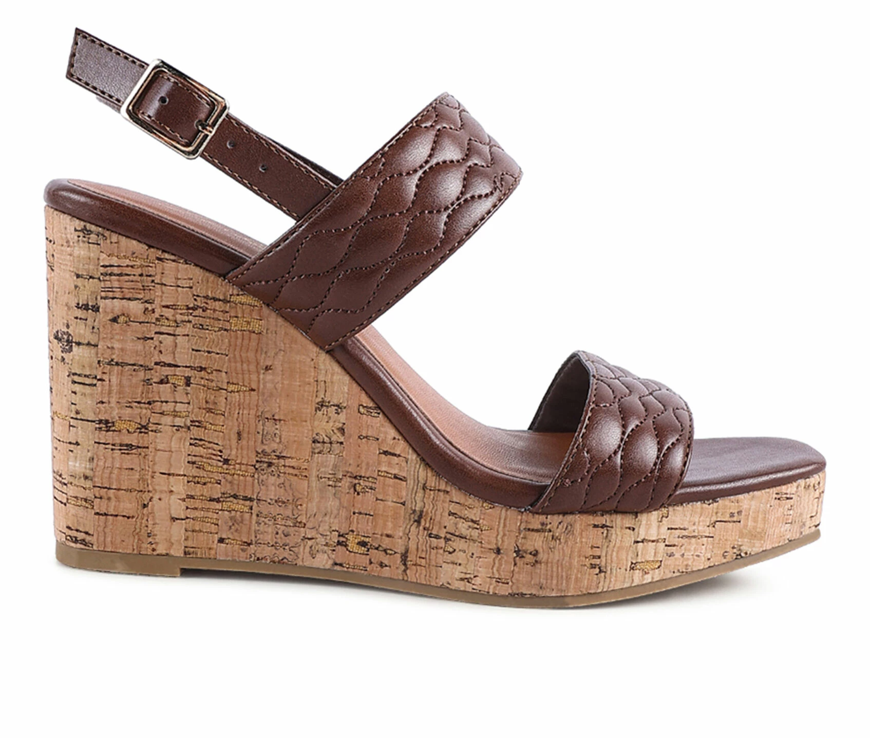 - Cork patterned wedge heel sandal with quilted strap. This style has a playful summer texture and comes with a slingback band with pin-buckle fastening. It has light insole cushioning which further boosts comfort.