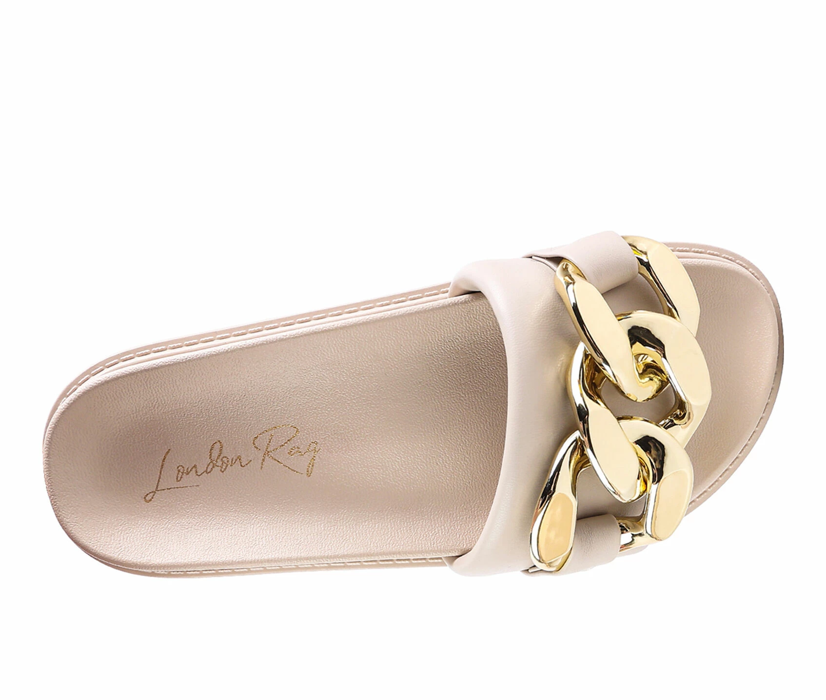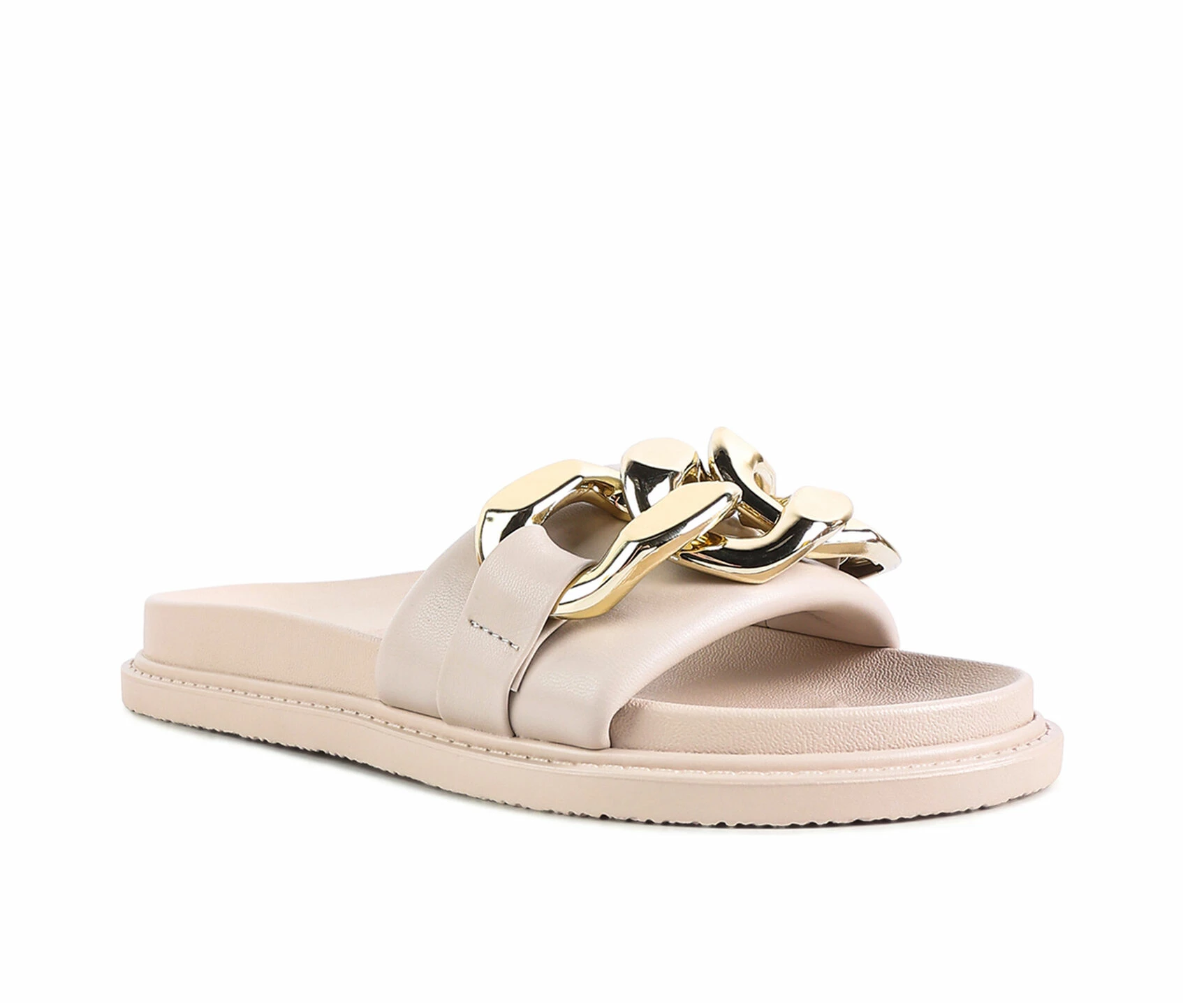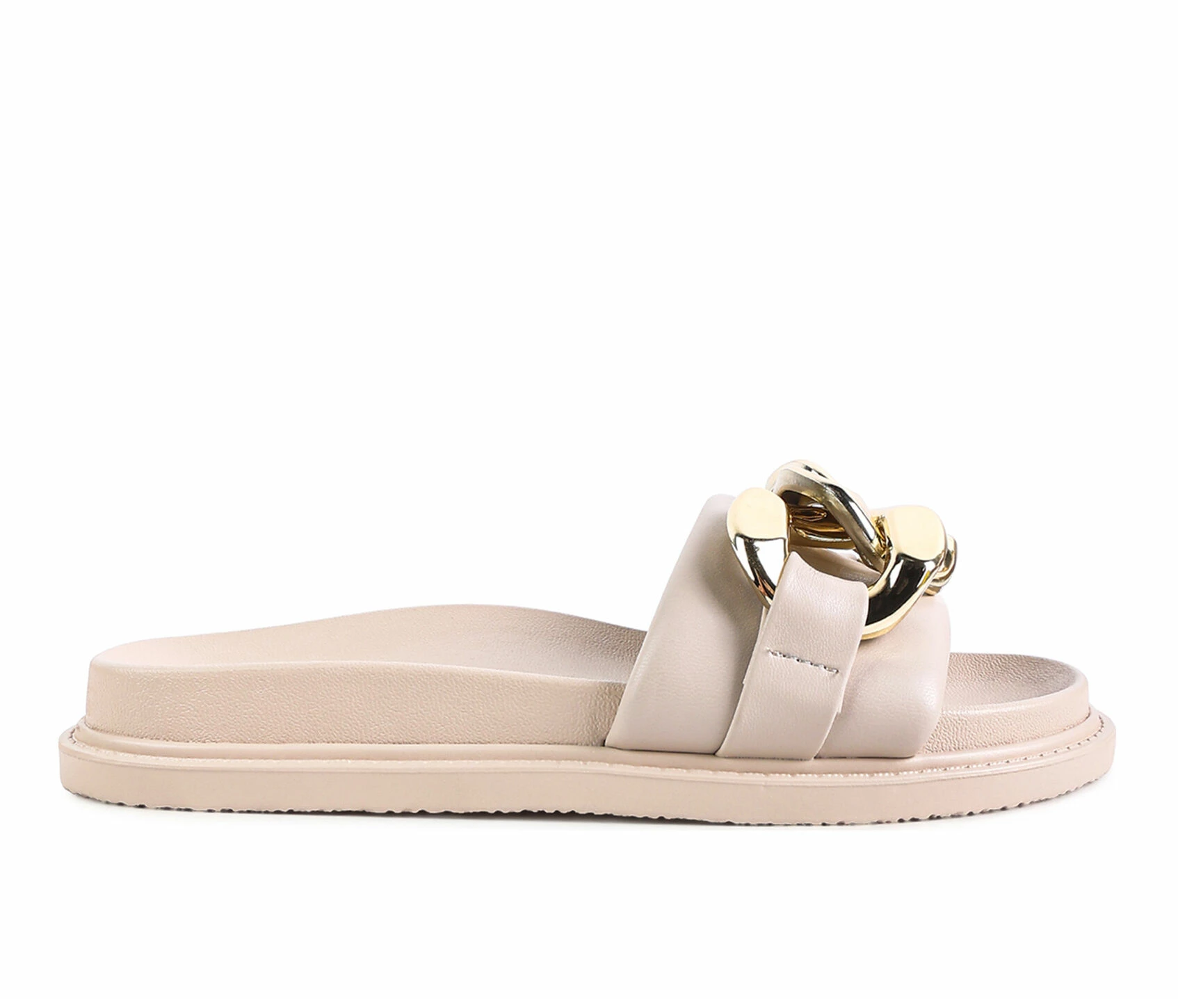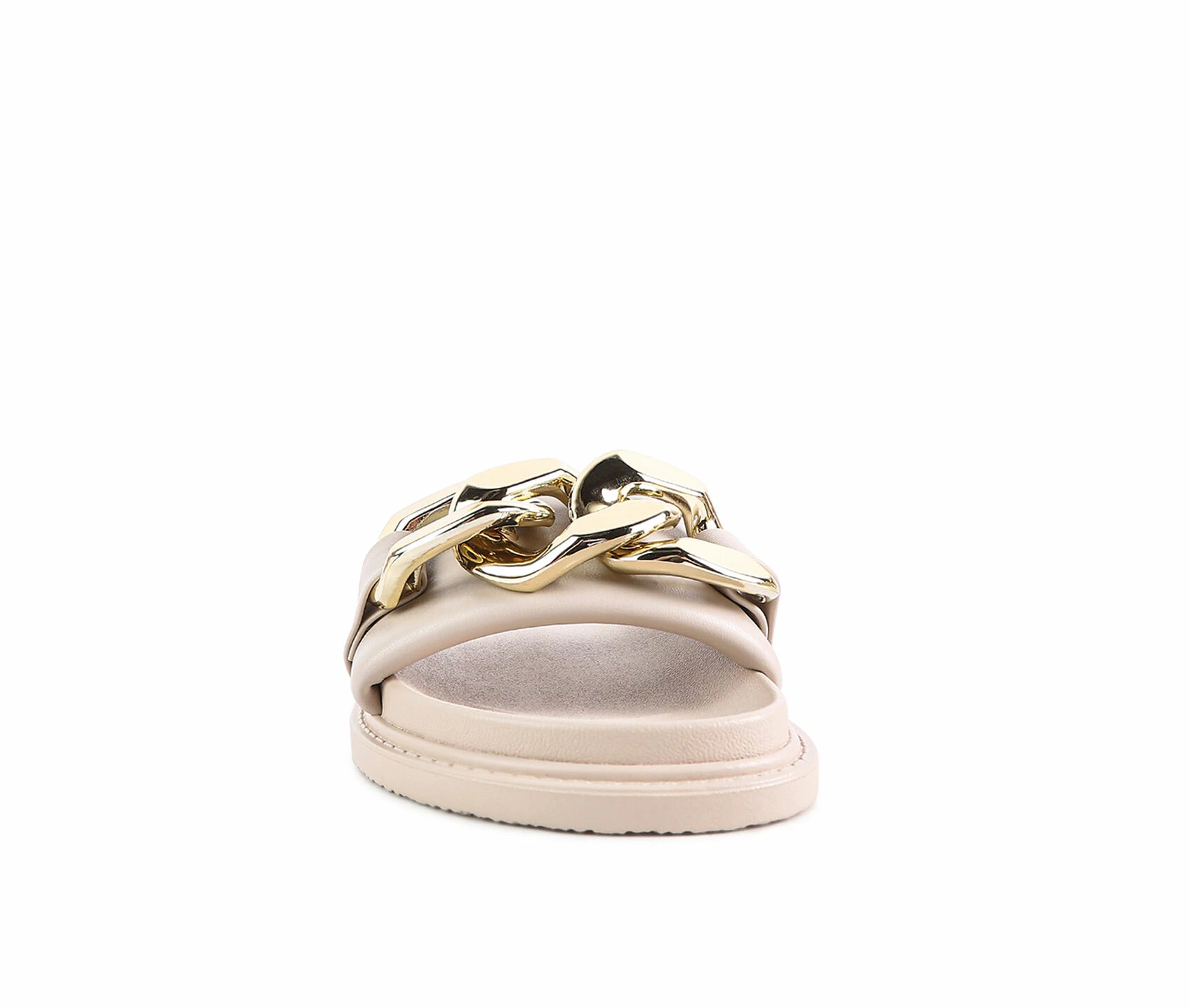 - Cushioned straps slide featuring chunky Cuban chain. These slides feature molded footbed. A perfect slide for those breezy walks.