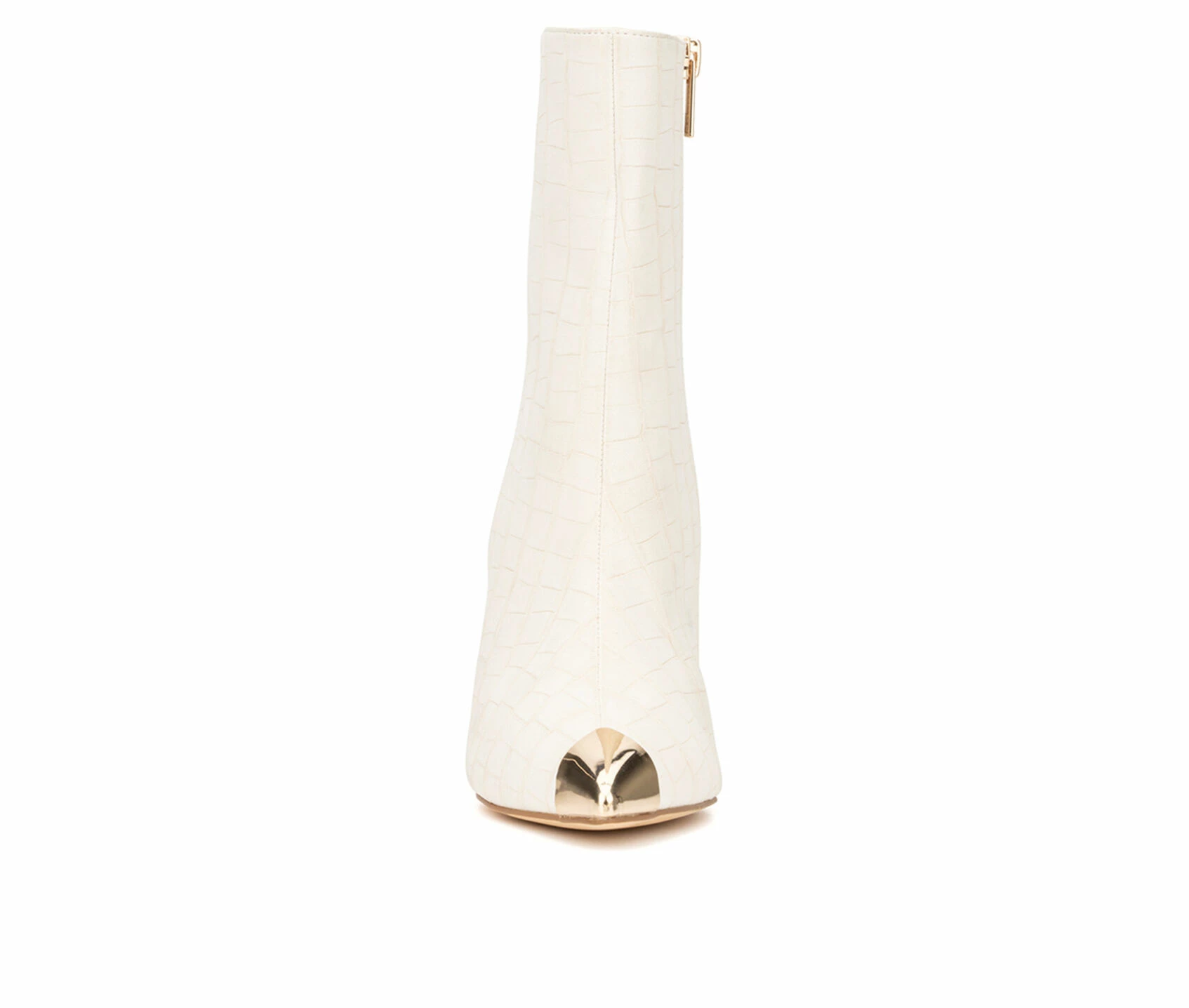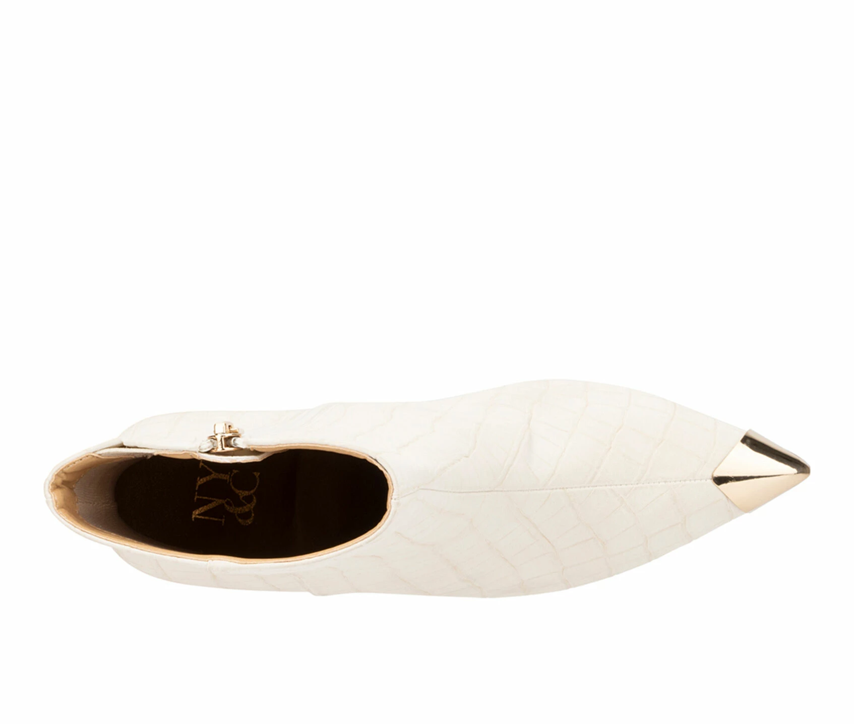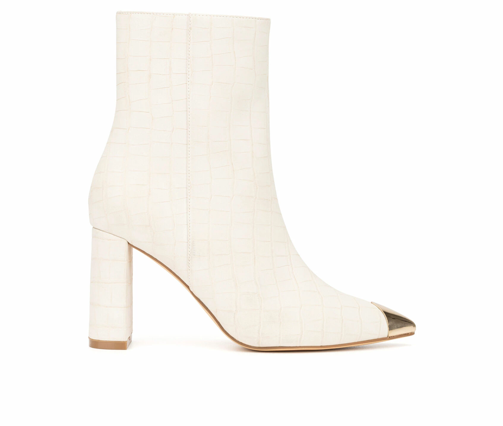 - Let’s glam up with the Kayla ankle bootie. This pointed toe style features a gold accent, patterned upper, side zip closure and block heel.