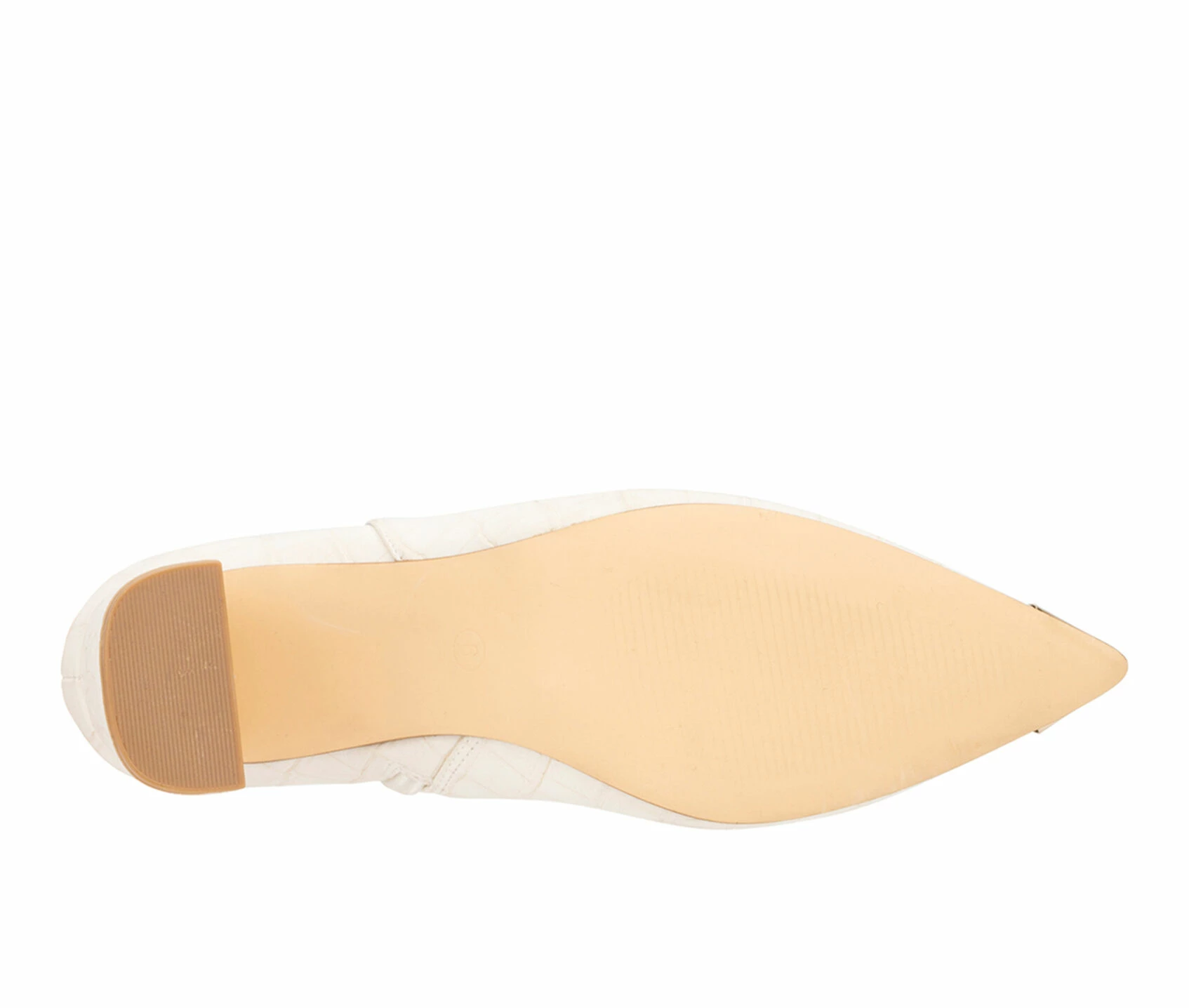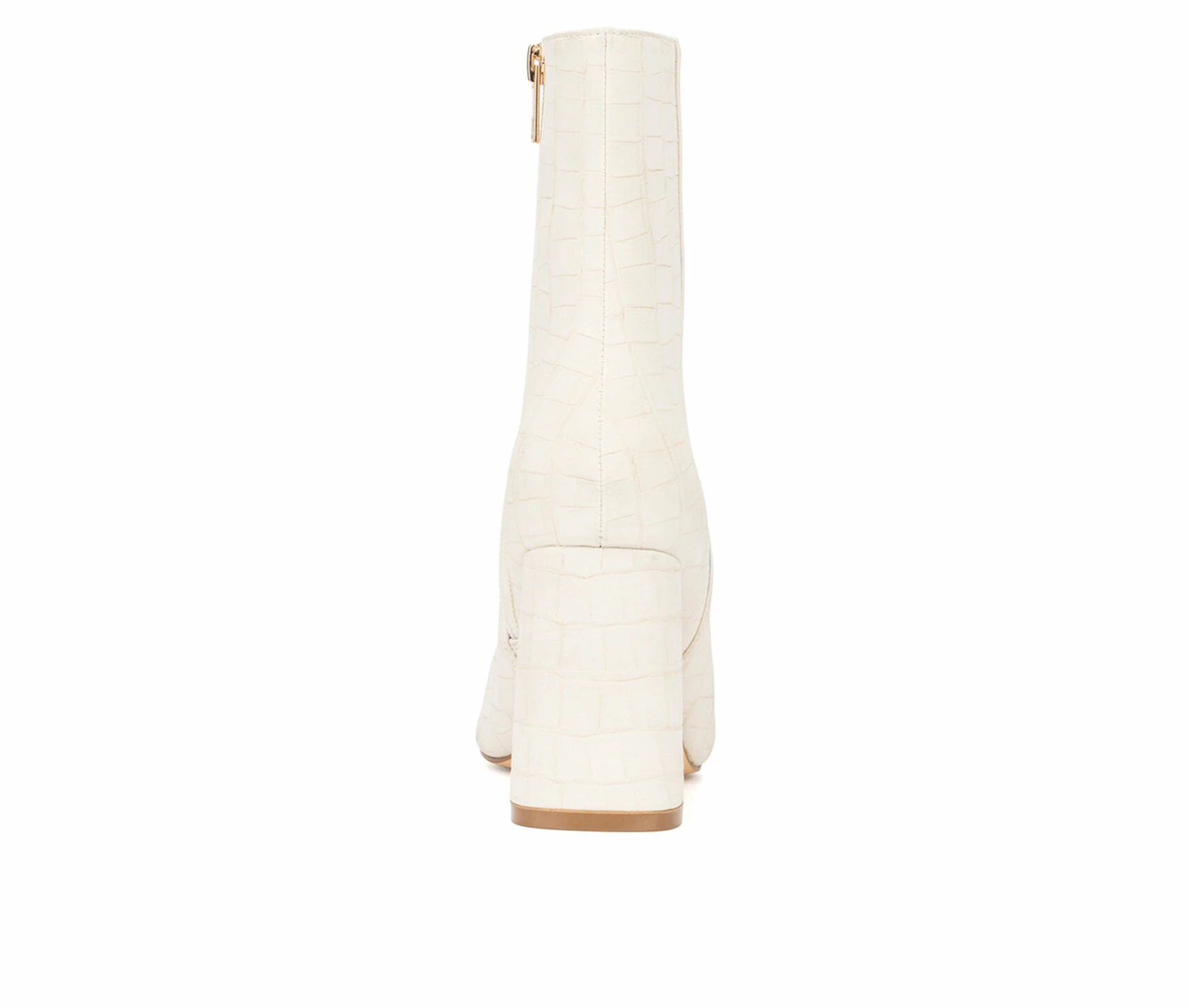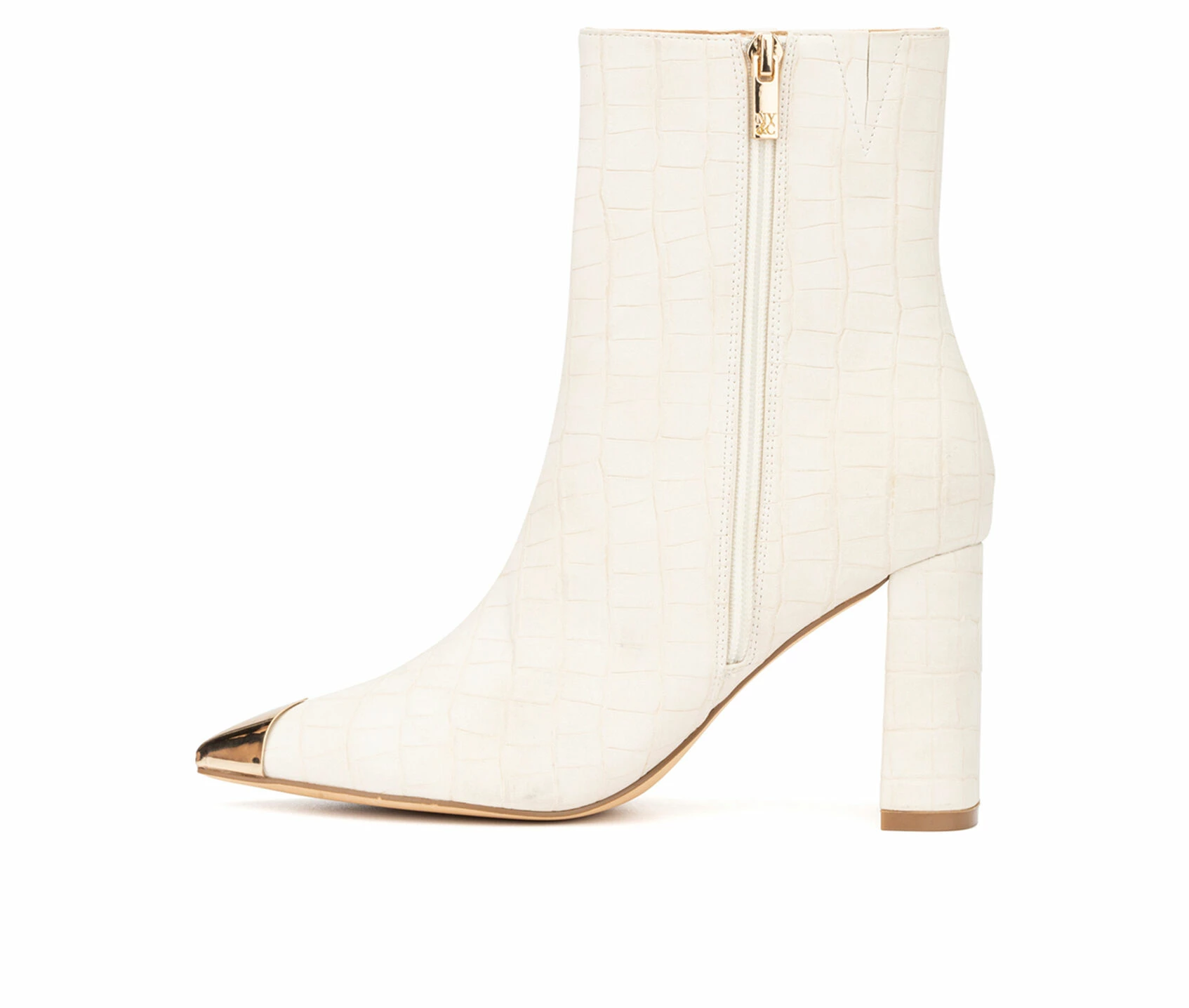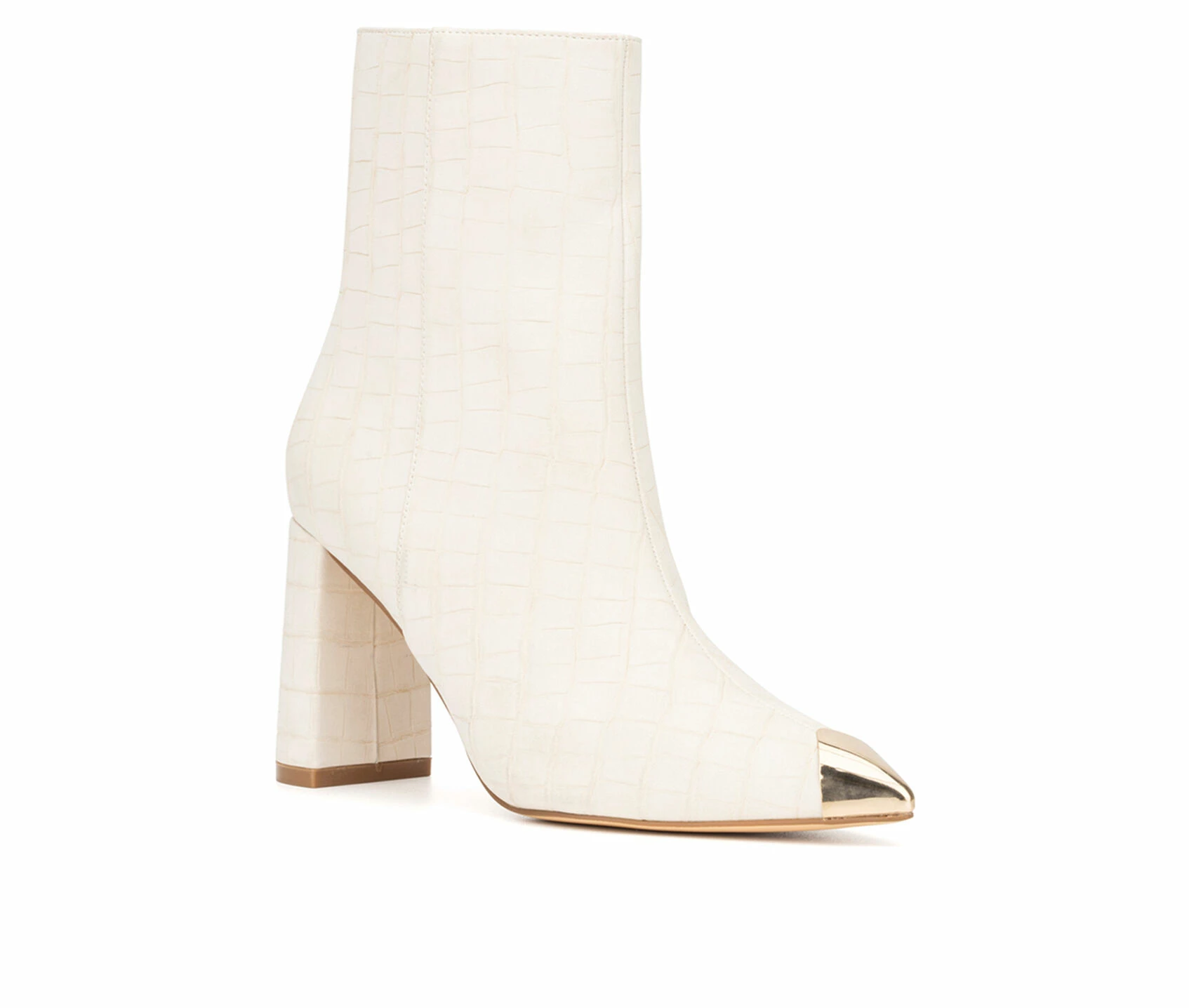 - Let’s glam up with the Kayla ankle bootie. This pointed toe style features a gold accent, patterned upper, side zip closure and block heel.