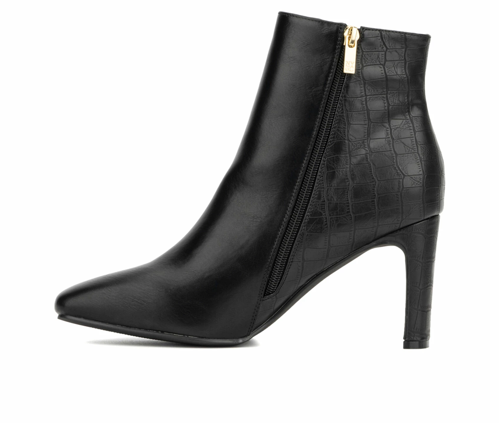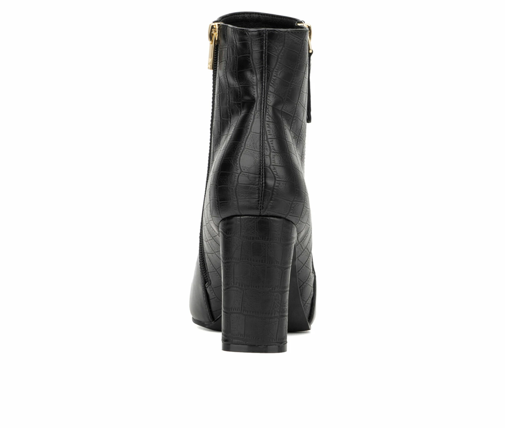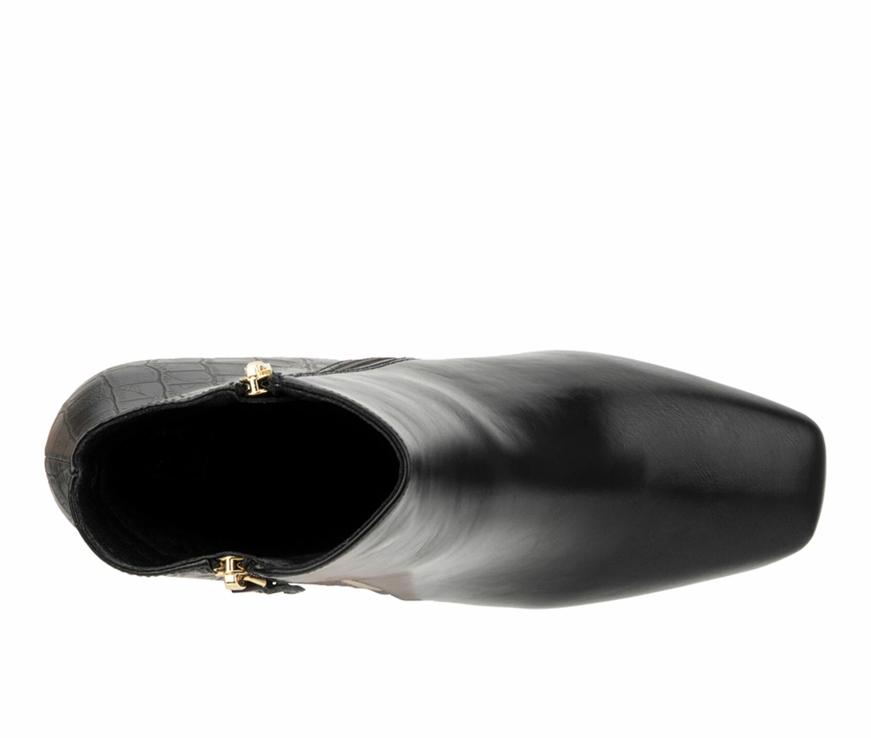 - The Una bootie is fashioned with a dual-textured upper, squared toe, comfy high heel and a side zipper closure.