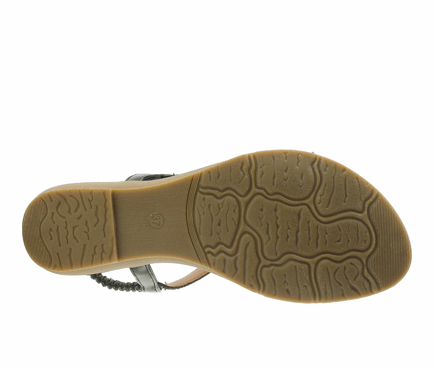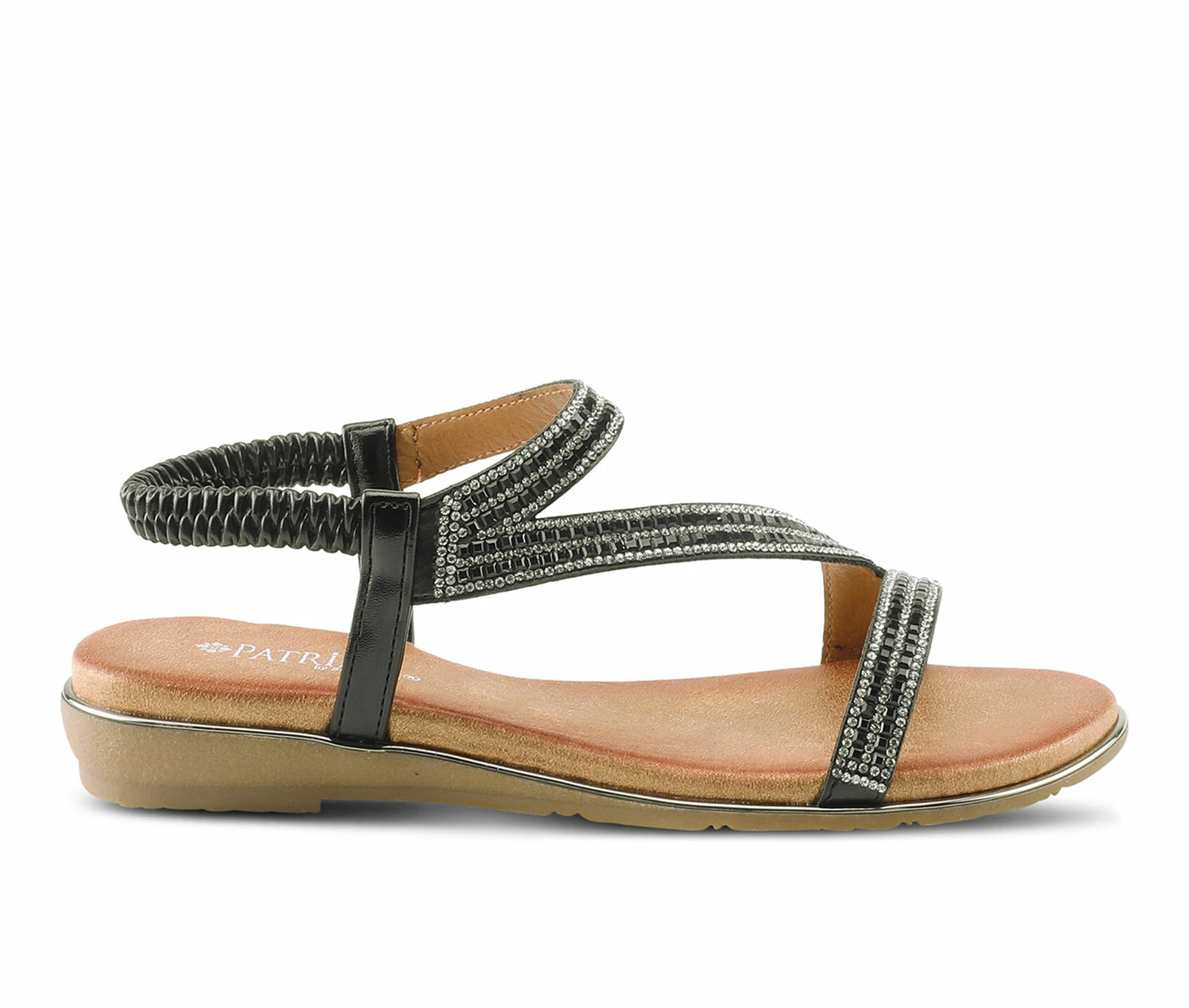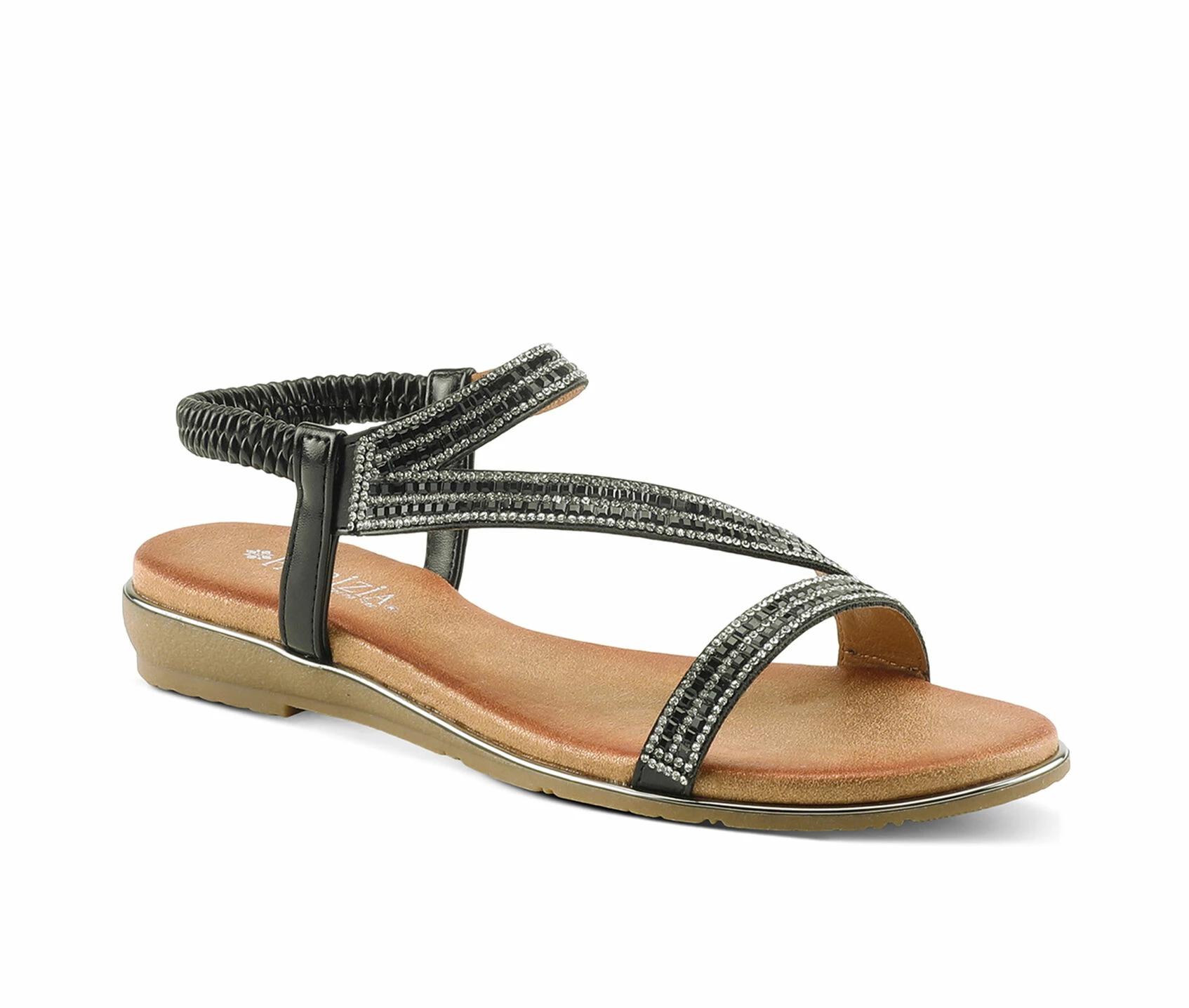 - Asymmetrical stretch back strap sandal wrapped in squared rhinestones surrounded by circular rhinestones and a colored trimming on a soft footbed.