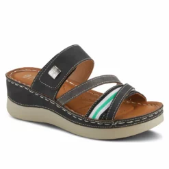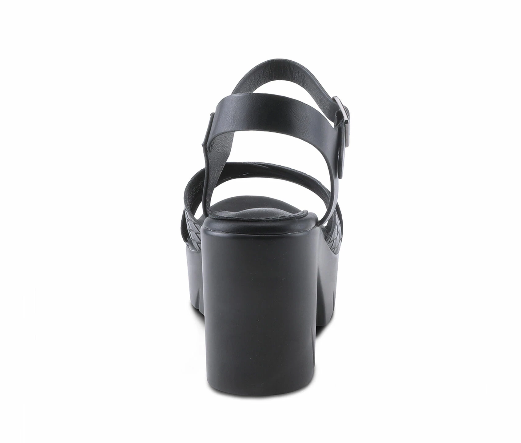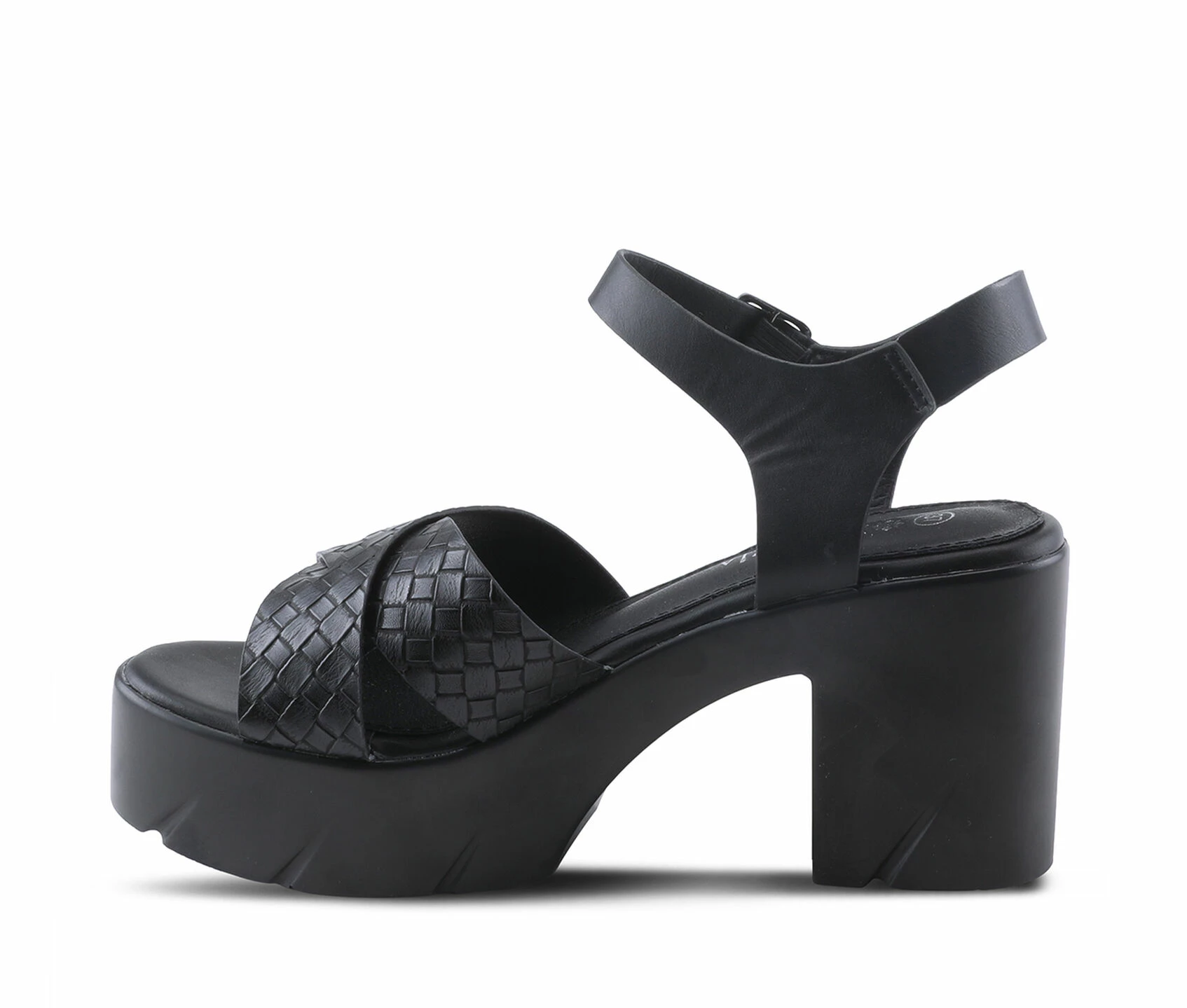 - Platform crisscross quarter strap sandal featuring a basket weave upper design and a shiny square buckle on a light weight, chunky unit bottom with arrowhead indentations.