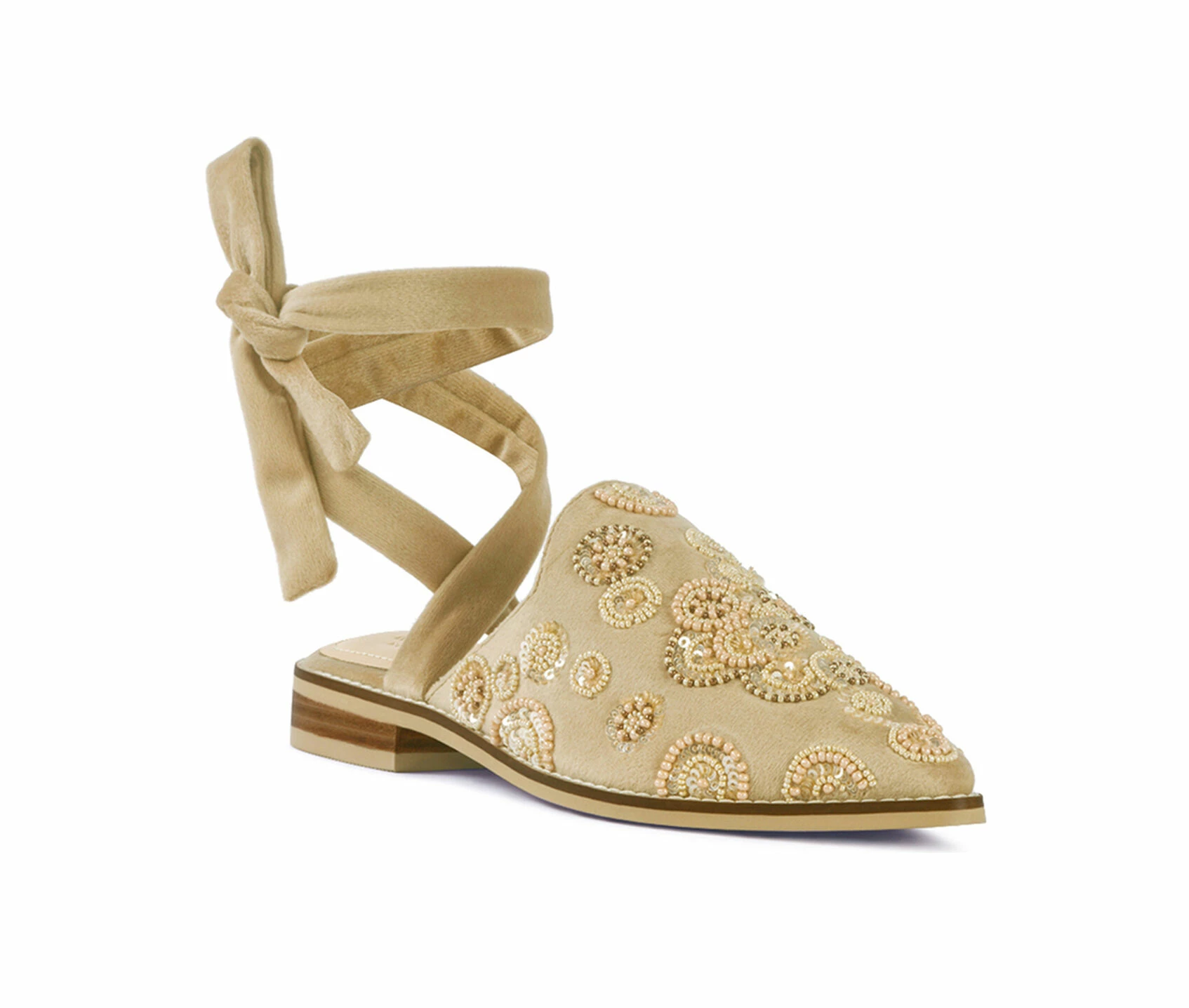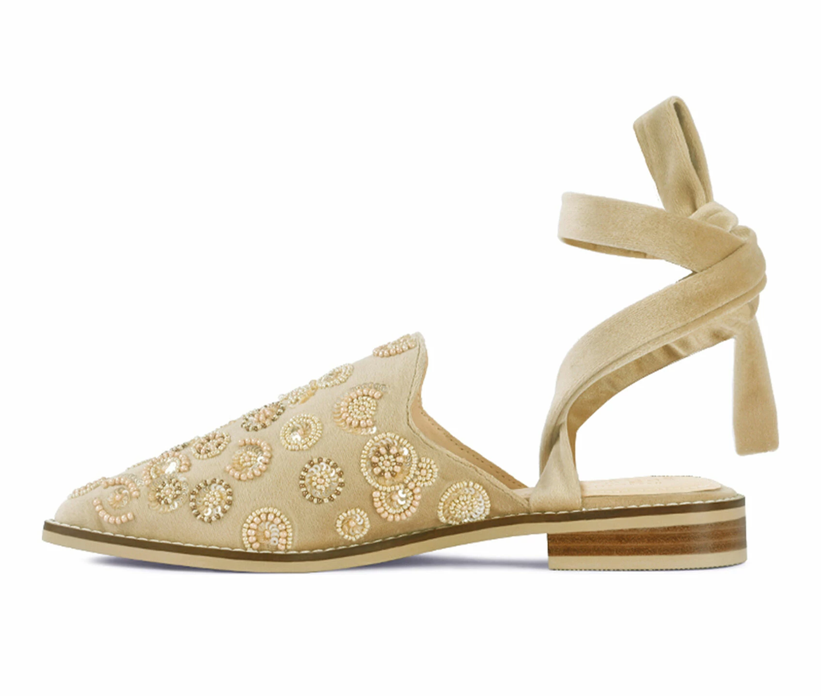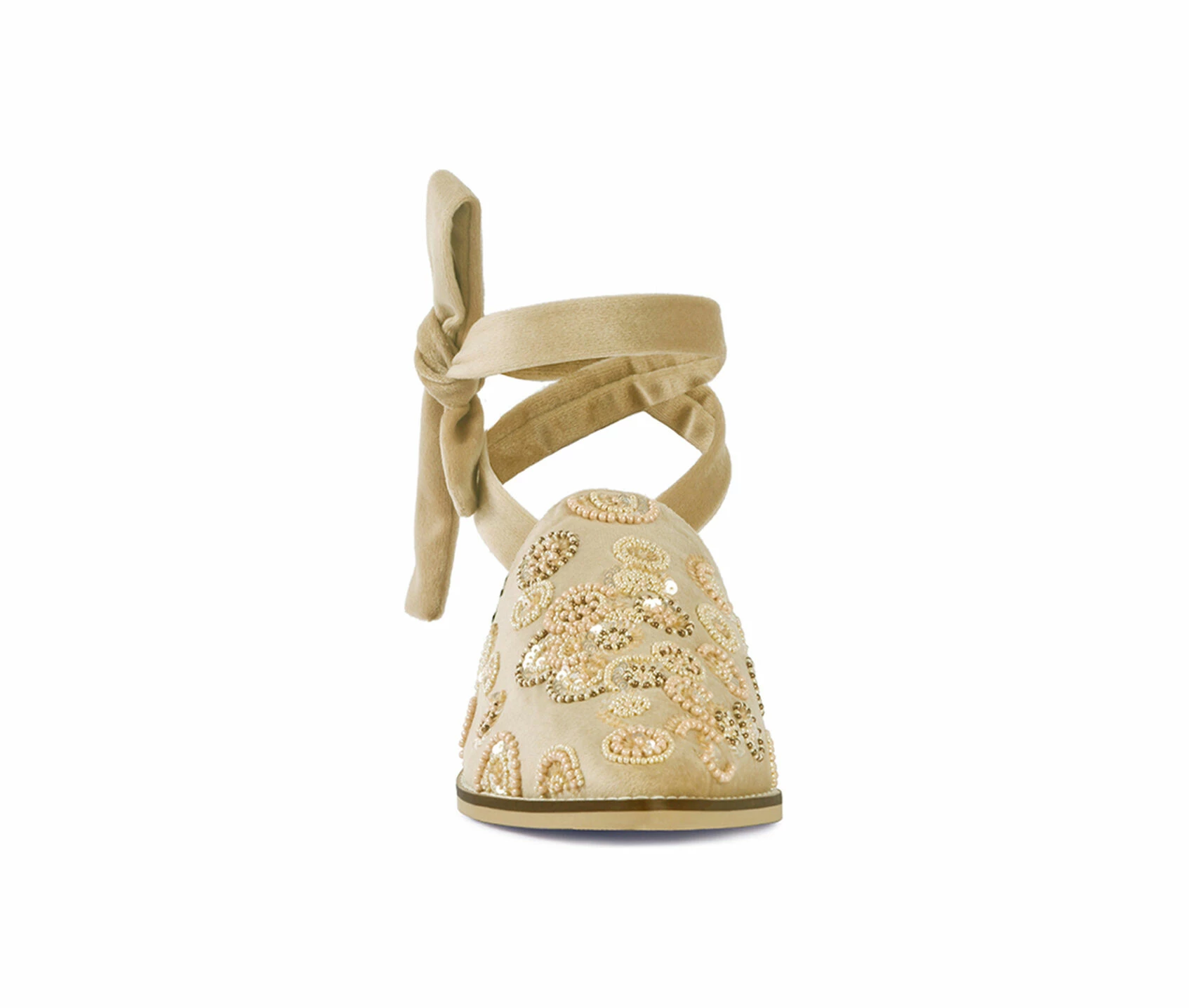 - Handcrafted and hand embroider velvet Mules in Earthy Beige reminds one of the concentric circular patterns adorning the living landscape. The detail of beads, monotone sequins reminds us that life should be celebrated at each phase – just the African way where Ritualistic art inspires an entire mood!