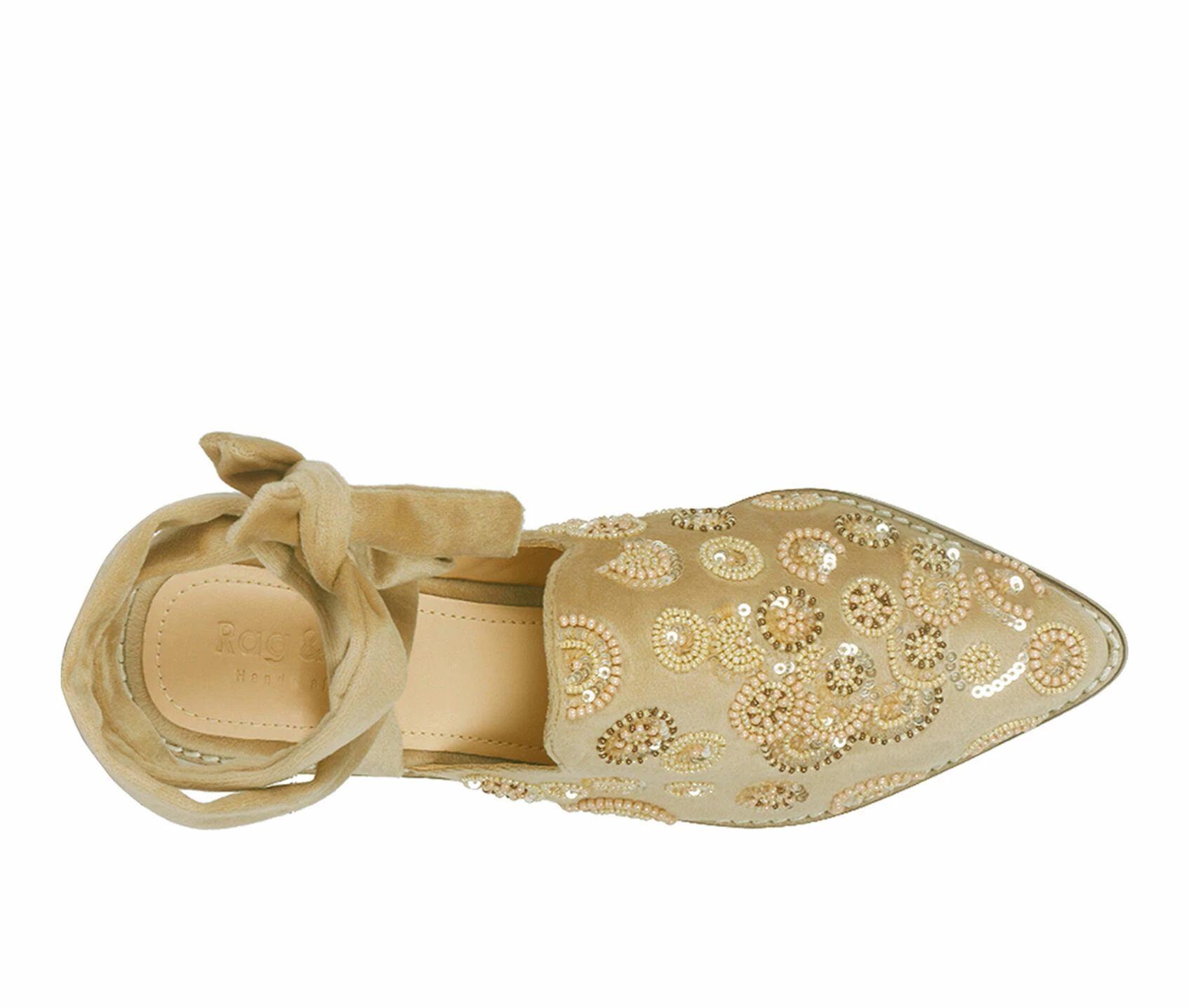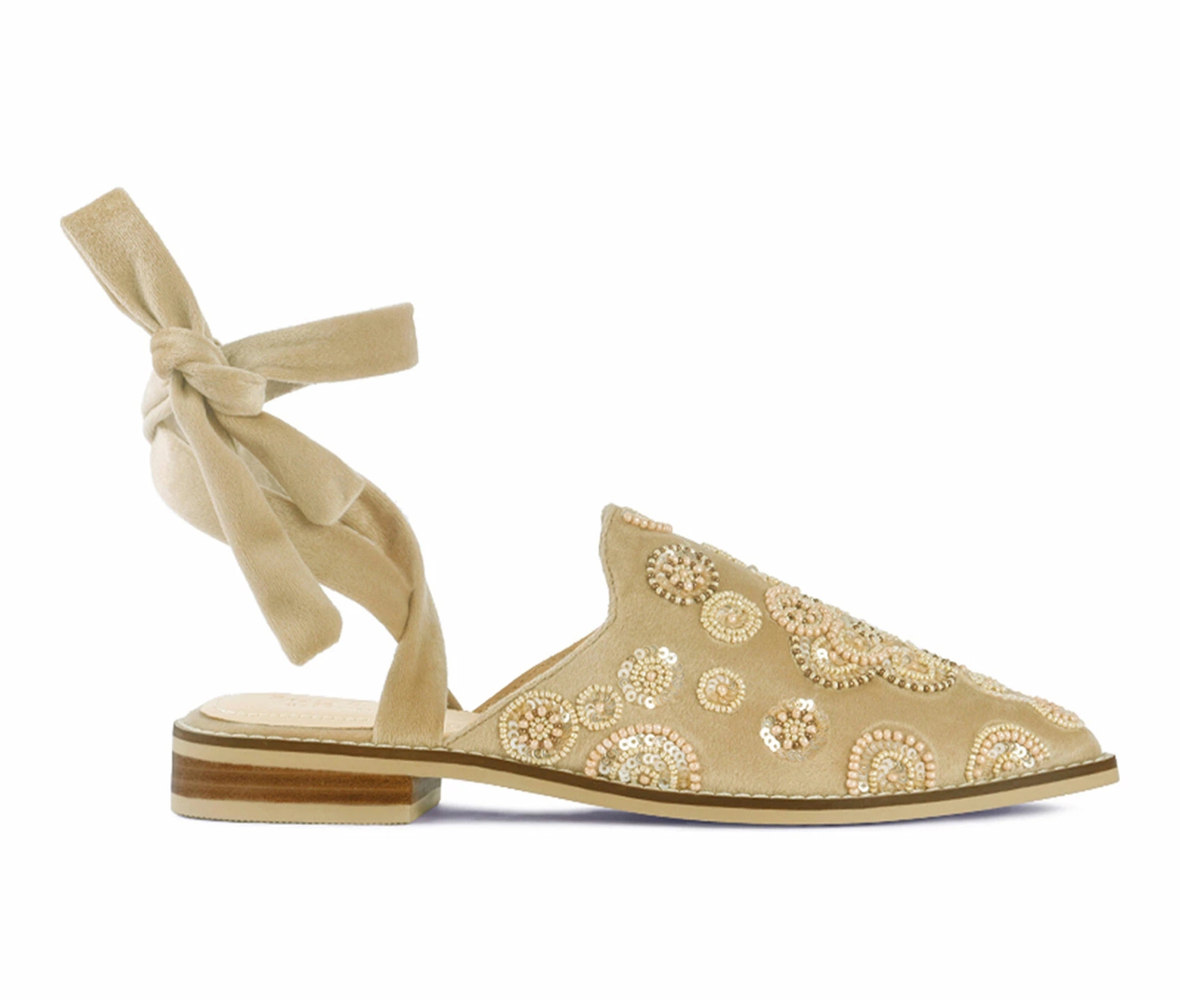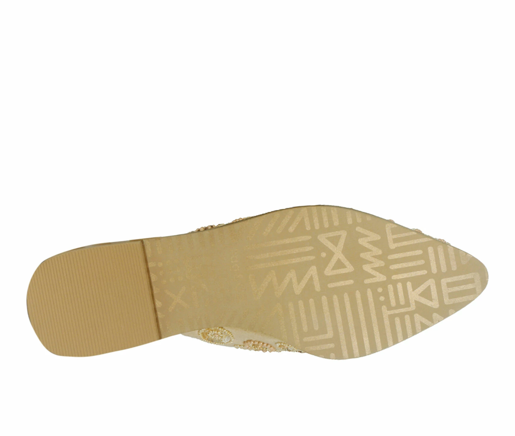 - Handcrafted and hand embroider velvet Mules in Earthy Beige reminds one of the concentric circular patterns adorning the living landscape. The detail of beads, monotone sequins reminds us that life should be celebrated at each phase – just the African way where Ritualistic art inspires an entire mood!