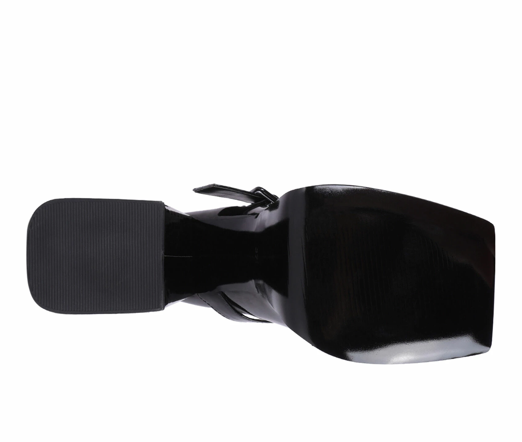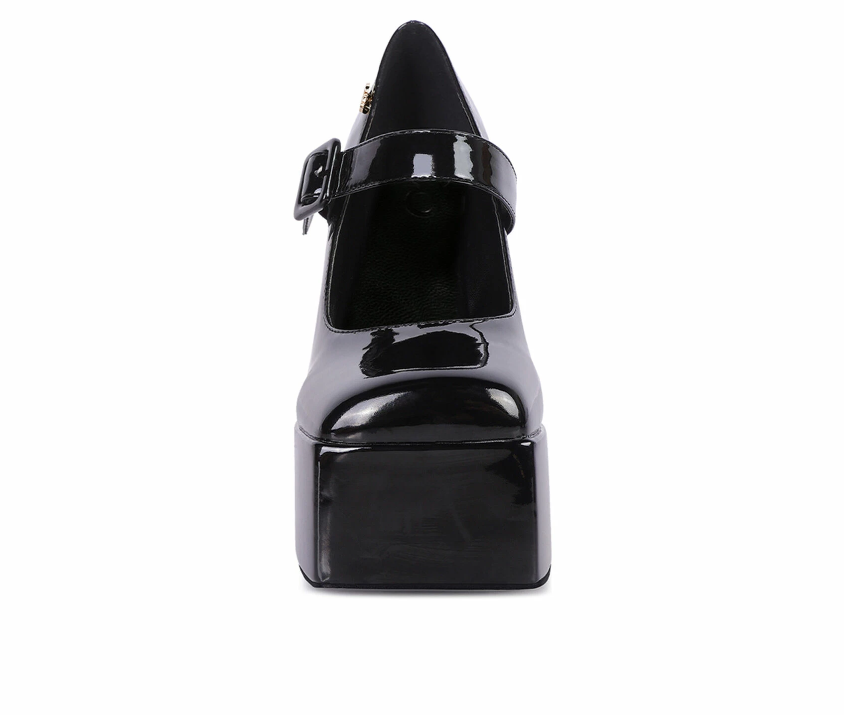 - Badas, bold and blingy: handcrafted in Patent redeveloped PU leather, this pair of ulta high block heel Mary Jane is not for the faint hearted. The sandals are well supported by the chunky high platform which adds to the height and cuts strain from feet. It has monochrome pin buckle fastening. The concave cut block heel makes it a head turner!