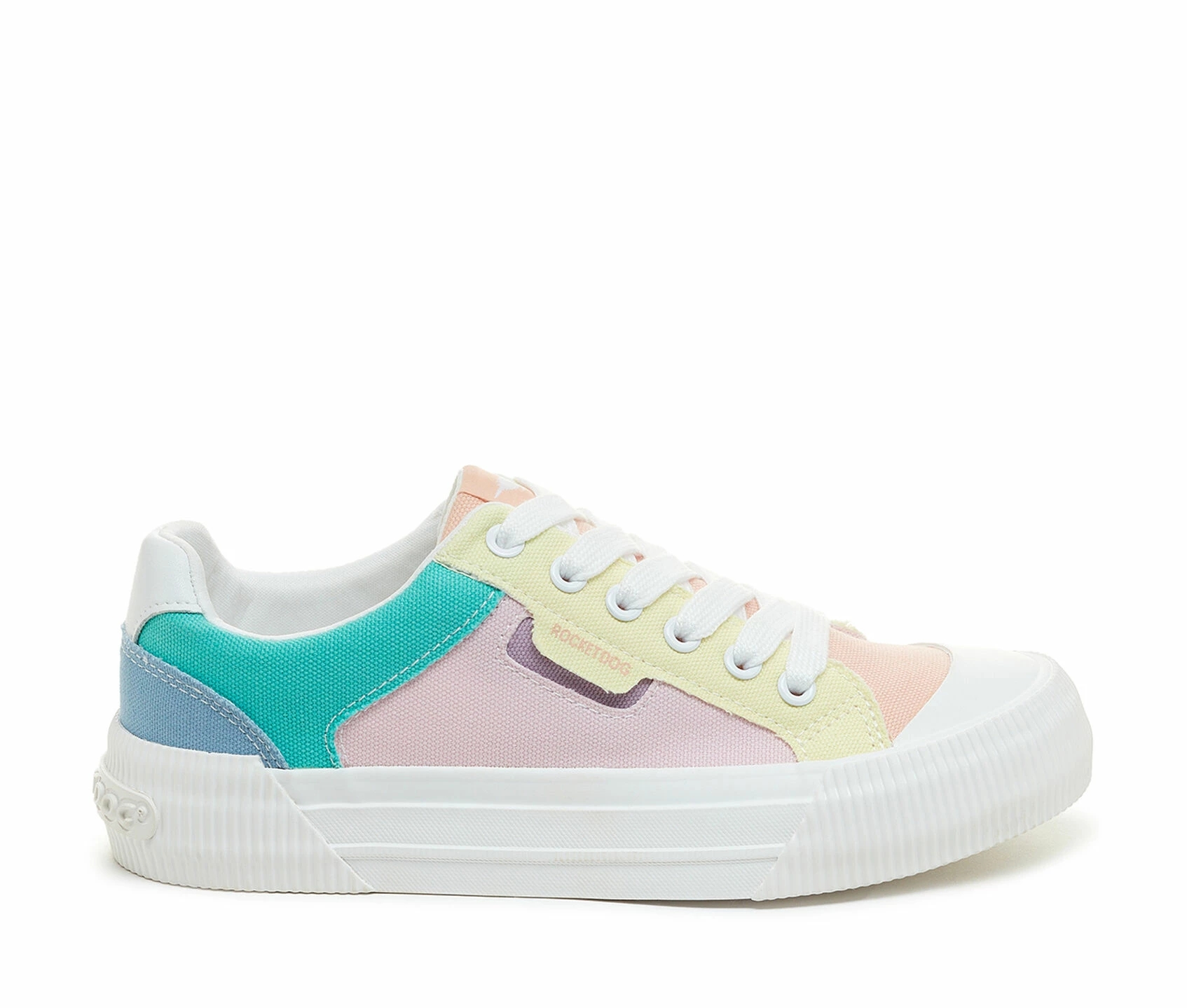 - Low top sneaker with patchwork color block canvas upper, white laces, soft cotton lining, platform sole, rubber toe cap, rounded toe, and plush Foam Comfort Insole.