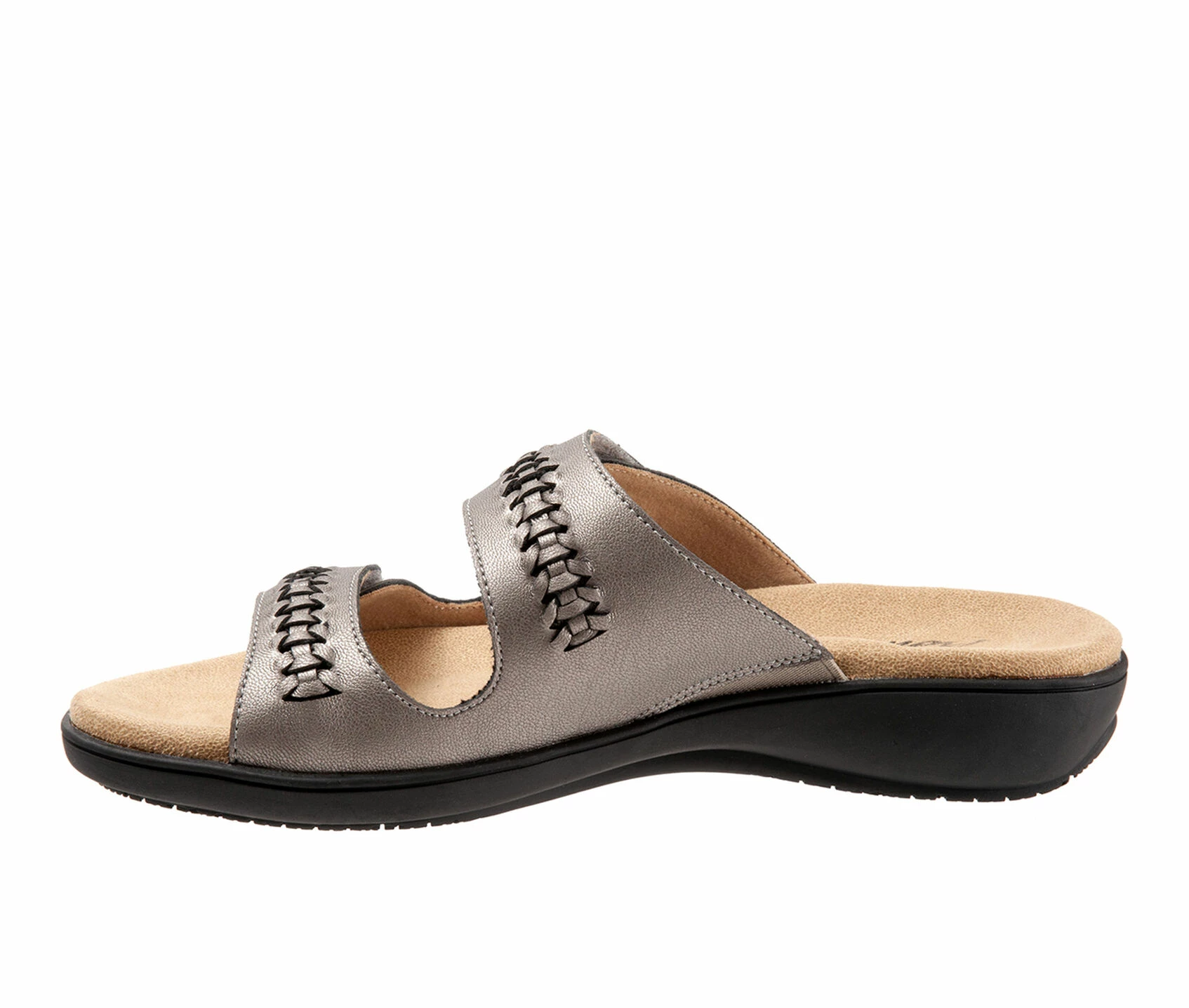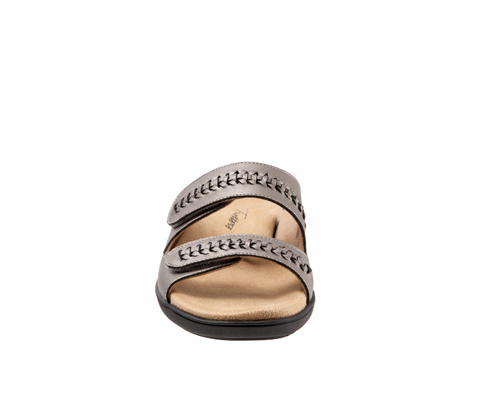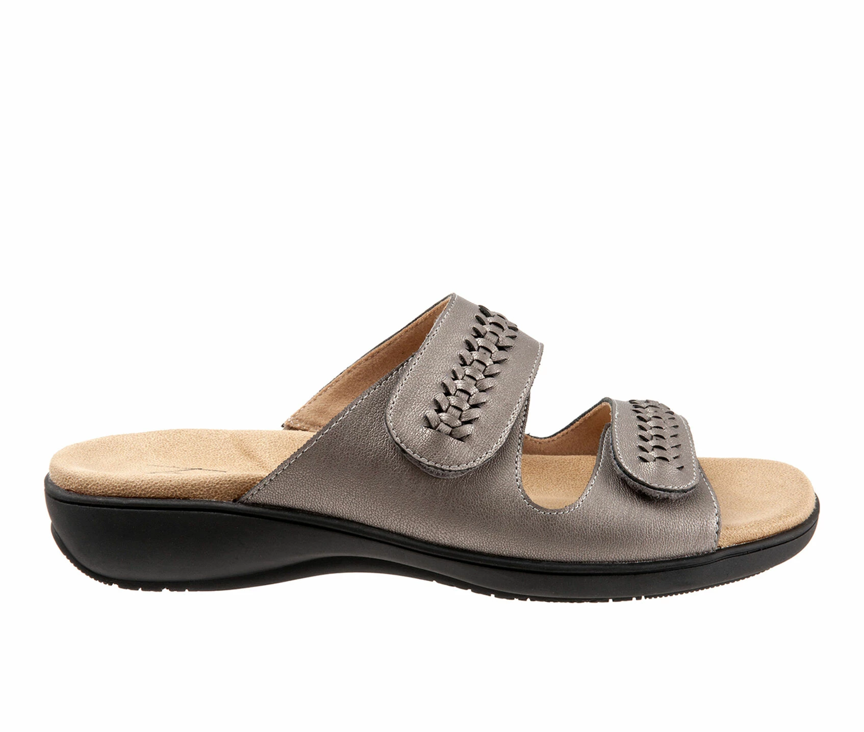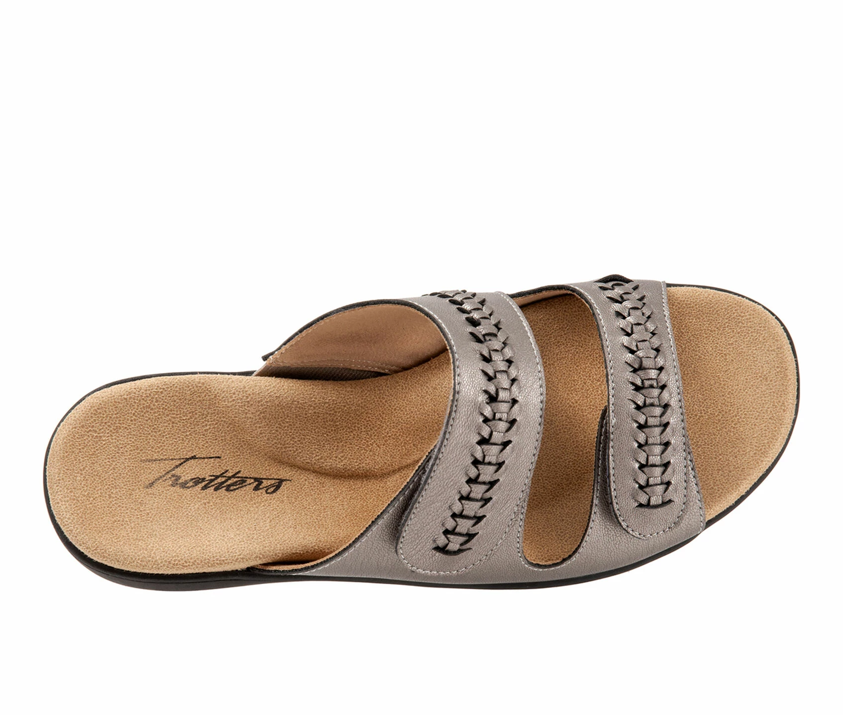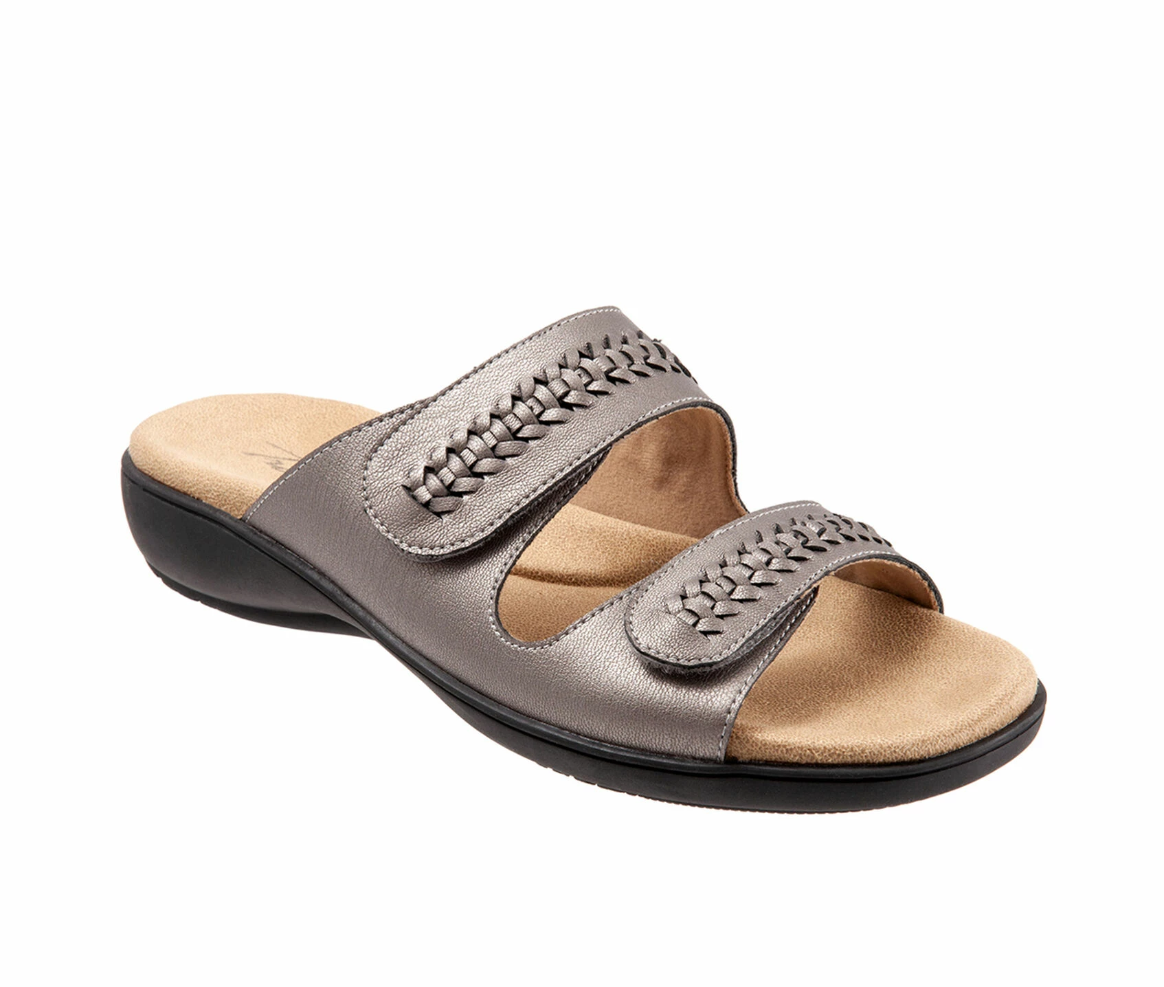 - An easy slide on sandal with an adjustable velcro strap and a woven design.